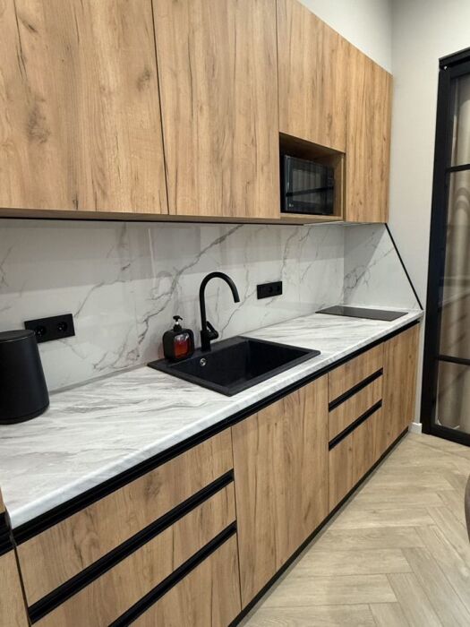 Кухня с необходимой посудой и техникой: холодильник, индукционная плита и микроволновка.