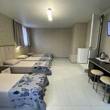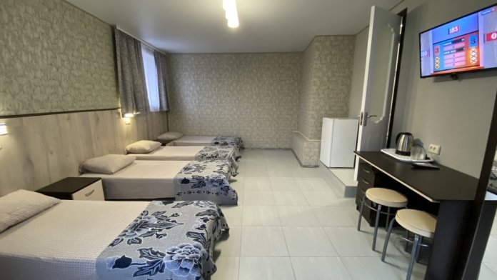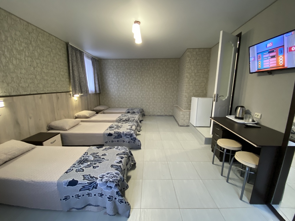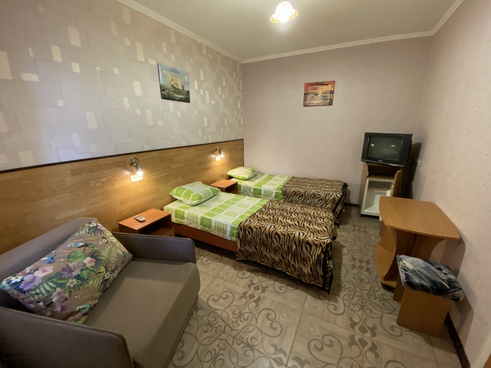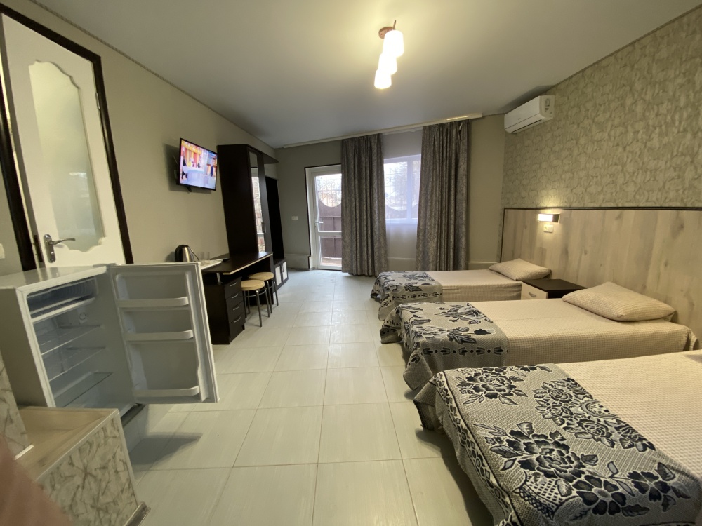 Номер имеет три односпальные кровати, WI-FI, шкаф для одежды, журнальный столик, тумбочки, холодильник, телевизор, кондиционер