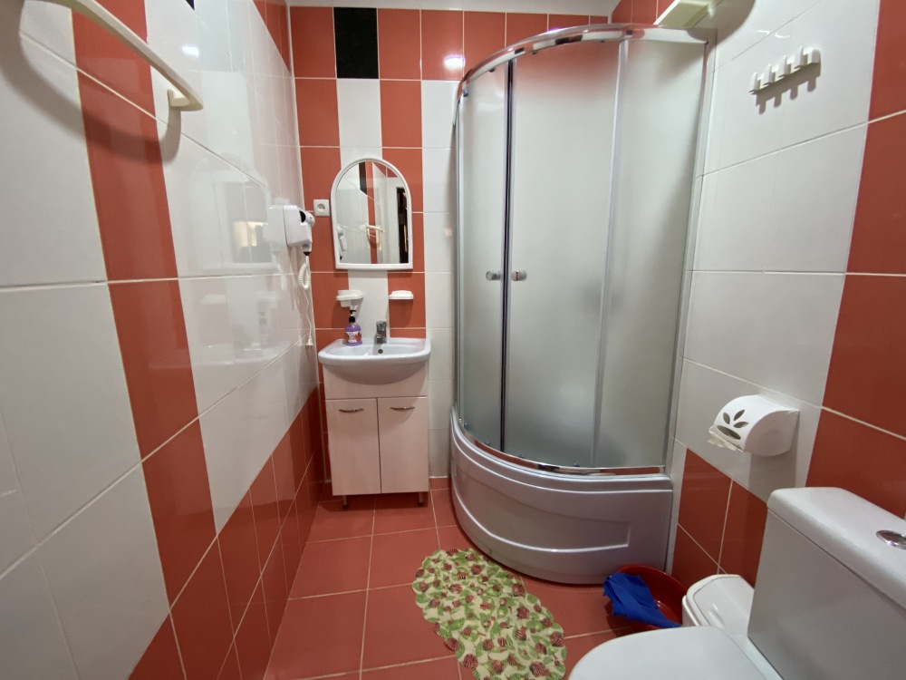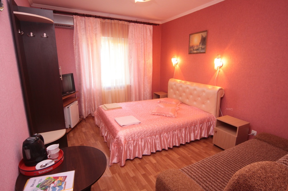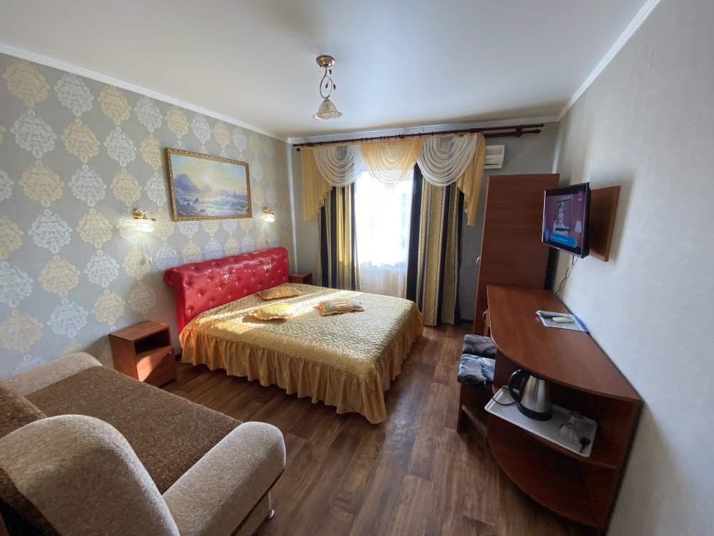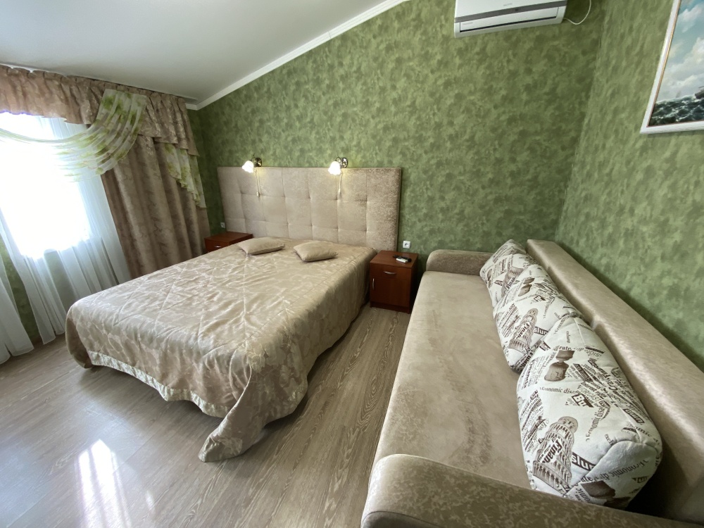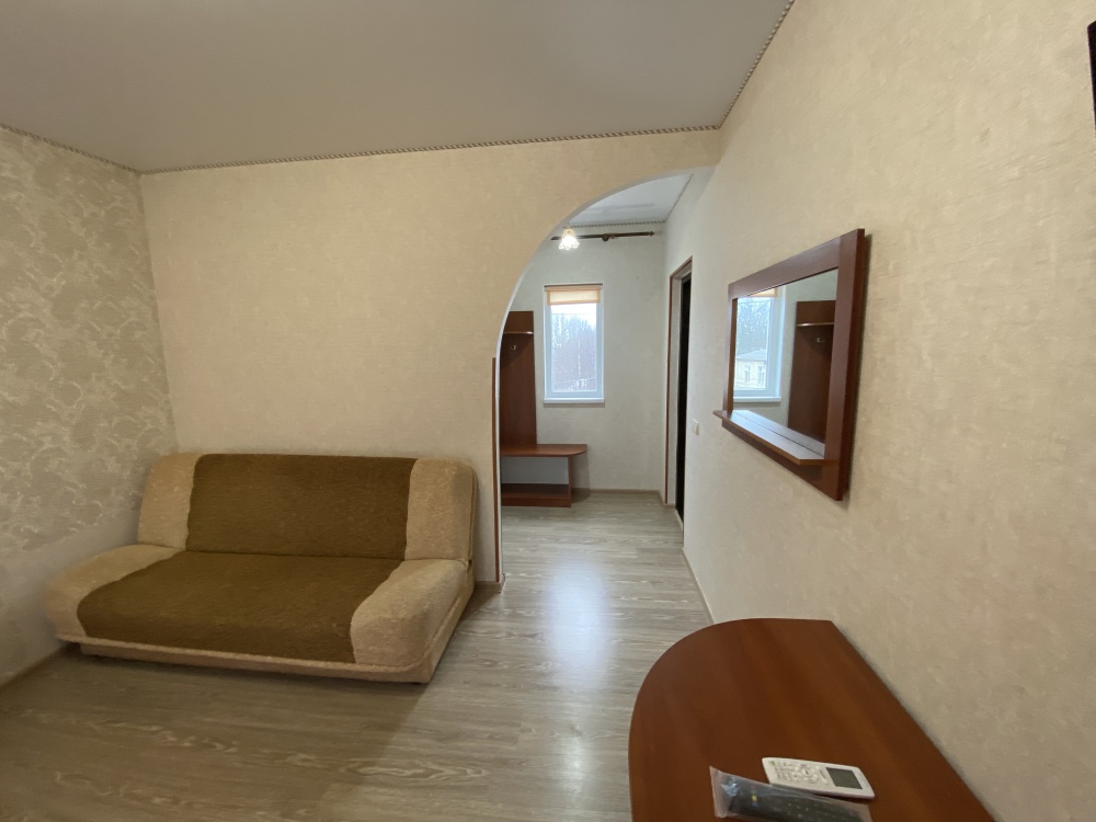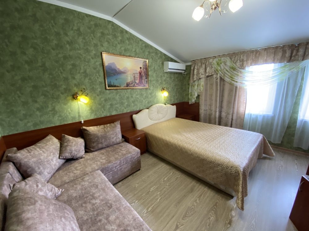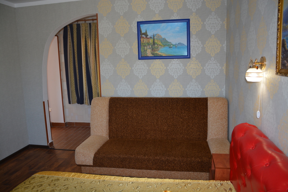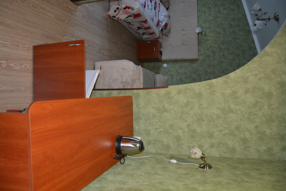 Двухкомнатный номер (гостиная и спальня) Номер укомплектован двуспальной кроватью, раскладным двуспальным диваном, раскладным креслом, WI-FI, шкафом для одежды, журнальным столиком, креслом. Санузел оборудован душевой кабинкой, умывальником, туалетом, феном.