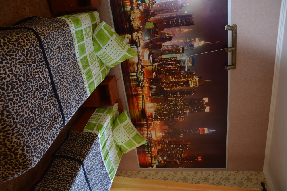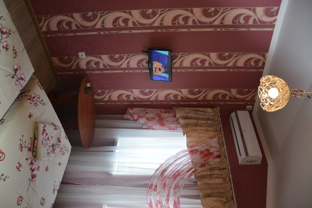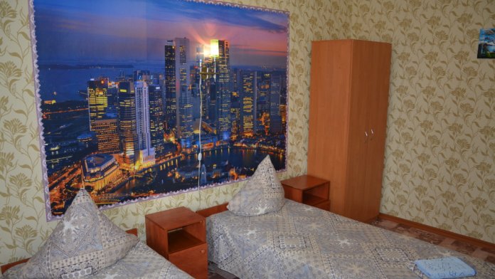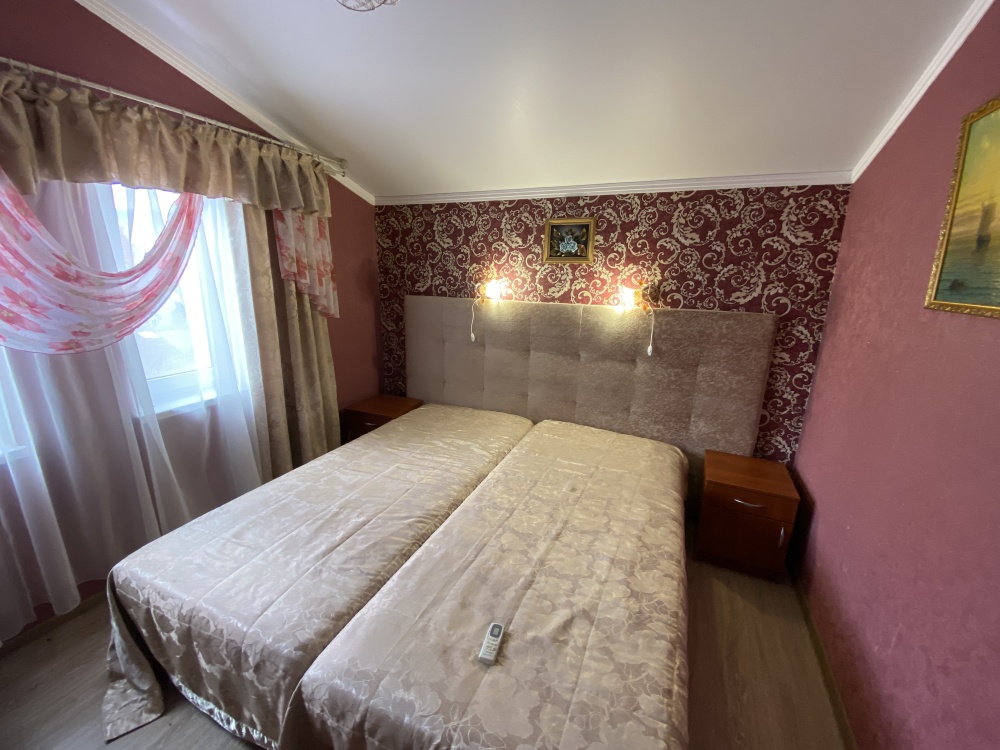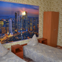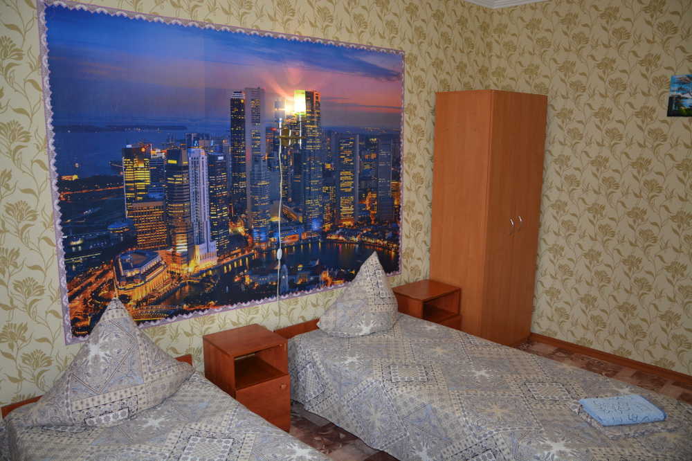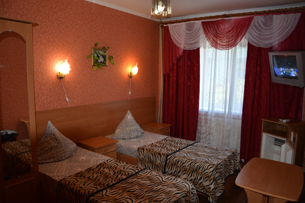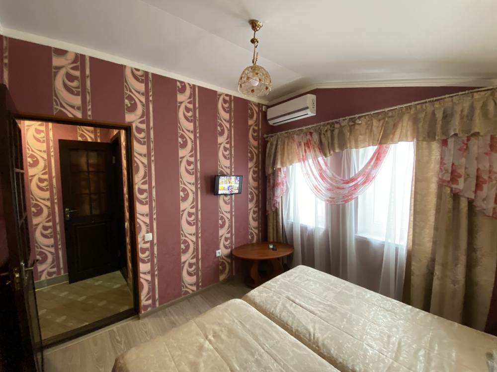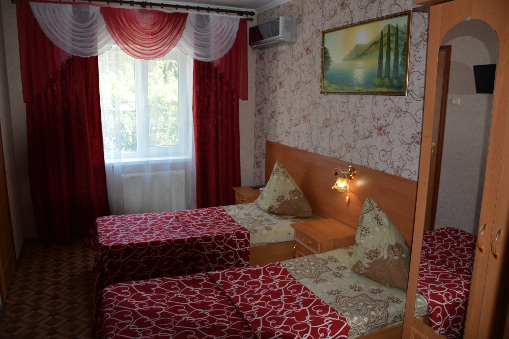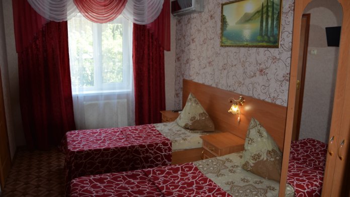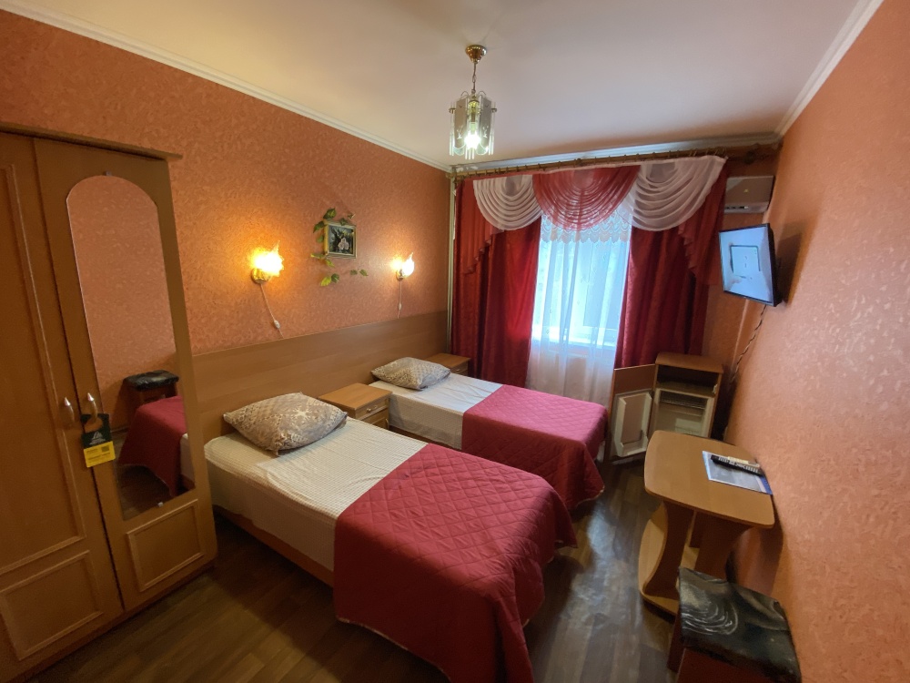 Номер имеет две односпальные кровати, WI-FI, шкаф для одежды, журнальный столик, тумбочки, телевизор, холодильник, кондиционер