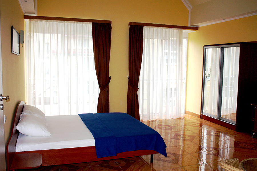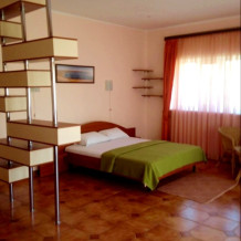 Размещены в трехэтажных корпусах. Один большой номер, при взгляде с террас которого, возникает ощущение присутствия на корабле, бороздящем морские просторы. Номер с видом на море и горы.