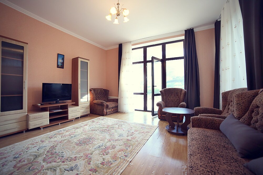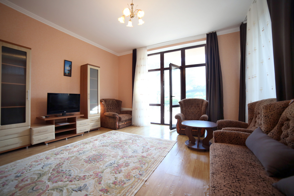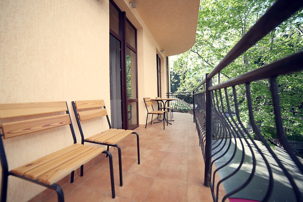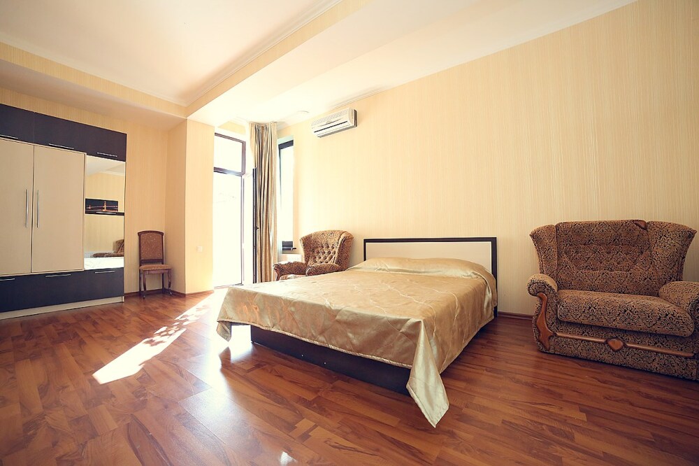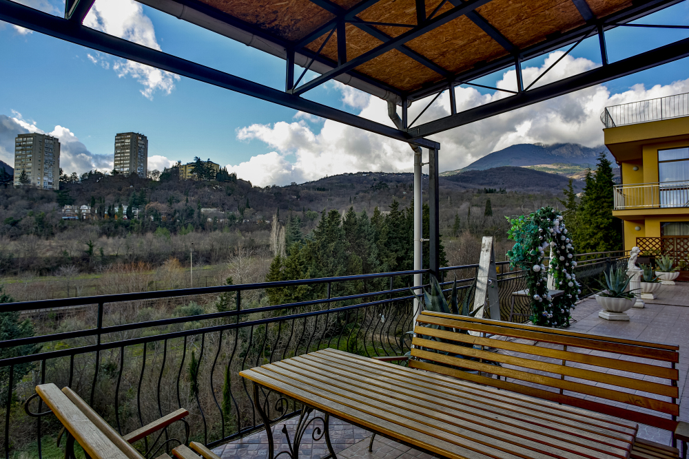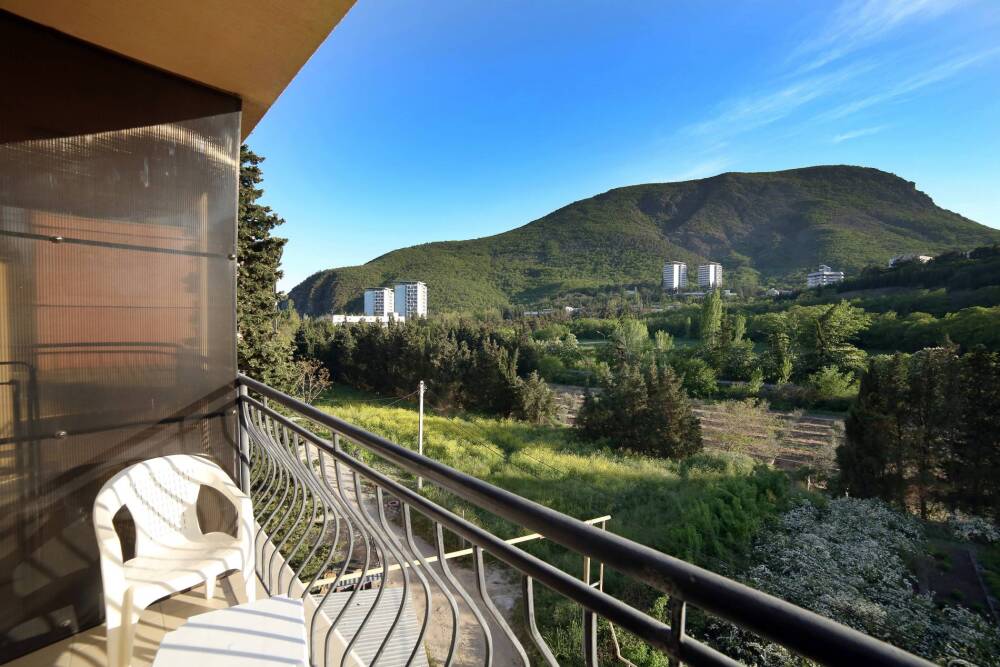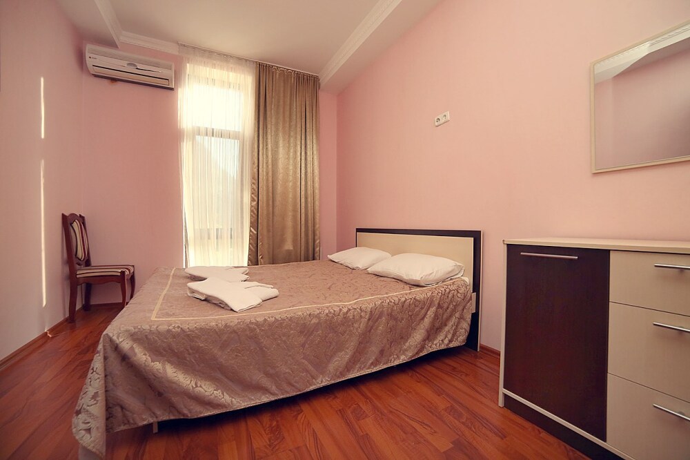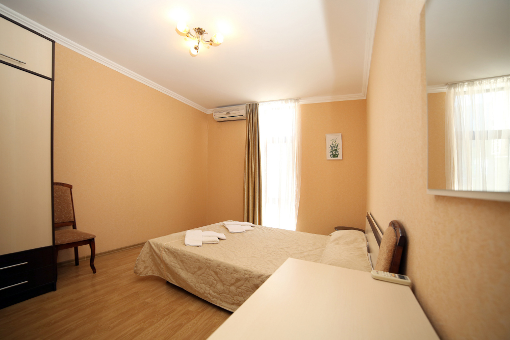 Просторный номер с балконом и видом на Медведь-гору. Или без балкона. В каждом номере кондиционер, телевизор, чайник, холодильник. Удобства в номере. Размещение на двуспальной кровати и раскладном кресле. Один ребёнок до 7 лет — можно без отдельного спального