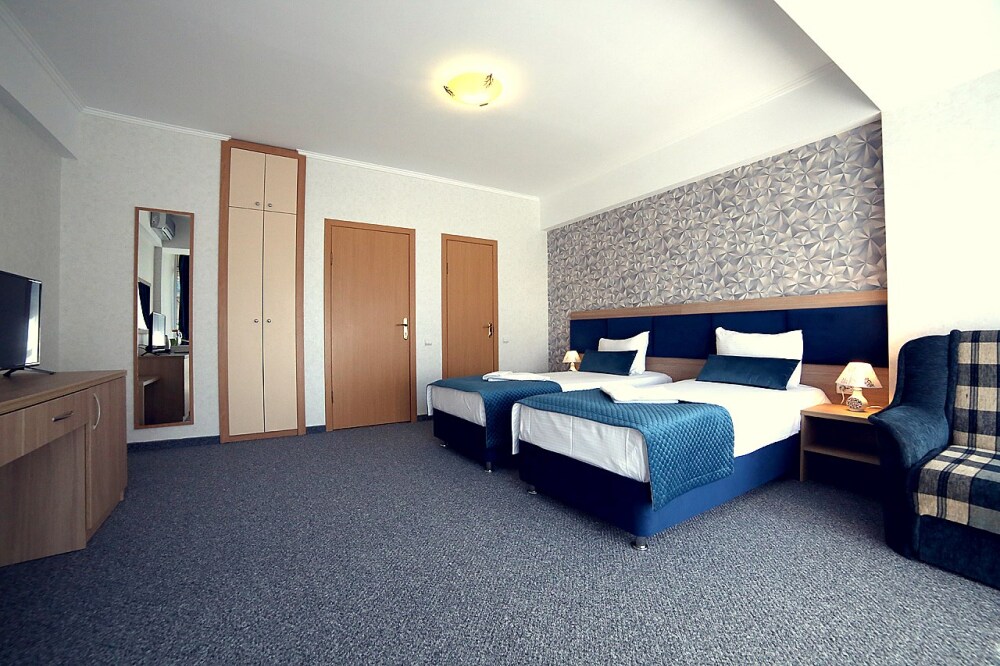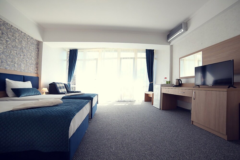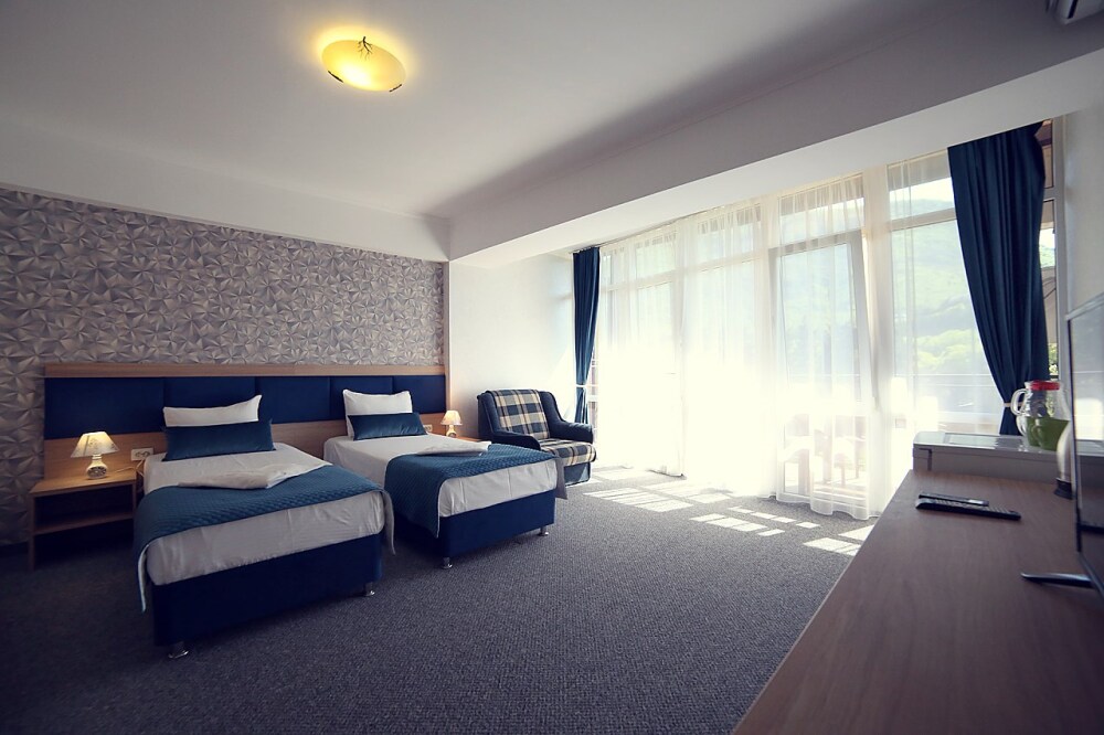 Двухместный номер с балконом и видом на Медведь-гору или на теневую сторону. В номере кондиционер, холодильник, телевизор,wi-fi. Размещение twin или double. Один ребёнок до 7 лет — можно без отдельного спального