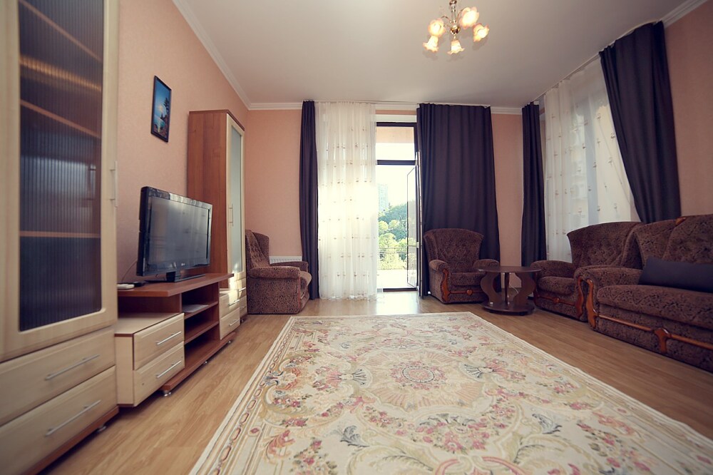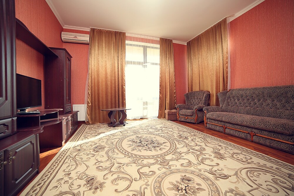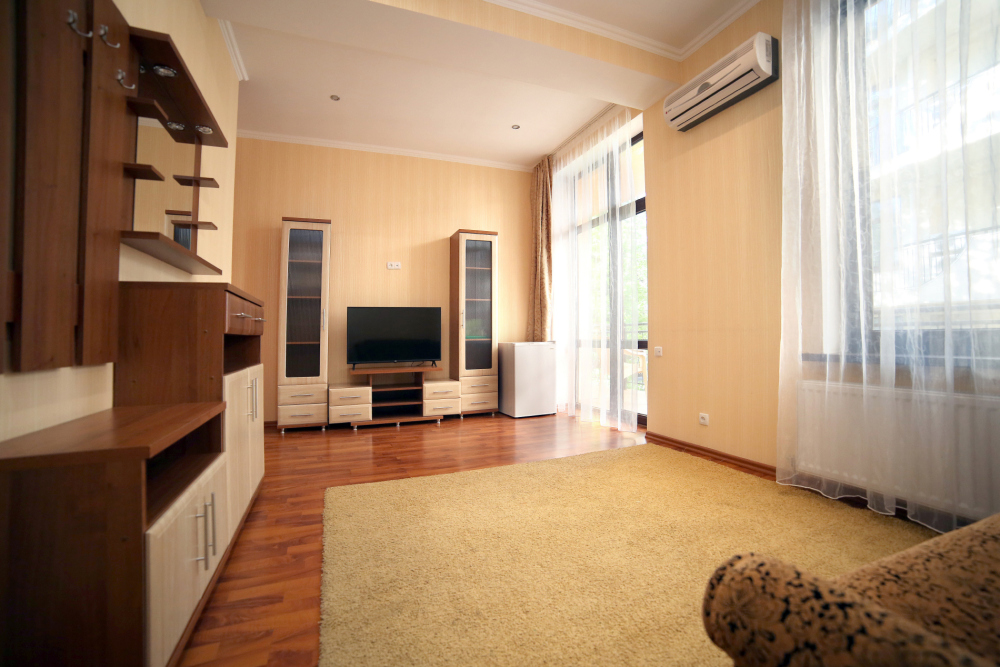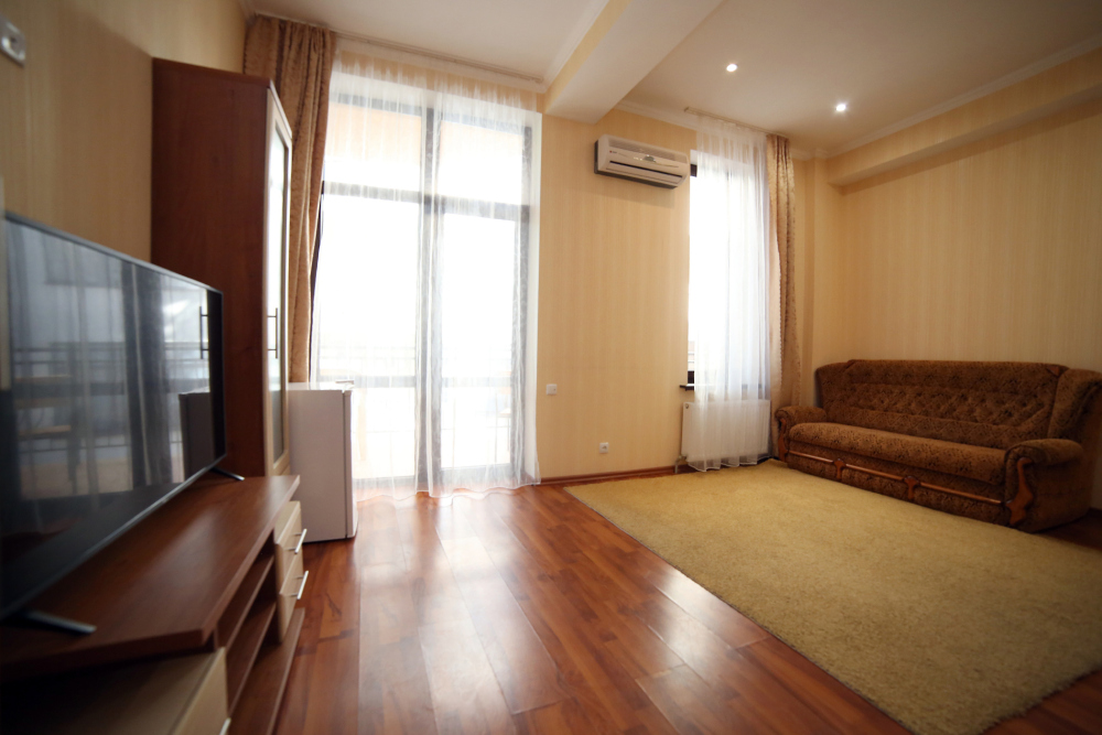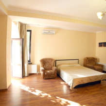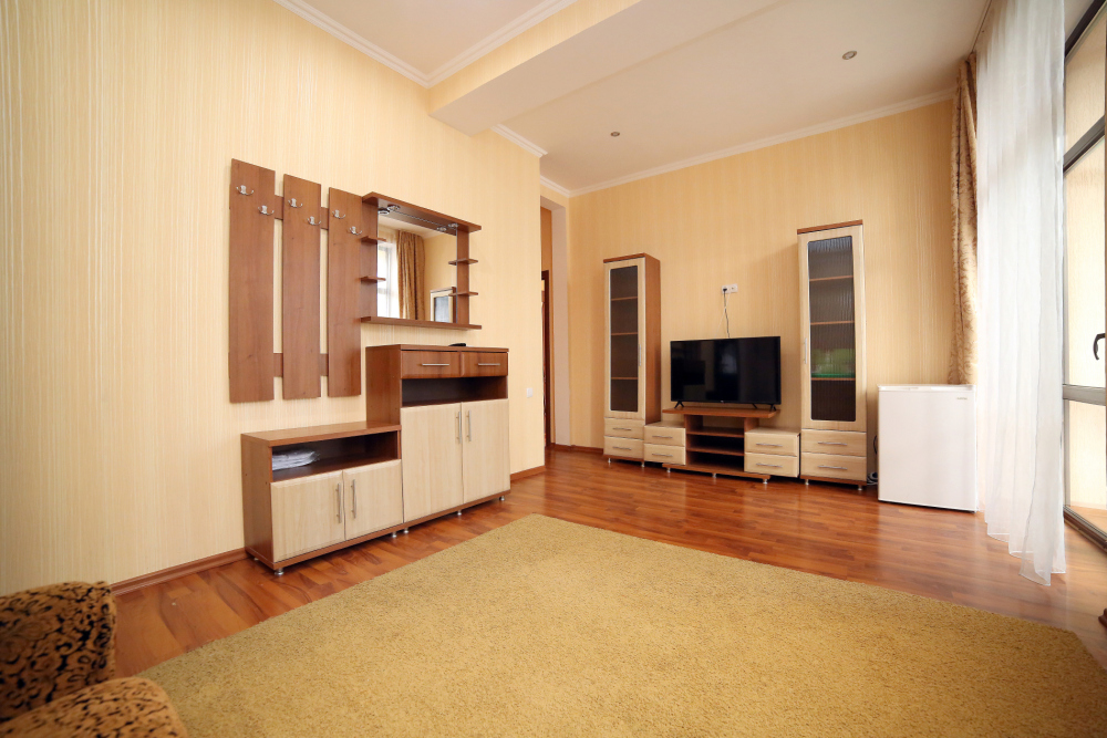 Двухкомнатный номер с собственной ванной комнатой. В номере кондиционер, телевизор, чайник, холодильник. Размещение на двуспальной кровати в одной комнате и раскладном диване в другой. Один ребёнок до 7 лет — можно без отдельного спального