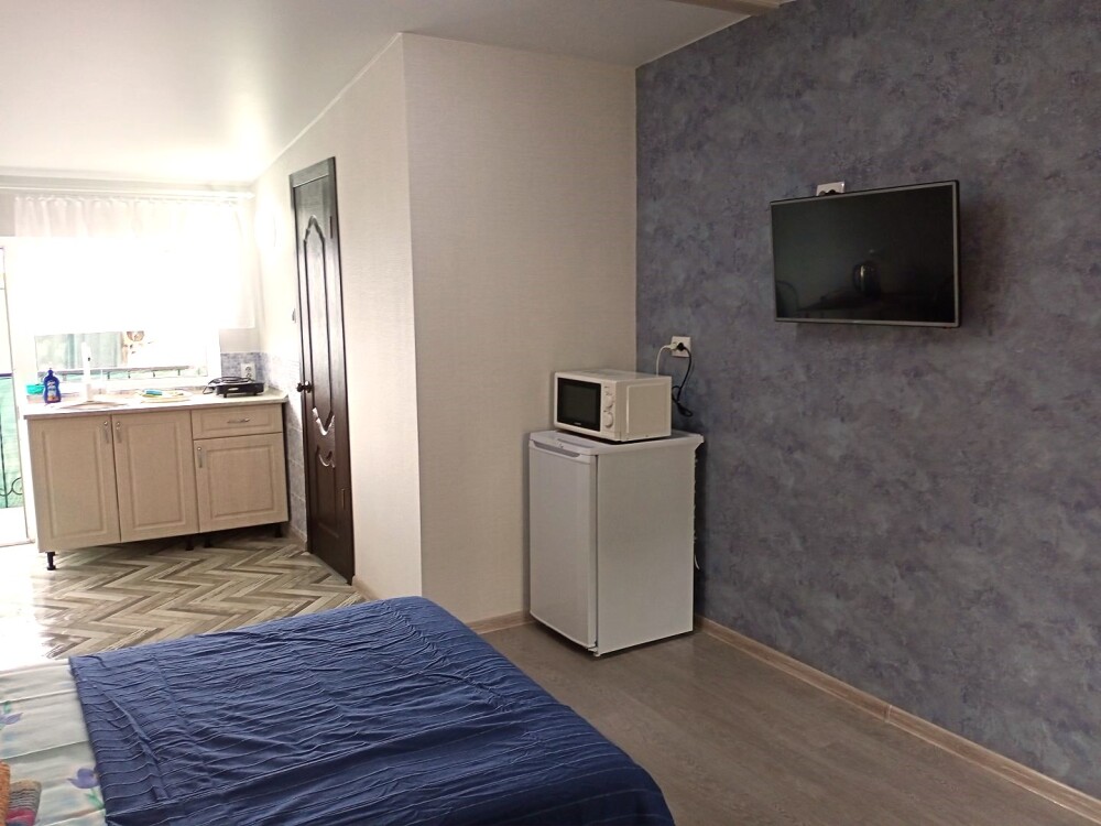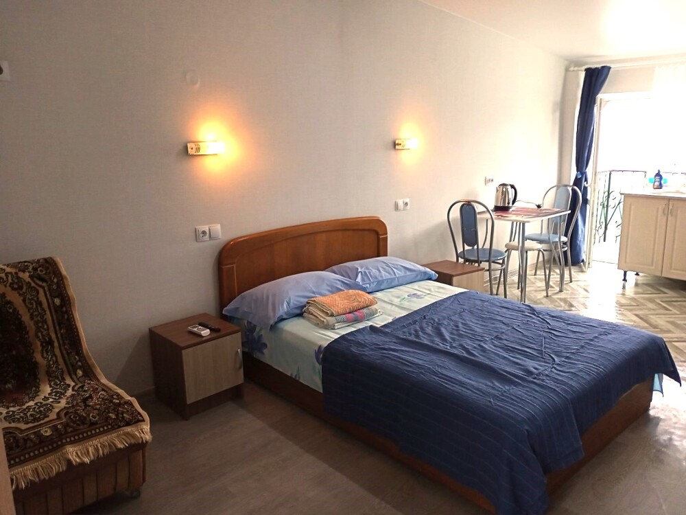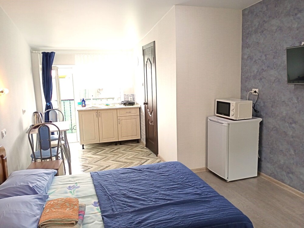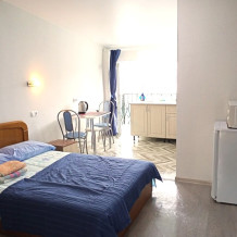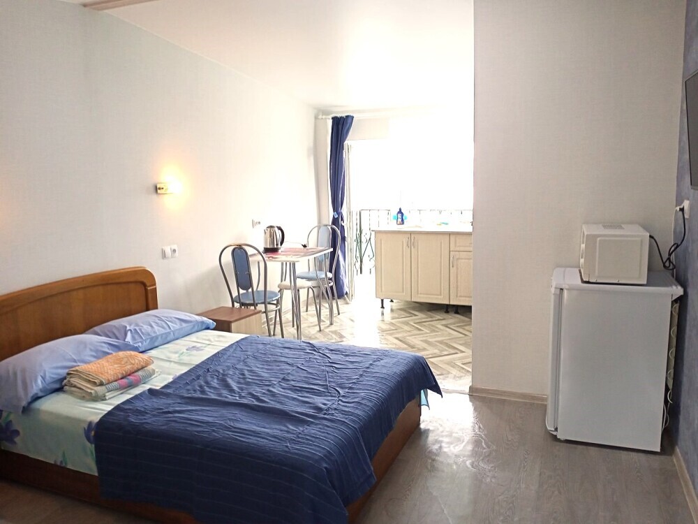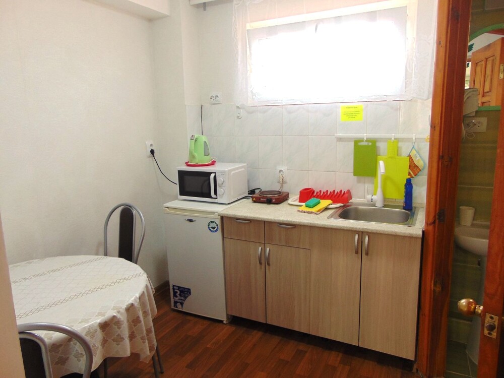 Во всех апартаментах имеется кухня или кухонная зона с набором посуды, эл. чайник, эл. плитка, ТВ, кондиционер, Wi-Fi, холодильник. Индивидуальный санузел с душем и феном.