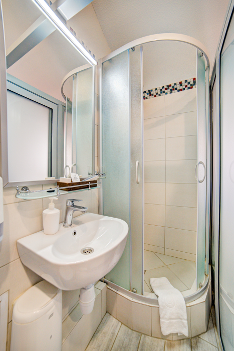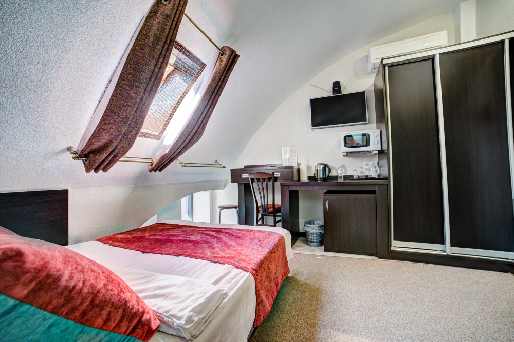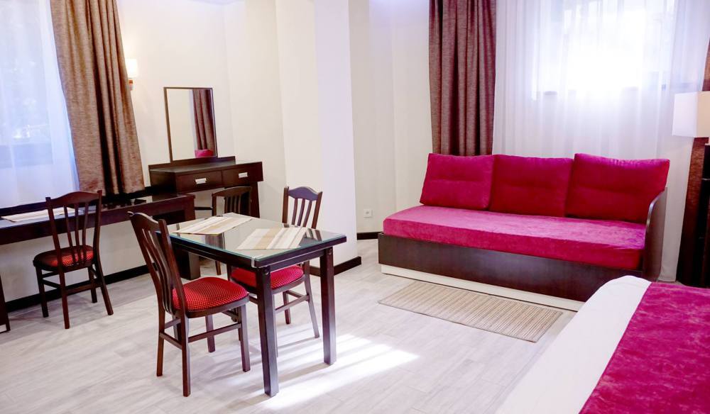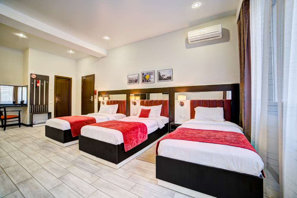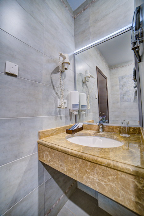 В номере: диван-кровать, шкаф-купе, стул, зеркало, кондиционер, теплые полы (зимой), сейф, телевизор ЖК, мини-холодильник, микроволновая печь, чайник, набор посуды, пляжные полотенца, санузел с душевой кабиной, фен, туалетные принадлежности, тапочки, балкона нет, вид из номера на город, wi-fi, телефонная связь по территории отеля.