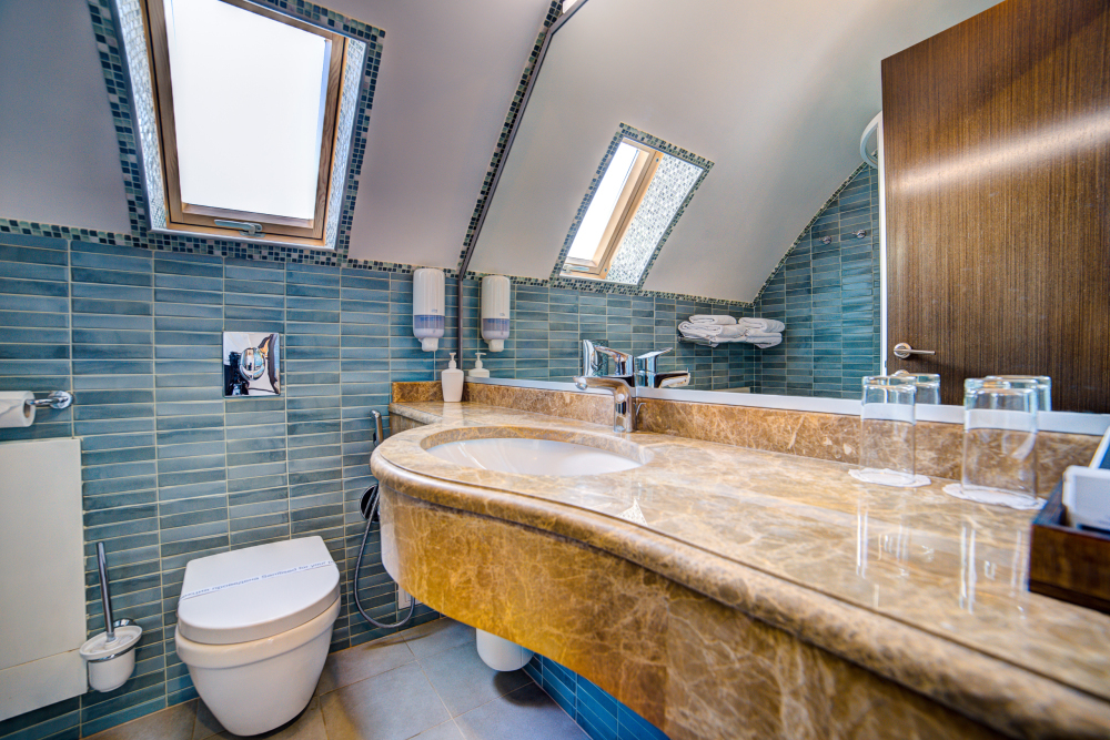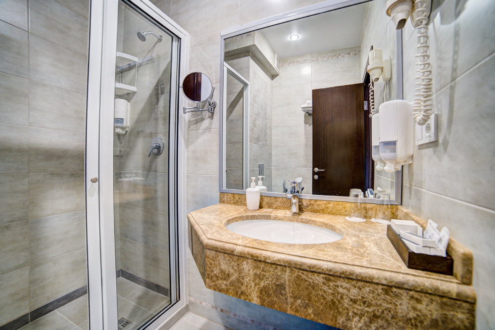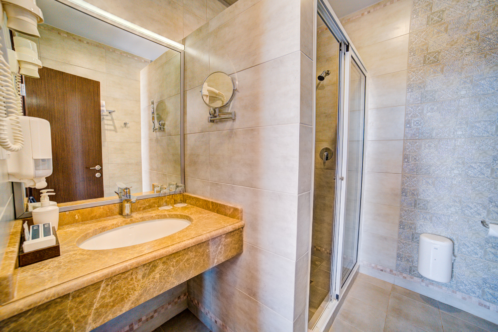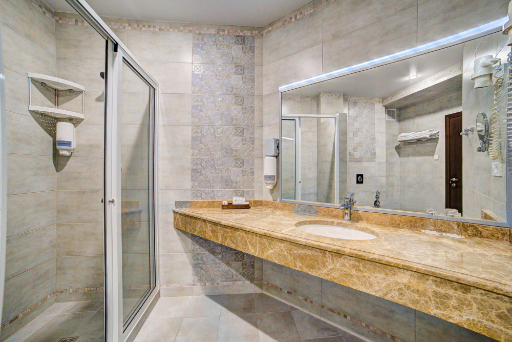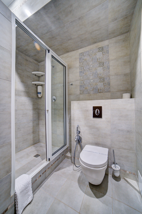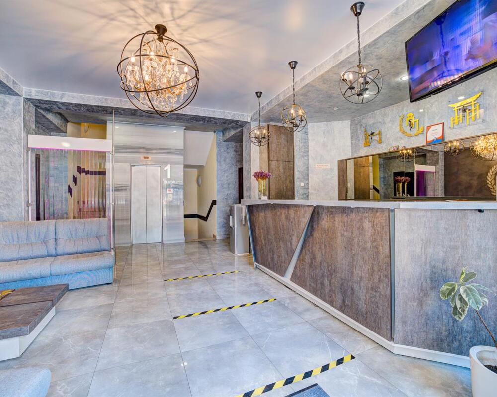 В номере: двуспальная кровать, прикроватные тумбочки, тахта, шкаф-купе, стол, стул, вешалка, зеркало, кондиционер, теплые полы (зимой), сейф, телевизор ЖК, мини-холодильник, электрочайник, микроволновая печь, набор посуды, пляжные полотенца, санузел с душевой кабиной, фен, туалетные принадлежности, тапочки, балкона нет, вид из номера на город, wi-fi, телефонная связь по территории отеля.