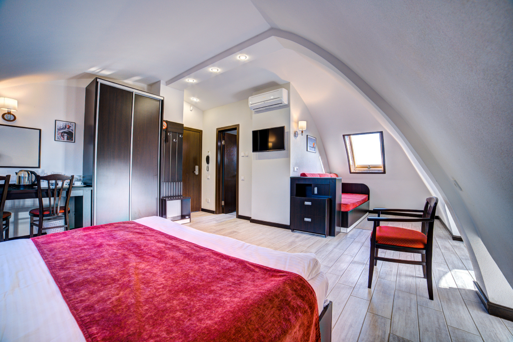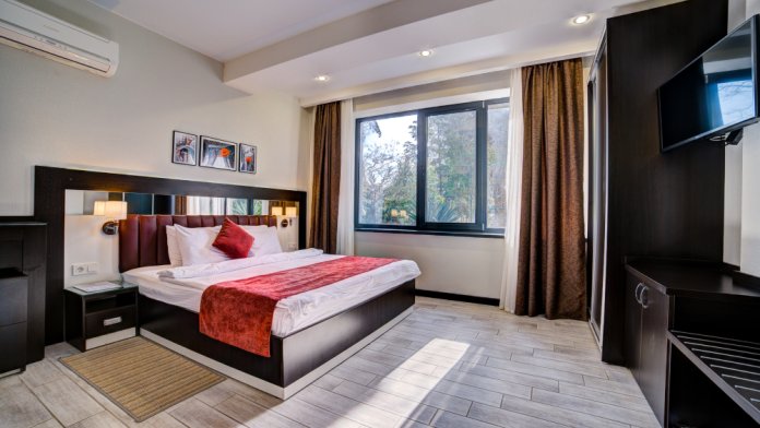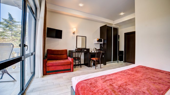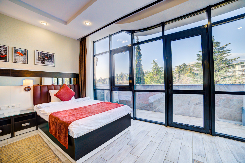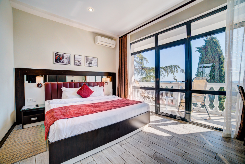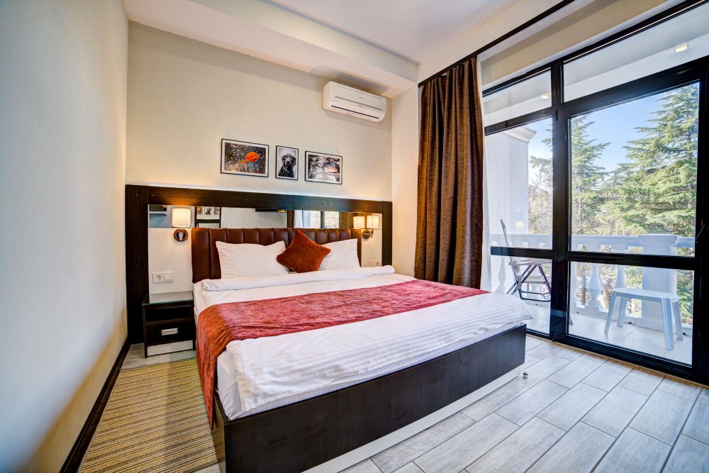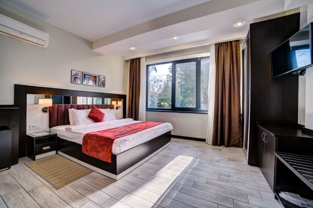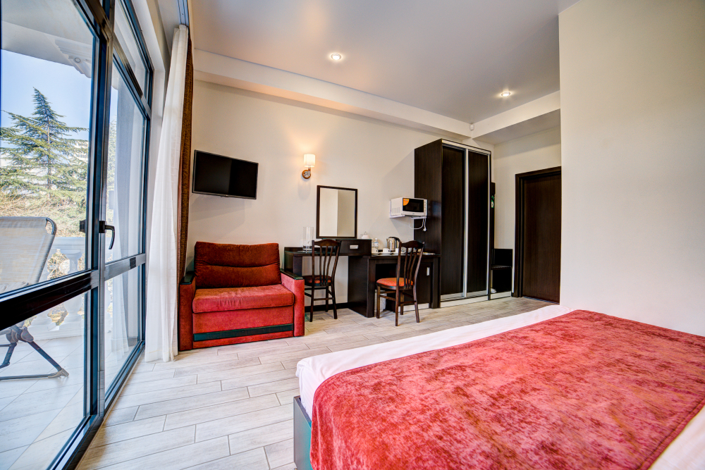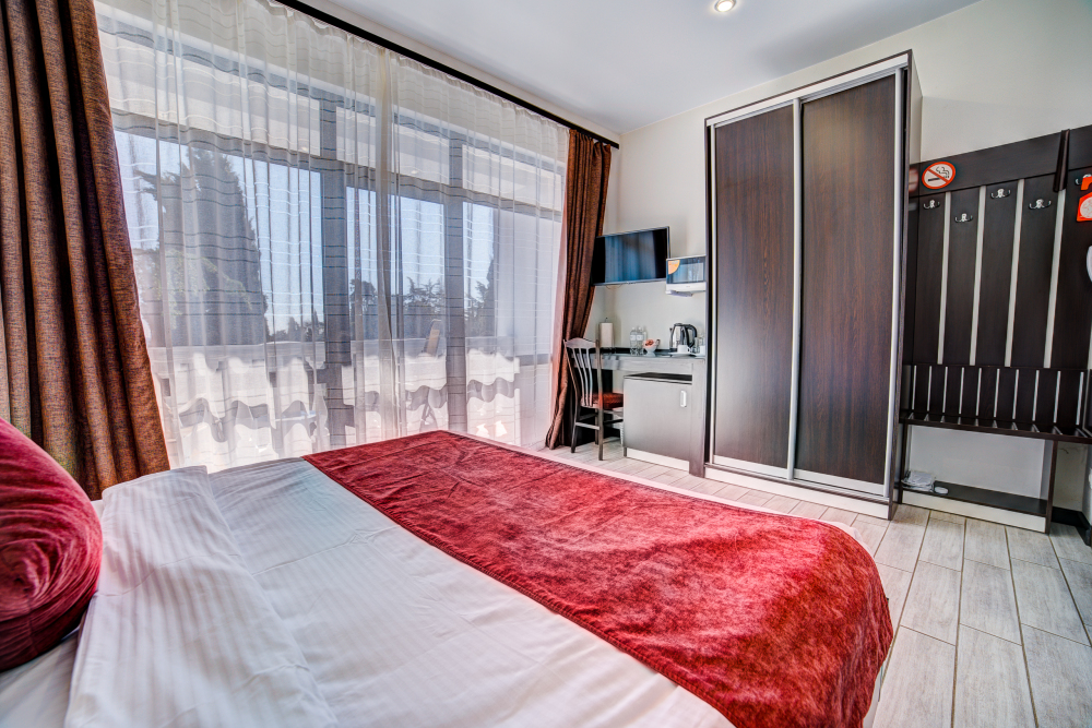 В номере: двуспальная кровать, прикроватные тумбочки, кресло-кровать, шкаф-купе, стол, стул, вешалка, зеркало, кондиционер, теплые полы (зимой), сейф, телевизор ЖК, мини-холодильник, электрочайник, микроволновая печь, набор посуды, пляжные полотенца, санузел с душевой кабиной, фен, туалетные принадлежности, тапочки, балкон оборудован мебелью, вид из номера на город и парк, wi-fi, телефонная связь по территории отеля.