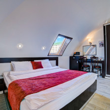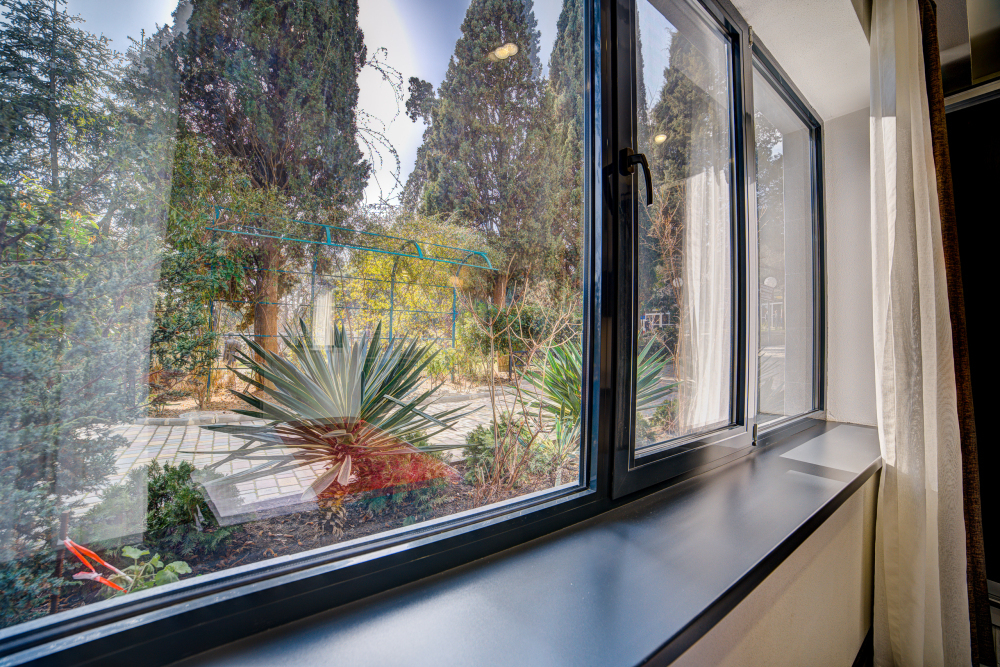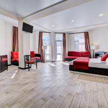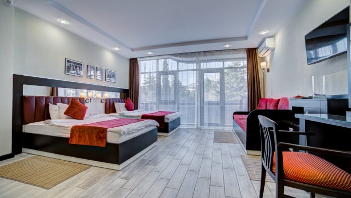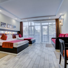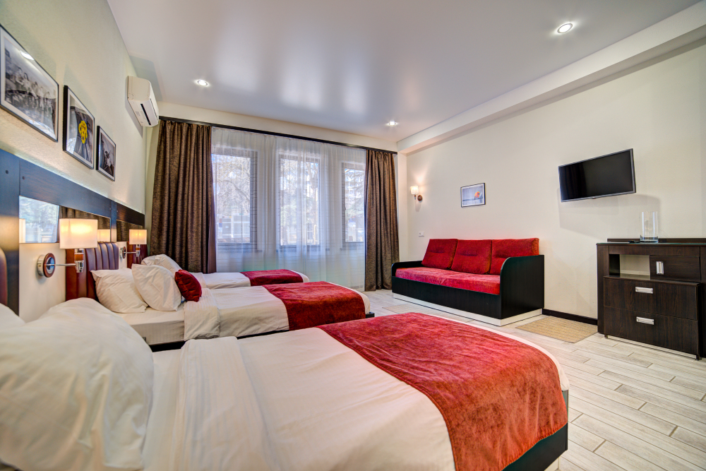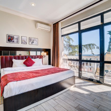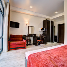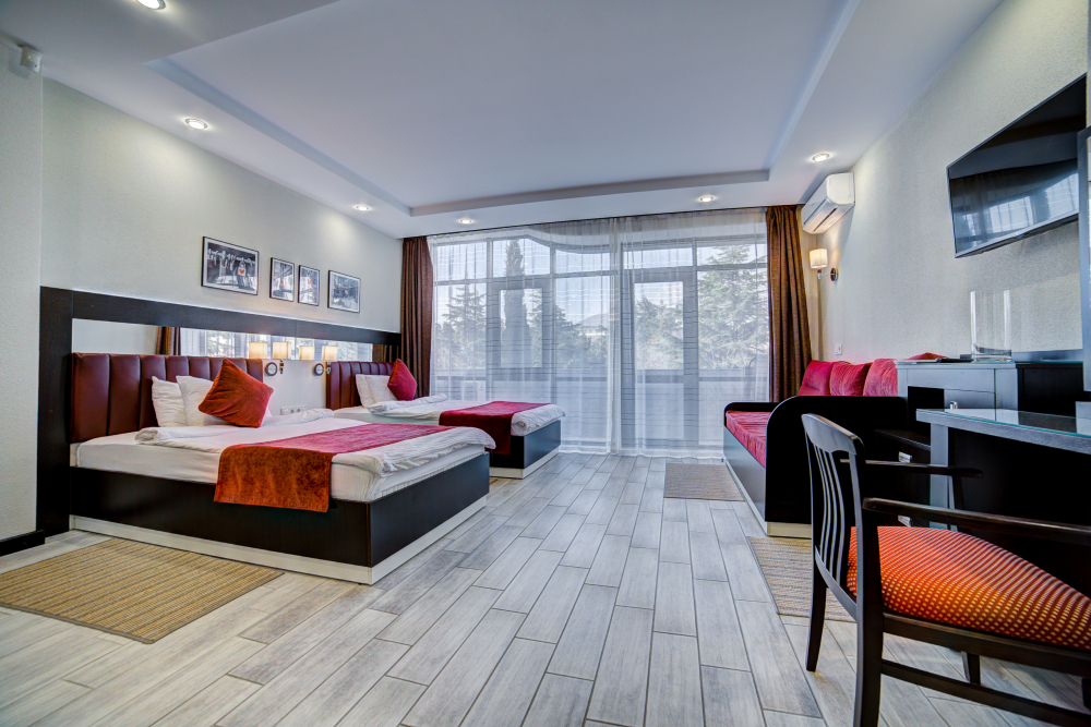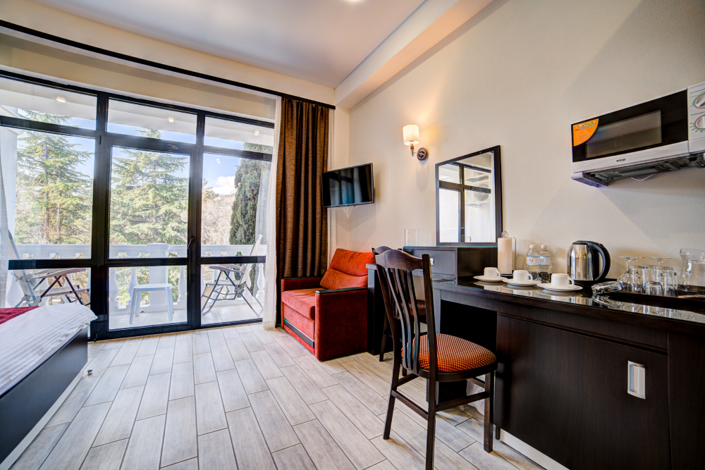 В номере: 2 полуторные кровати, прикроватные тумбочки, тахта, шкаф-купе, стол, стулья, кухонный уголок, вешалка, зеркало, кондиционер, теплые полы (зимой), сейф, телевизор ЖК, мини-холодильник, микроволновая печь, чайник, набор посуды, пляжные полотенца, санузел с душевой кабиной, фен, туалетные принадлежности, тапочки, балкон оборудован мебелью, вид из номера на город и парк, wi-fi, телефонная связь по территории отеля.