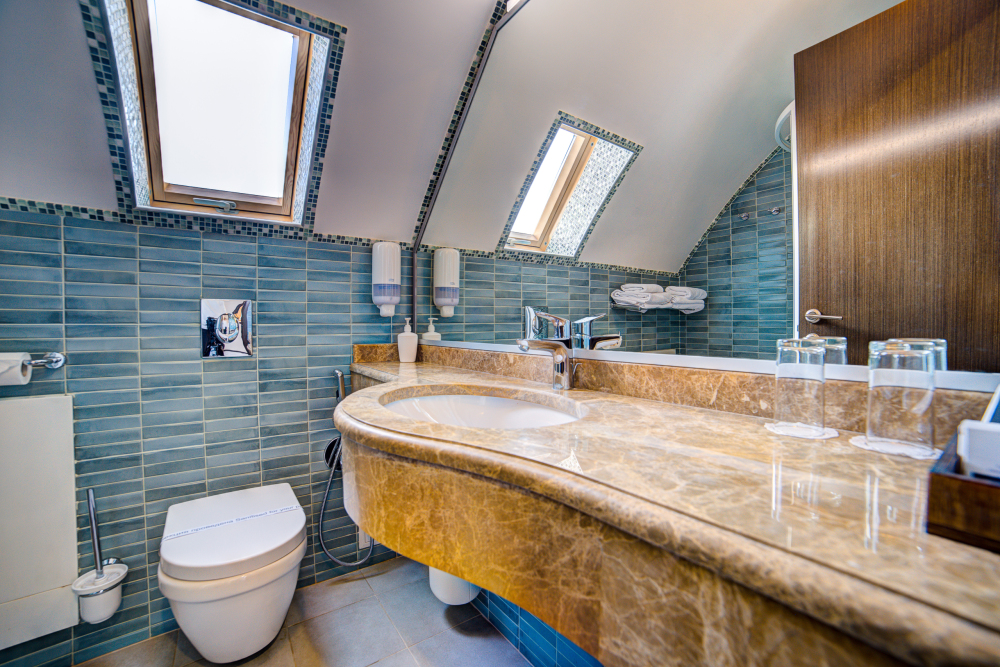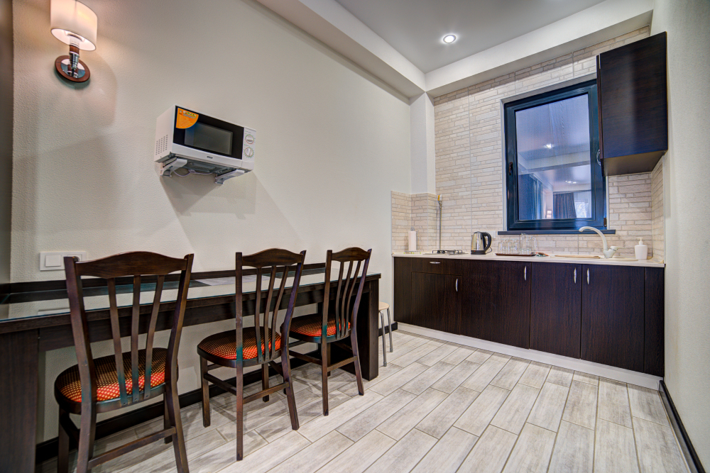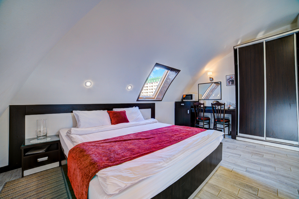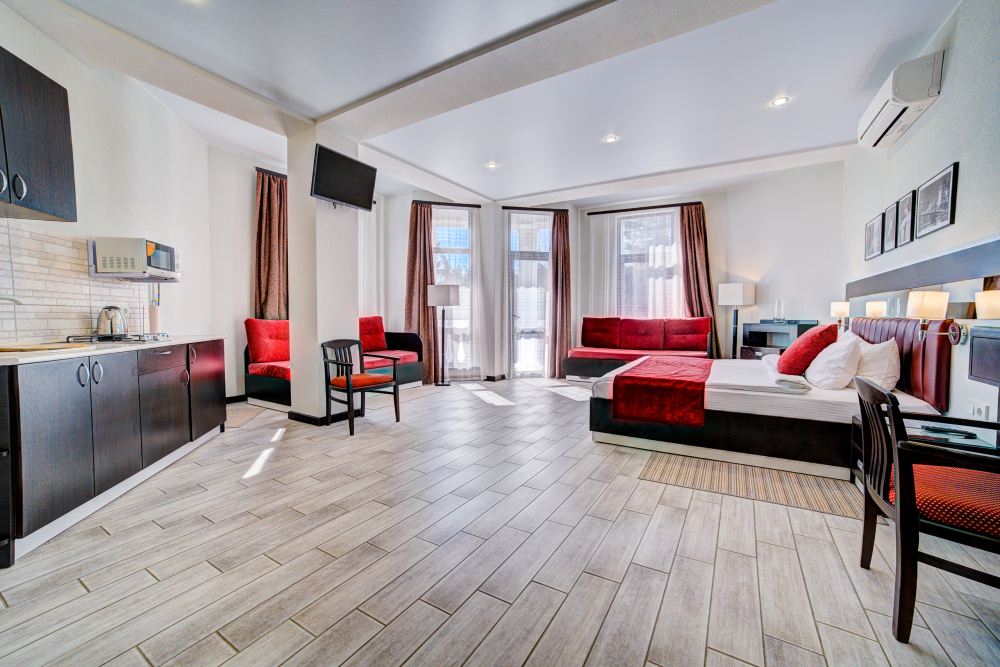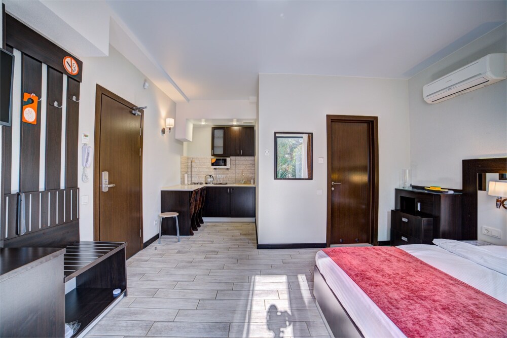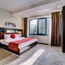 В номере: двуспальная кровать, прикроватные тумбочки, шкаф-купе, стол, стулья, кухонный уголок, вешалка, зеркало, кондиционер, теплые полы (зимой), сейф, телевизор ЖК, мини-холодильник, микроволновая печь, чайник, набор посуды, пляжные полотенца, санузел с душевой кабиной, фен, туалетные принадлежности, тапочки, балкона нет, вид из номера на город и парк, wi-fi, телефонная связь по территории отеля.