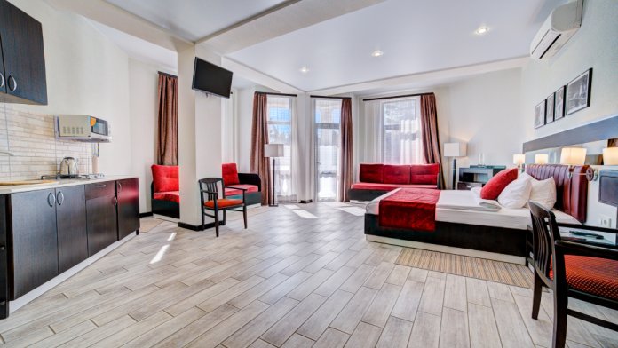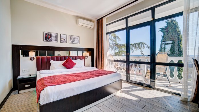 В номере: двуспальная кровать, прикроватные тумбочки, 2 тахты, шкаф-купе, стол, стулья, кухонный уголок, вешалка, зеркало, кондиционер, теплые полы (зимой), сейф, телевизор ЖК, мини-холодильник, микроволновая печь, чайник, набор посуды, пляжные полотенца, санузел с душевой кабиной, фен, туалетные принадлежности, тапочки, балкон оборудован мебелью, вид из номера на город и парк, wi-fi, телефонная связь по территории отеля.