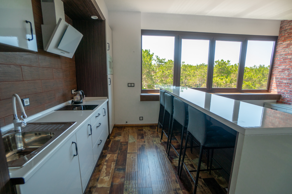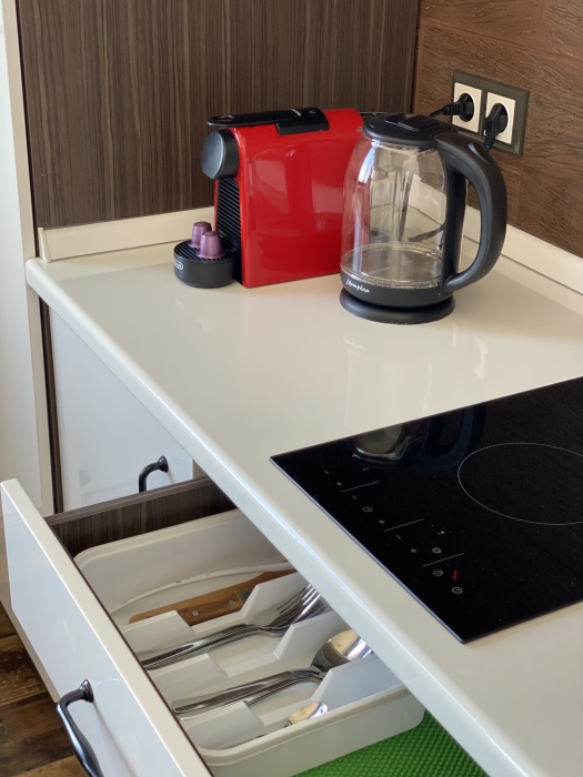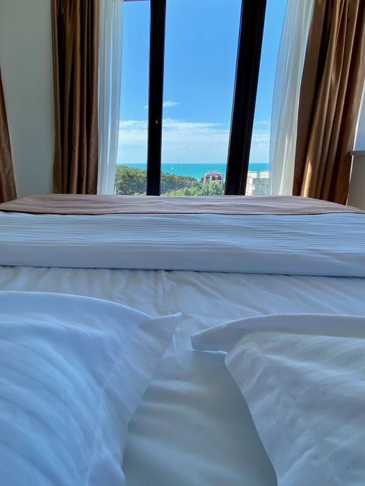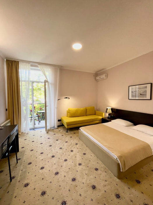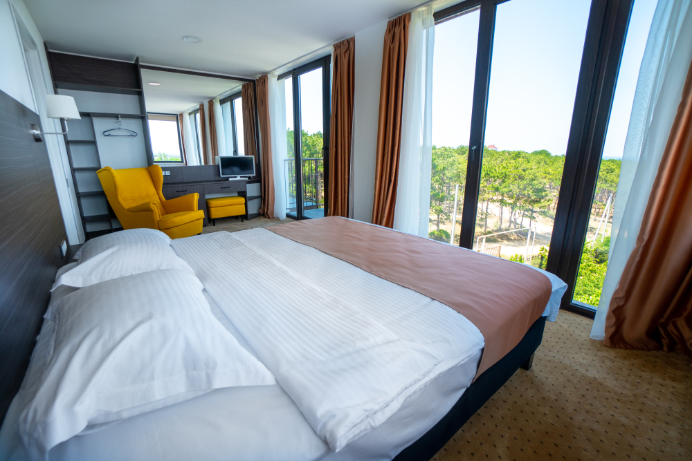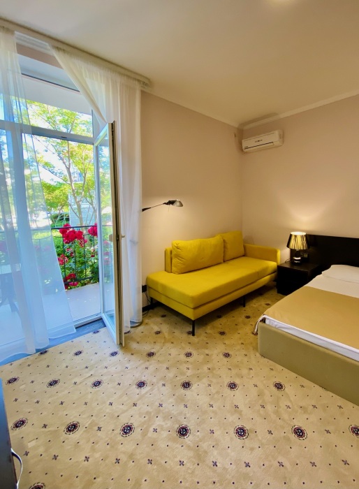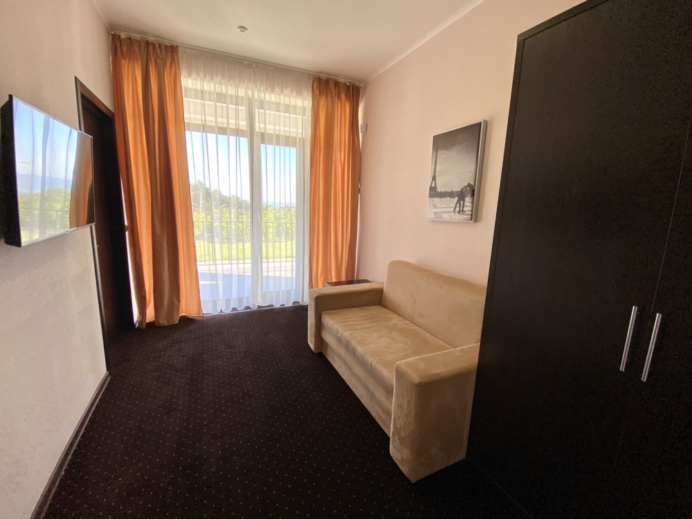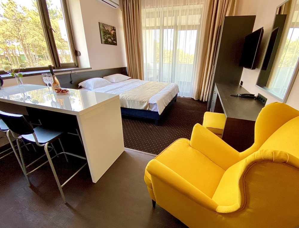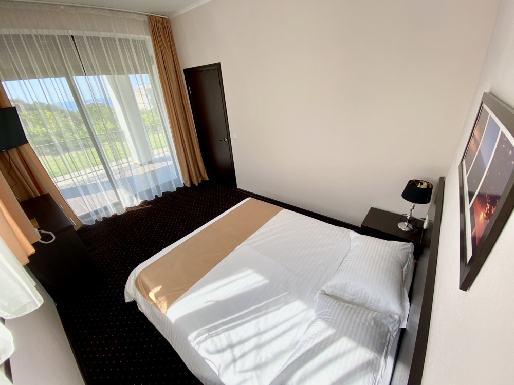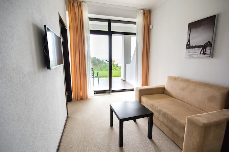 Двухкомнатный номер с понорамными окнами в пол из которых открывается великолепный вид на море.