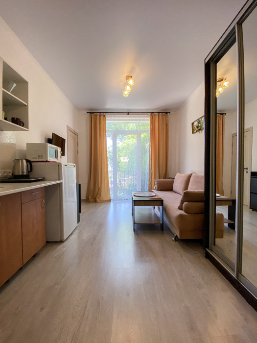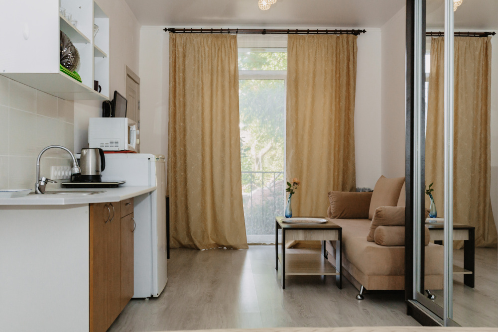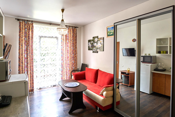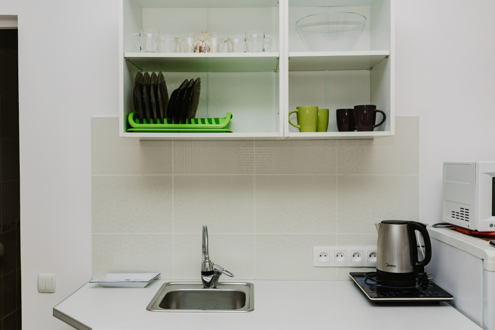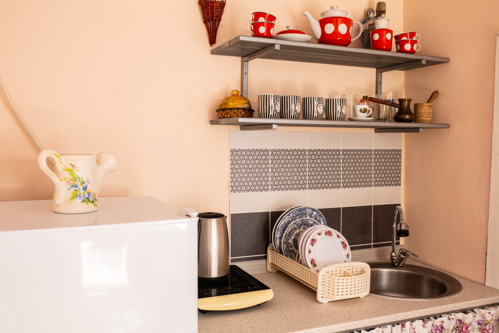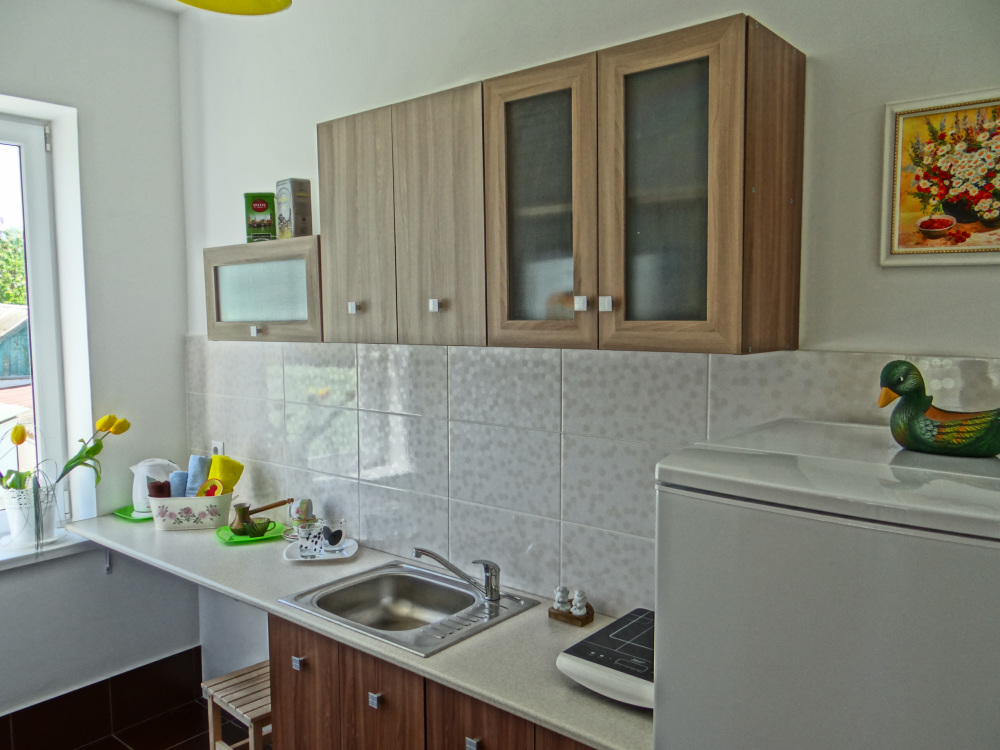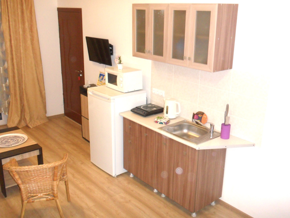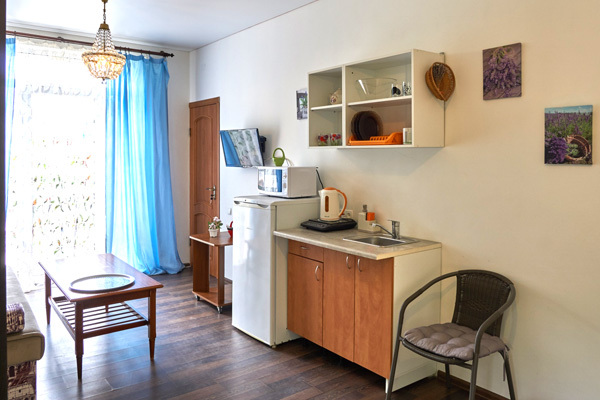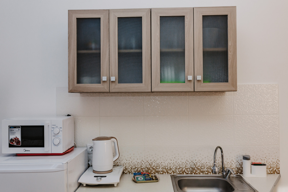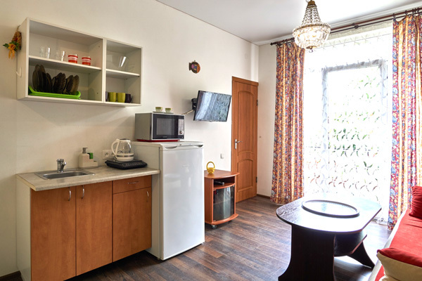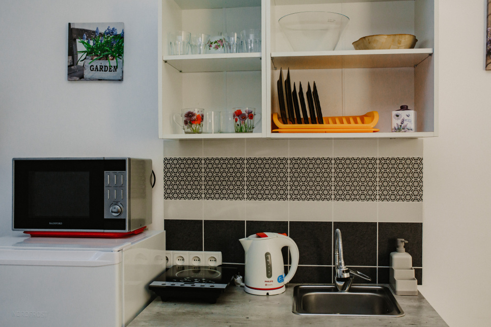 – мини-кухня, холодильник, мойка (хв/гв), микроволновая печь, электрочайник, электрическая или индукционная плита, набор посуды.