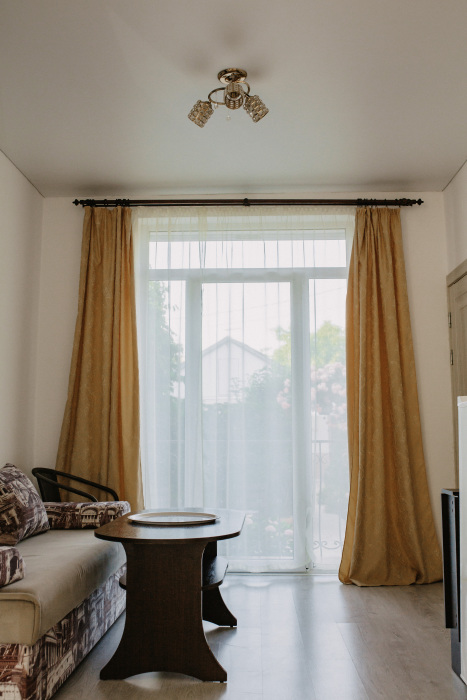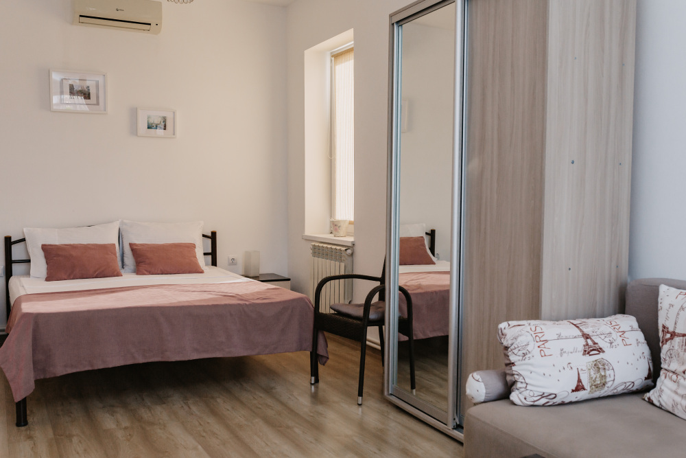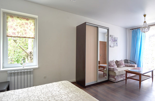 В частном доме «Белый парус» однотипные комнаты повышенной комфортности площадью 24 кв.м. Высота потолков – 2.80 м, полы застелены экологичным ламинатом.