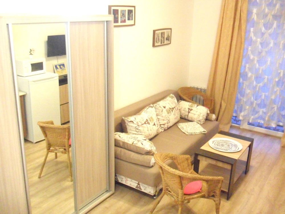 – кухня , холодильник, мойка (хв/гв), микроволновая печь, электрочайник, электрическая или индукционная плита, набор посуды.