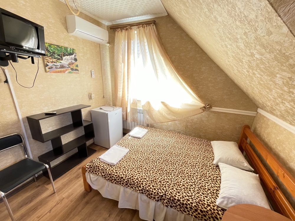 В номере находится 2-х спальная кровать с ортопедическим матрацем, кресло-кровать, столик, стул, телевизор, холодильник, кабельное ТВ, WI-FI, кондиционер.Санузел,душевая на 2 номера.