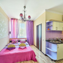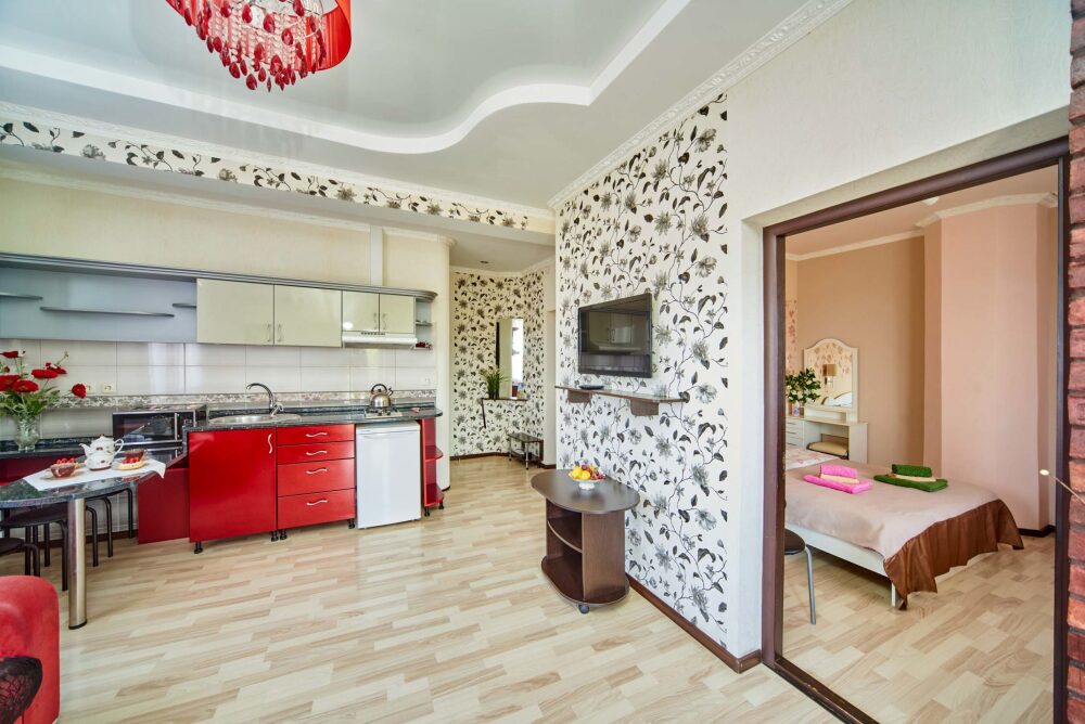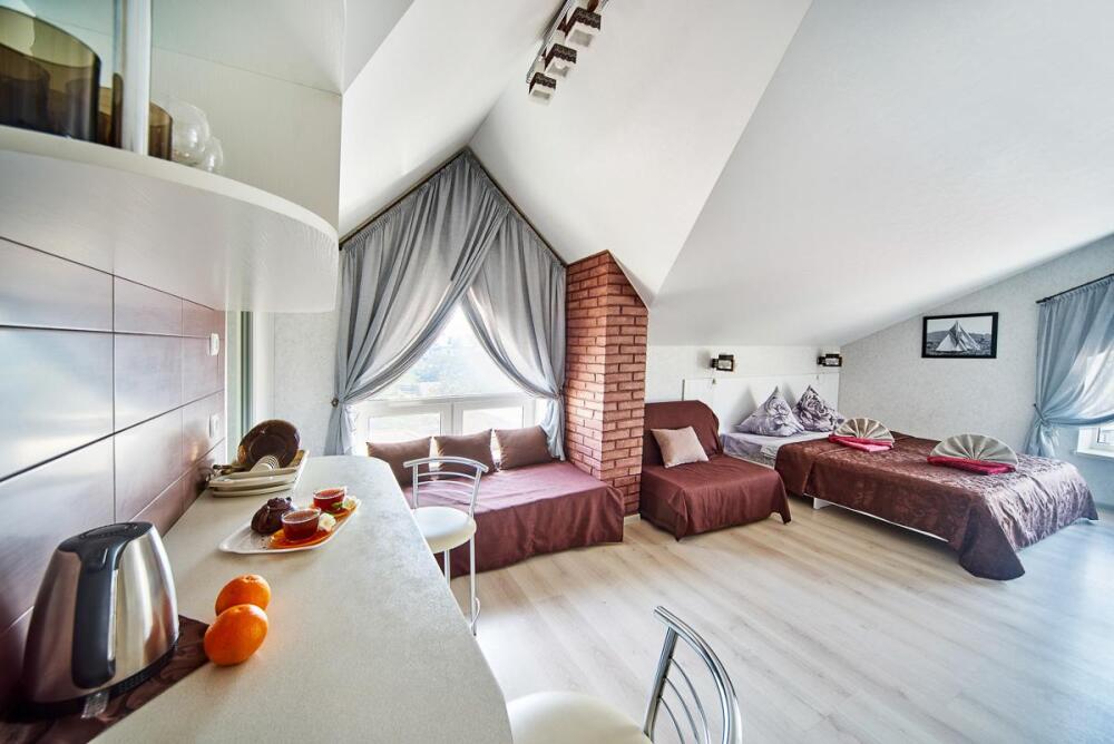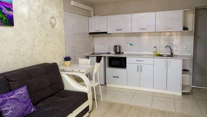Дизайн-номер с кухней-студио в номере и полноценной возможностью готовить. Выполнен в светлых тонах. Оснащен комфортными спальными местами, платяным шкафом, столом, феном, сейфом, кондиционером, телевизором.