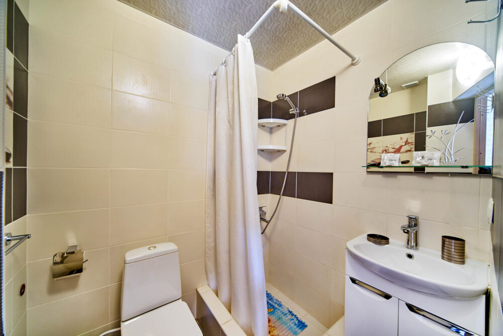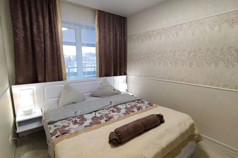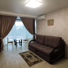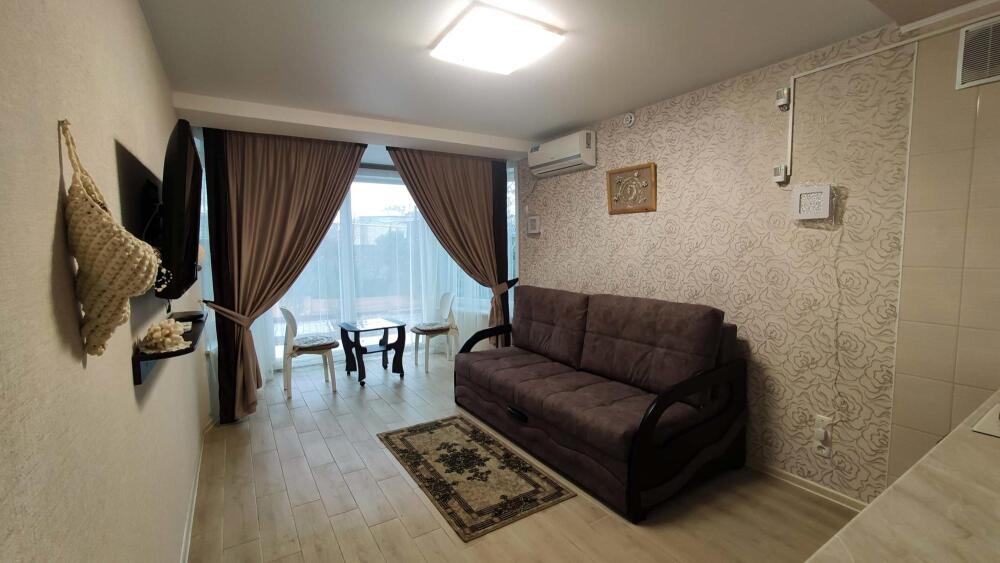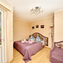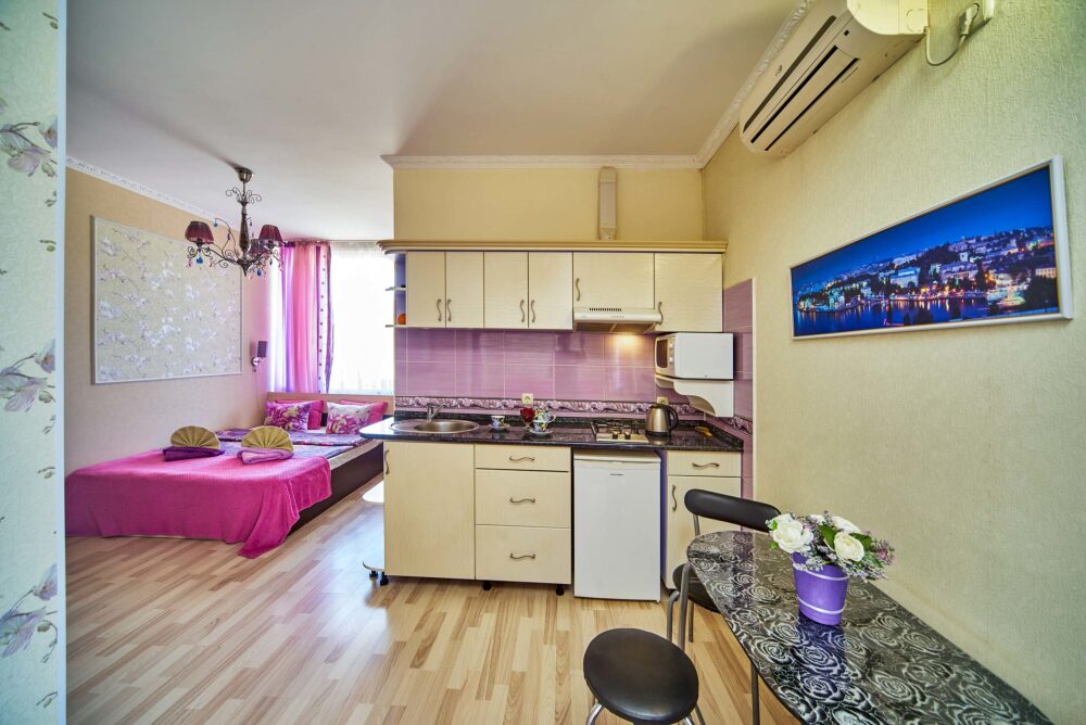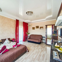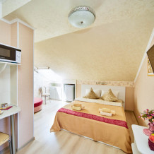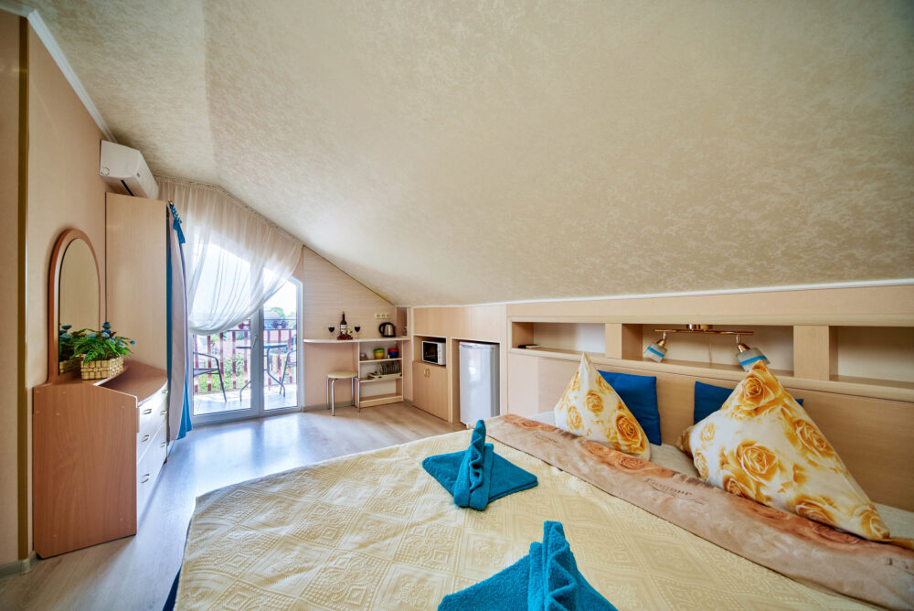 Дизайн-номер выполнен в пастельных тонах, одно из окон расположено в потолке номера, что создаёт необычную стилистику. Зона мини-кухни оборудована холодильником, посудой, СВЧ-печью, эл. чайником. Номер будет удобен для отдыха 2-3 человек. С балкона открывается чудесный вид на море (Севастопольская бухта), а вечером на огни ночного Севастополя. Вам будет уютно и комфортно.