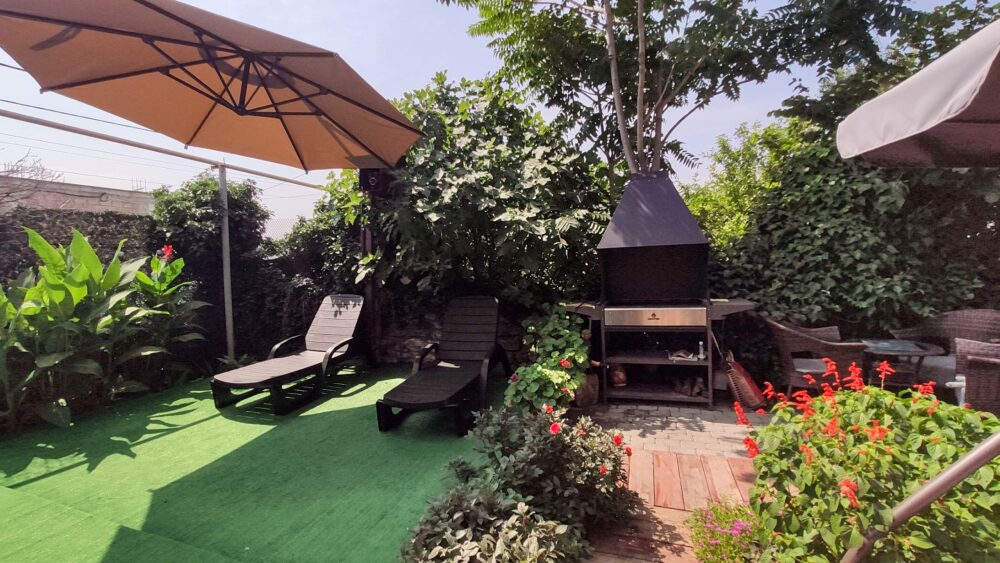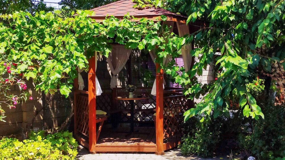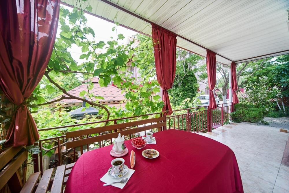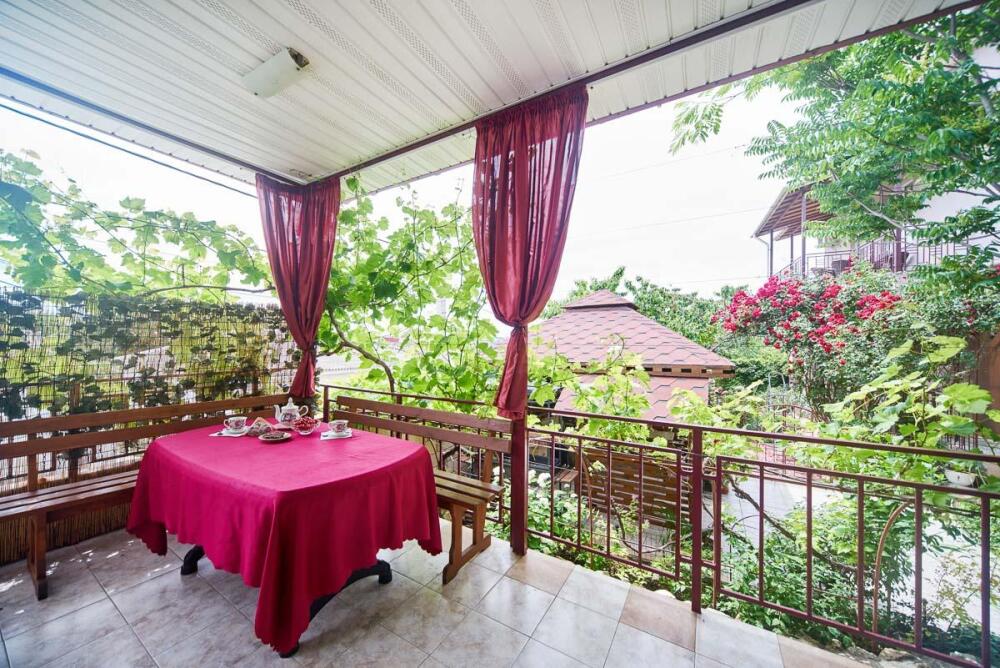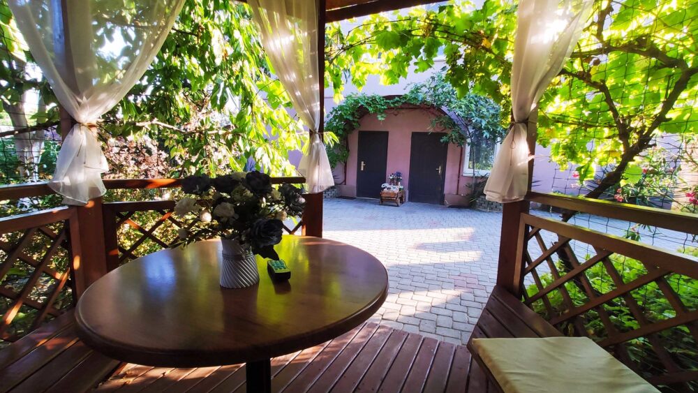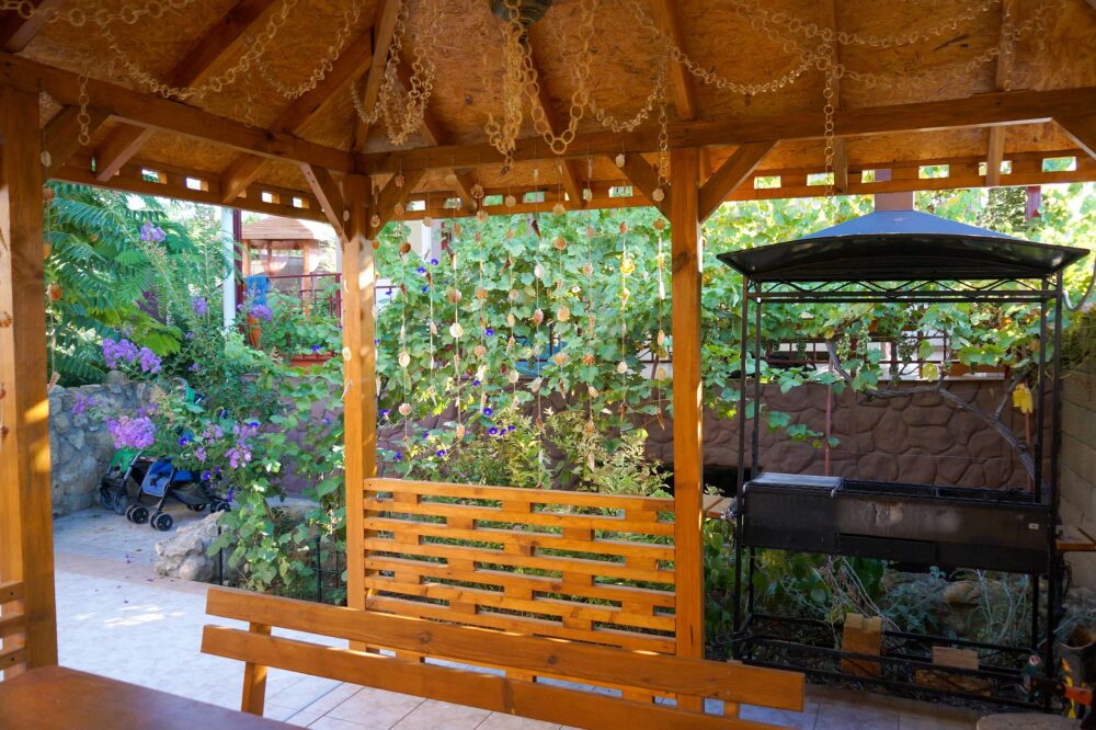 Природный номер на 1 этаже с летней полноценной кухней (индивидуальные посуда, холодильник, столовые приборы, полочки для продуктов) и террасой в окружении виноградной лозы.