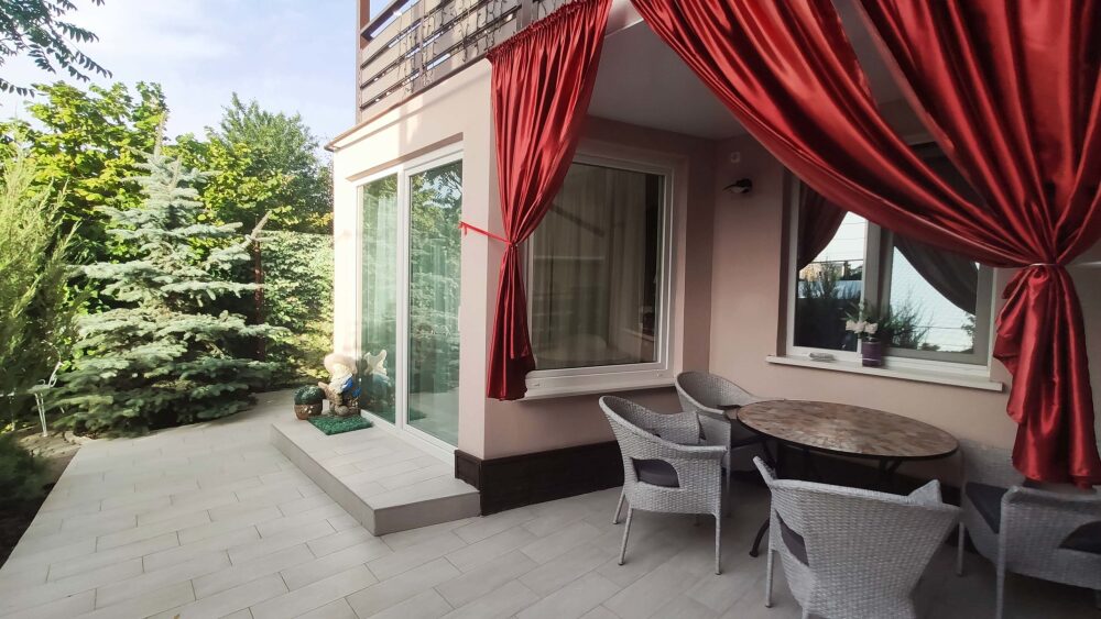 Стилизованный номер на 1 этаже с летней полноценной кухней, (индивидуальные посуда, холодильник, столовые приборы, полочки для продуктов) и террасой в окружении виноградной лозы.