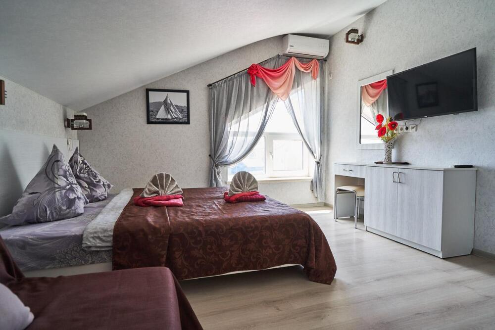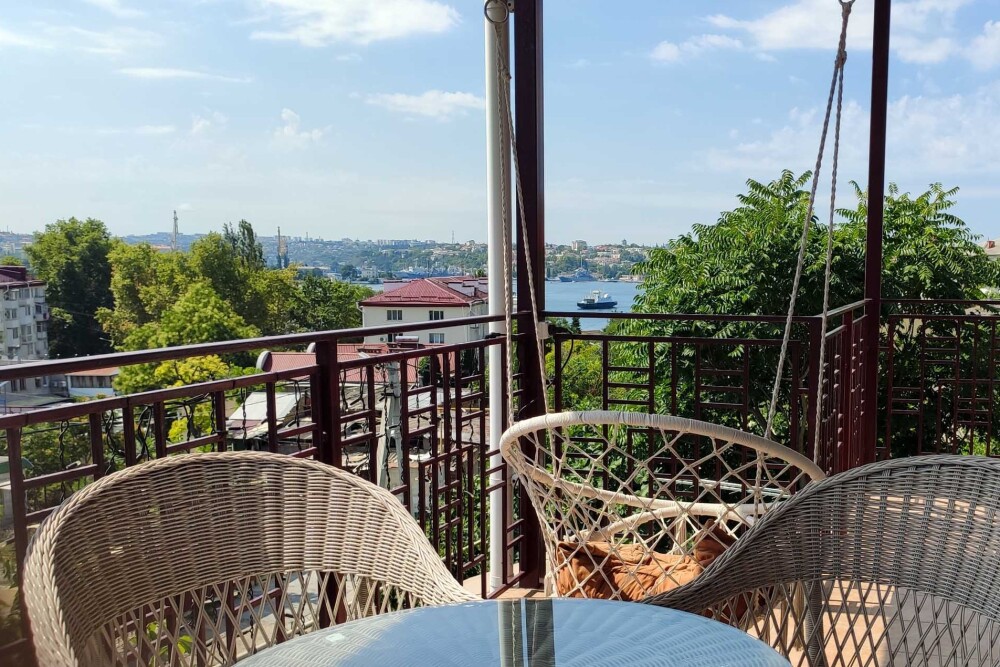Очень красивый и стильный номер со всеми удобствами. Номер подойдет как для семьи из 3-4 человек, так и для подруг (друзей), т.к. при желании, все спальные места могут быть раздельными. К номеру примыкает комфортный балкон, на котором расположена садовая мебель для отдыха. С балкона открывается чудесный вид на Севастопольскую бухту, а вечером Вы насладитесь отражением ночных огней Севастополя на морской глади.