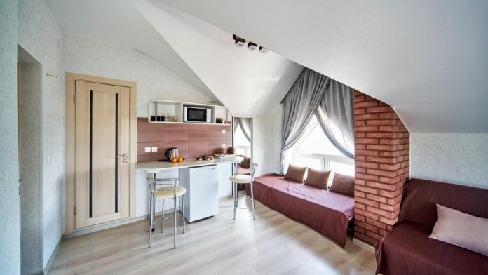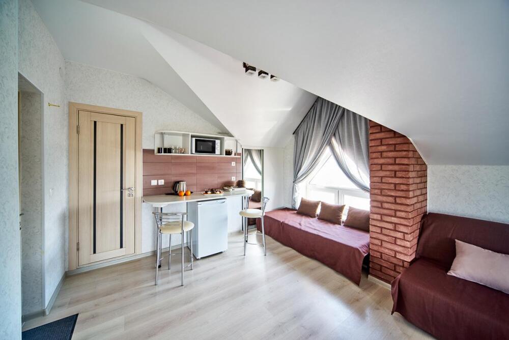 Подойдет как для комфортного проживания 2-х гостей, так и для отдыха семьи из четырех человек. Зал-студия оборудована полноценной кухней и индивидуальной террасой на улице.