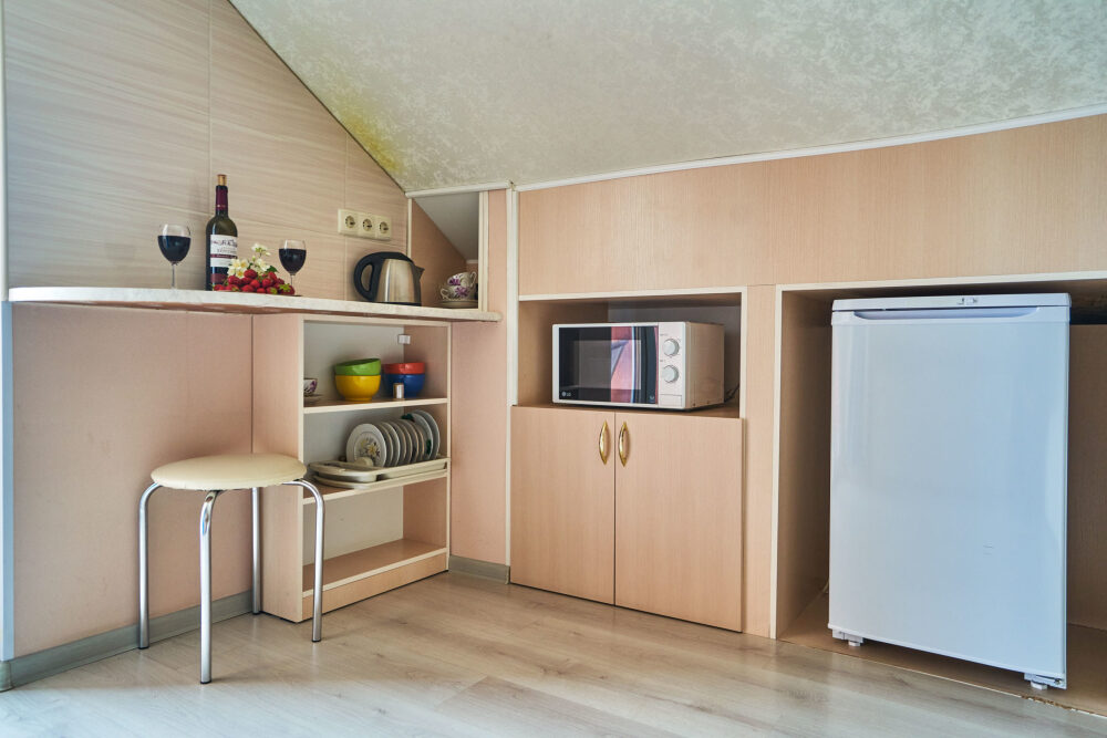 Дизайн-номер на 3 этаже для комфортного проживания 1-2 человек. В номер имеется мини-кухня (холодильник, чайник, посуда, СВЧ-печь). На балконе расположена садовая мебель для удобного и уютного отдыха.