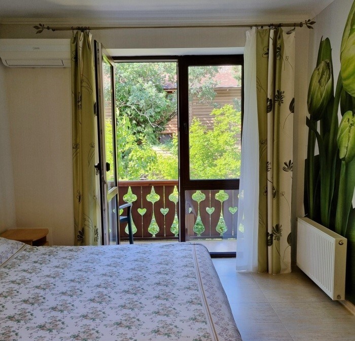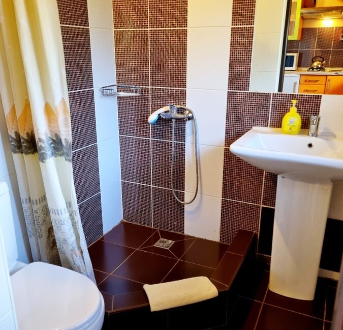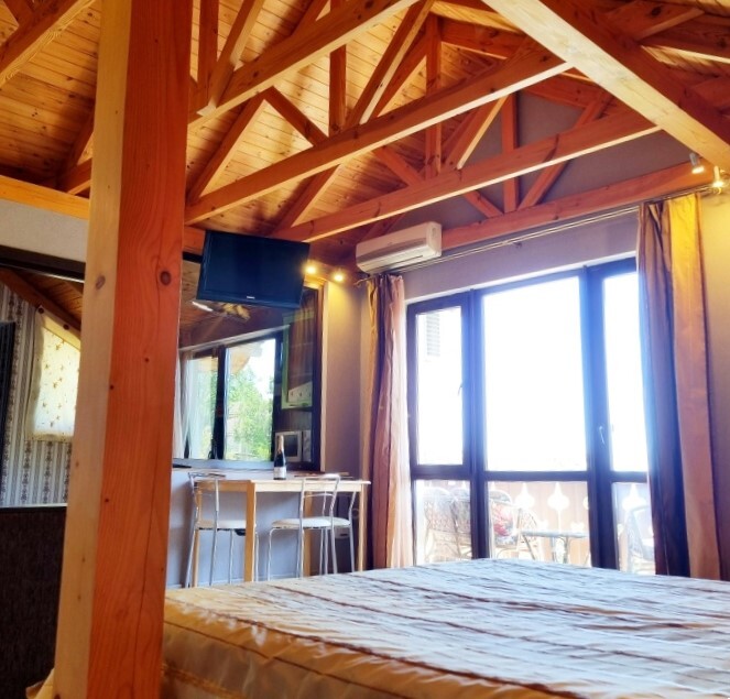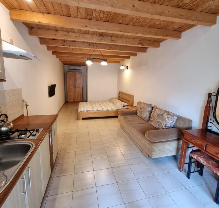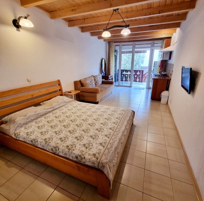 Апартаменты Studio имеет отдельный вход и уютную террасу со столом и креслами. В апартаментах: двуспальная кровать(160*200), раскладной диван (150*200), платяной шкаф, телевизор с кабельным ТВ, туалетный столик, утюг, гладильная доска, Wi-Fi интернет, кондиционер.