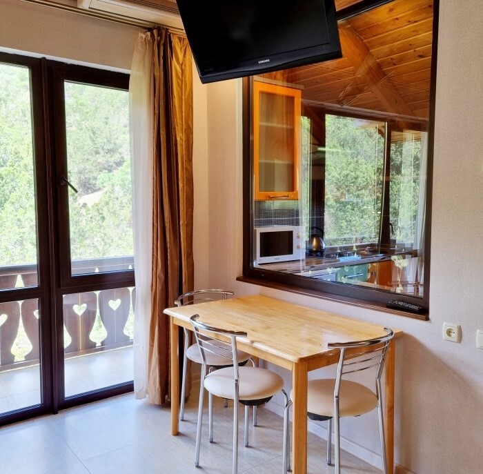 В апартаментах: двуспальная кровать(160*200), мягкий уголок, платяной шкаф, телевизор LCD 32» телевизор с кабельным ТВ, стол, стулья, утюг, гладильная доска, Wi-Fi интернет (бесплатно), кондиционер.