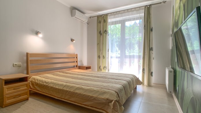 В апартаментах: двуспальная кровать (160*200), раскладной диван, платяной шкаф, телевизор с, кабельным ТВ, столик, утюг, гладильная доска, Wi-Fi интернет, кондиционер, балкон.