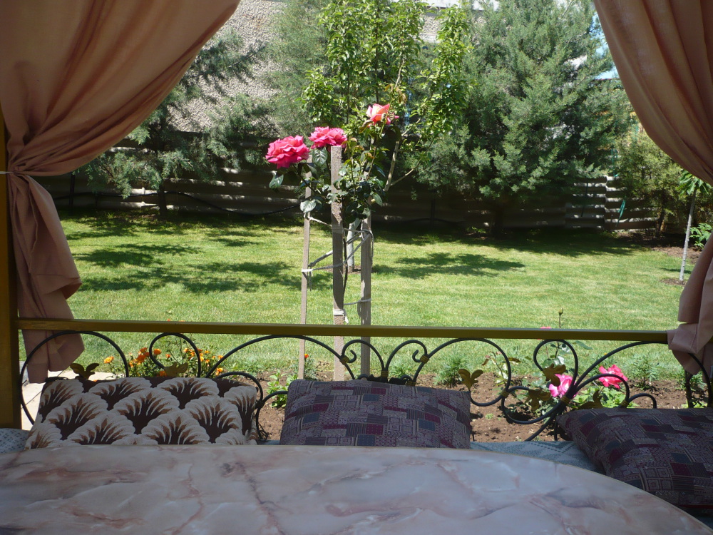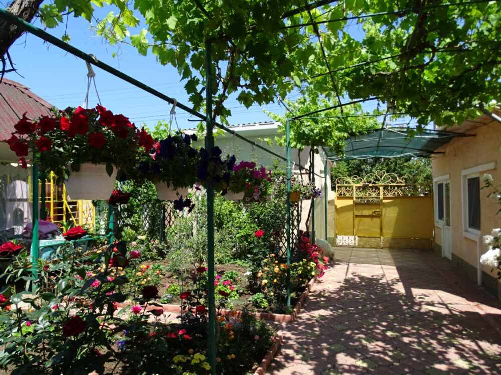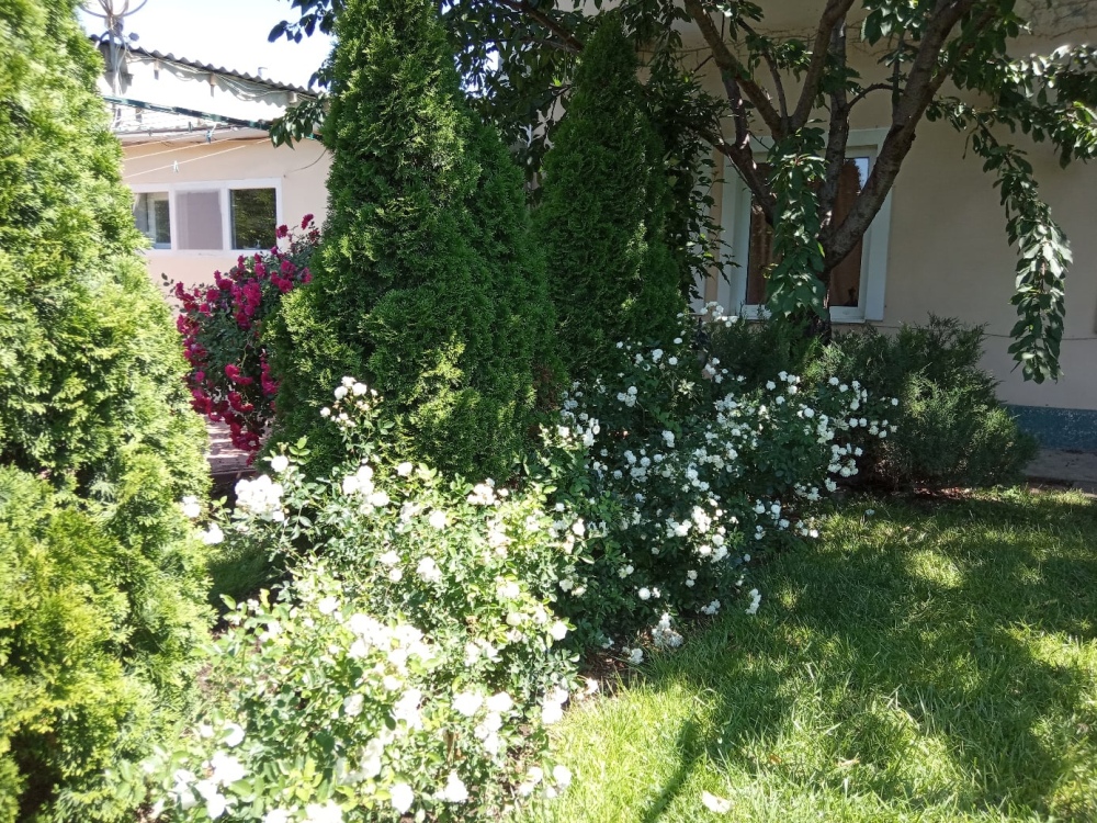 Двор нашего дома утопает в зелени и цветах. Одни цветы сменяют другие. В какое бы время Вы не приехали, вас всегда встретит цветущий двор.