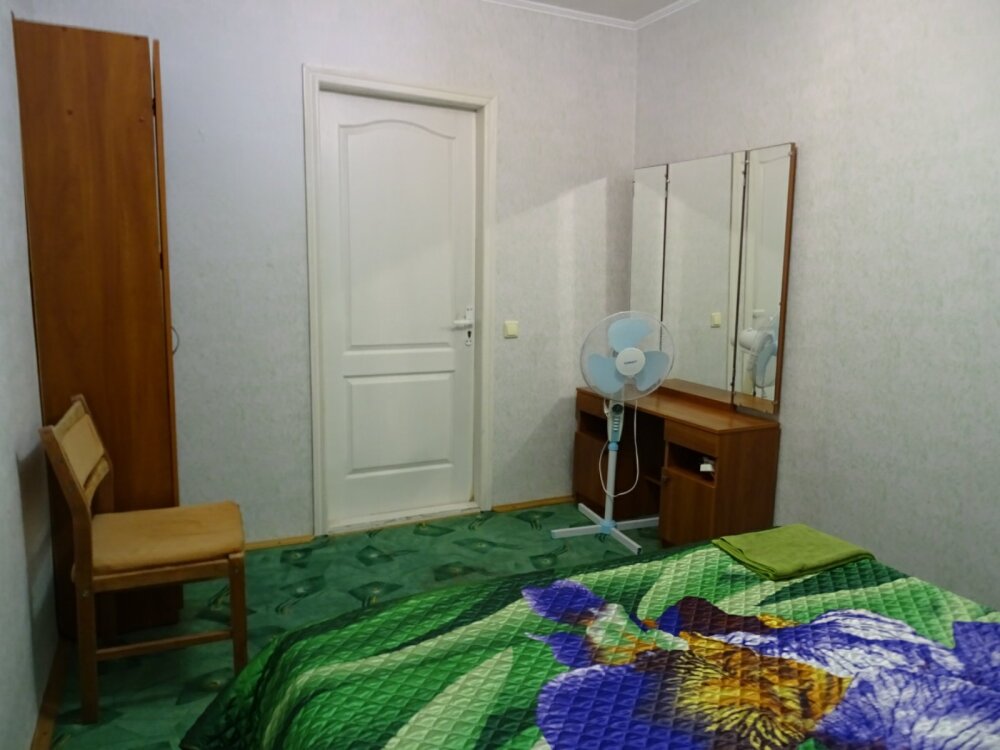 В каждой комнате есть кровати односпальные и двуспальные ( все с ортопедическими матрасами), прикроватные тумбочки,стол, шкаф для одежды, трельяж, вентилятор.