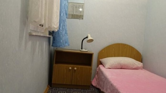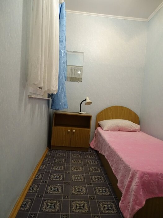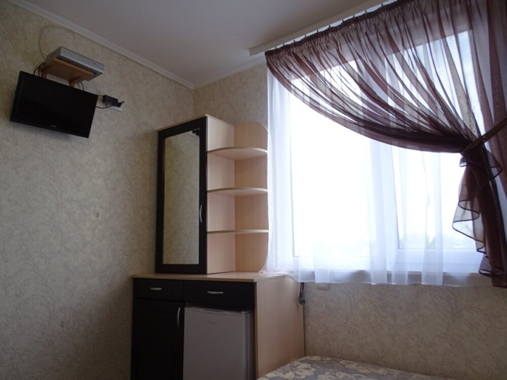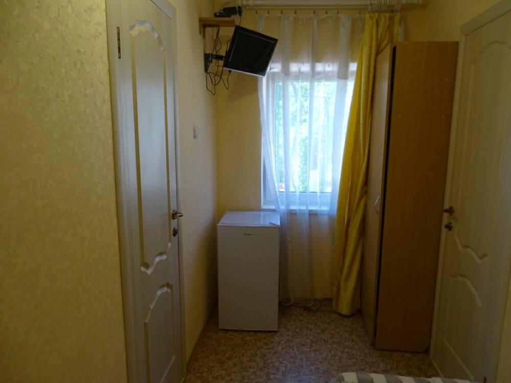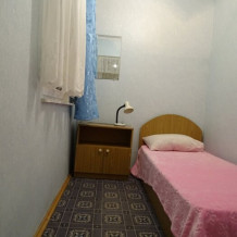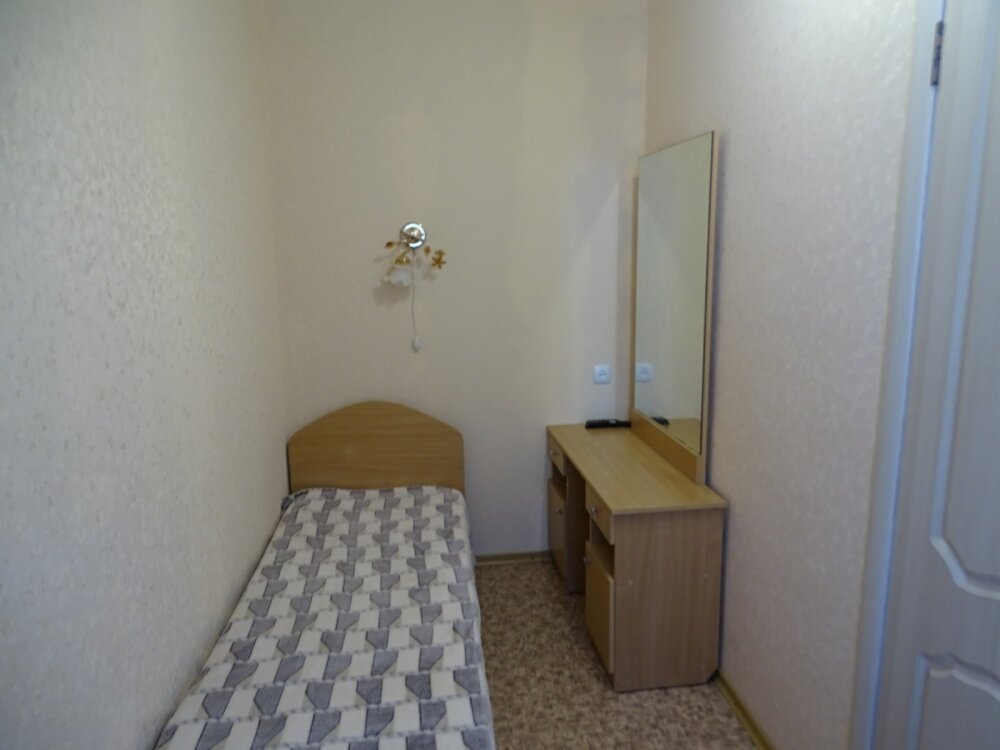 В номере односпальная кровать, тумбочка, вешалка, вентилятор. Сан. узел на этаже