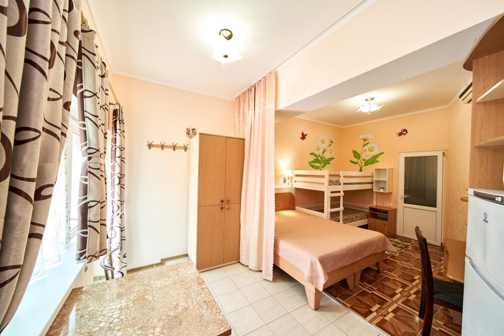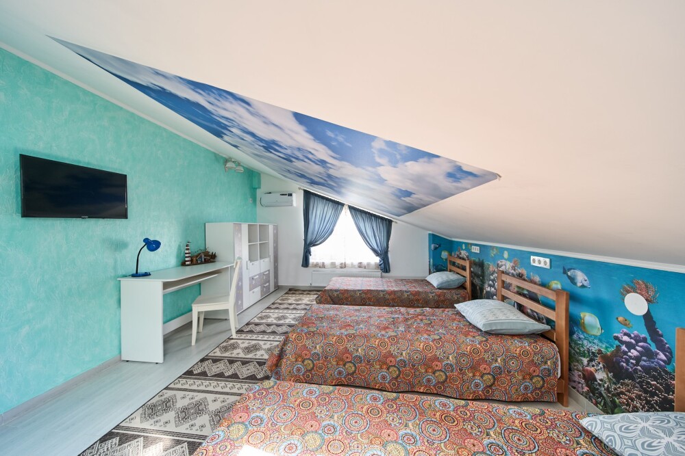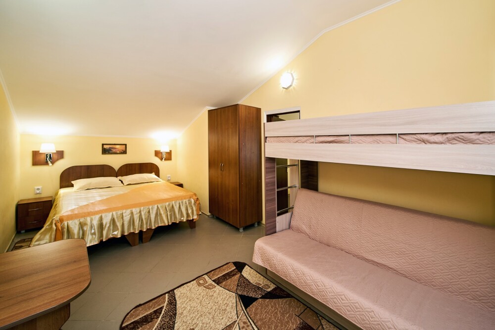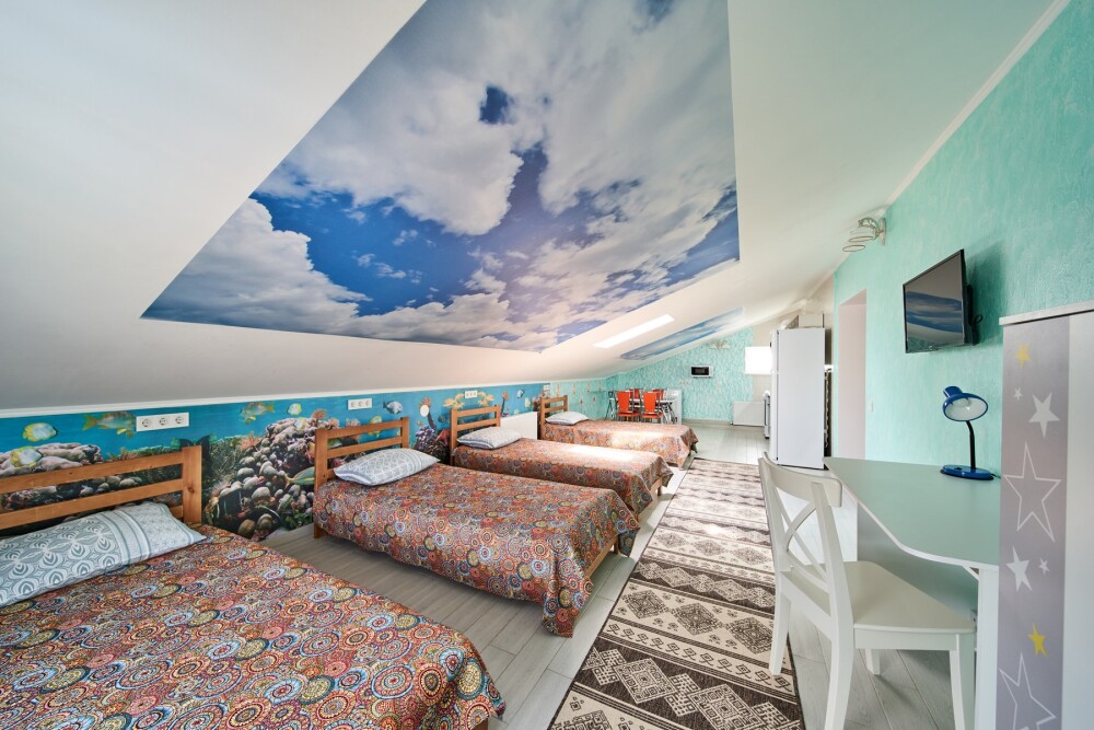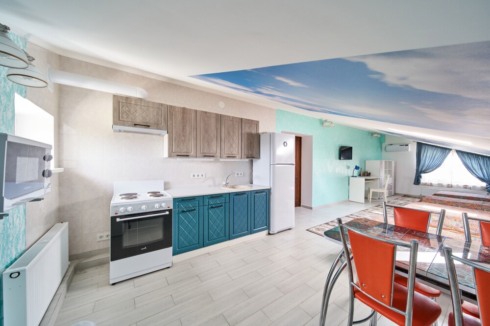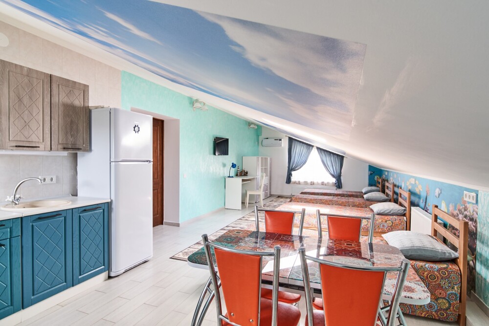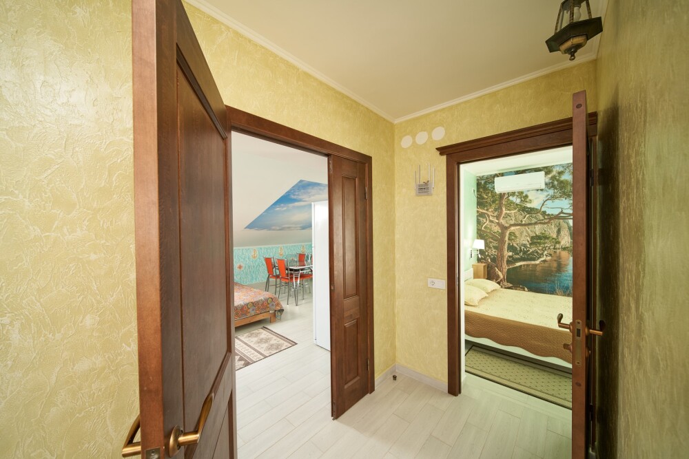 Новинка 2022 года, апартаменты находятся на 4 этаже, но начинается на 3 этаже. Имеют собственную лестницу, на 3 этаже расположен вход и прихожая. На 4 этаже коридор, душ, туалет, спальня, выход на балкон и комната-студия с 4 спальными местами и полноценной кухней. В номере располагается 6 полноценных спальных мест