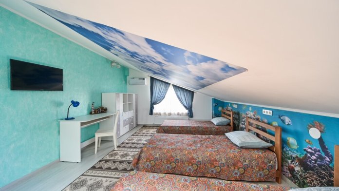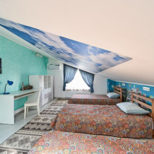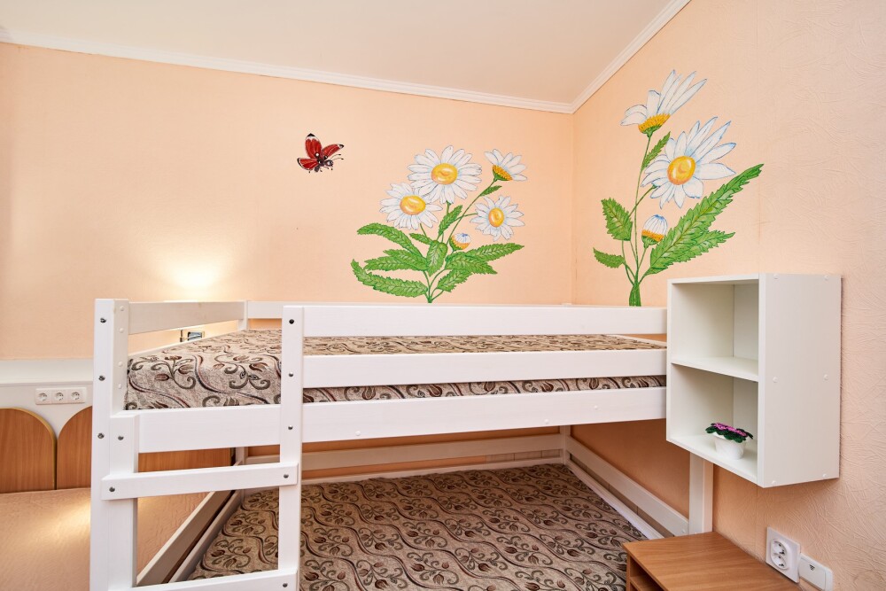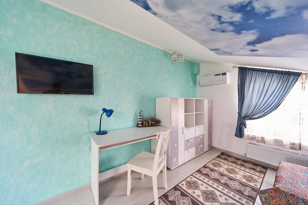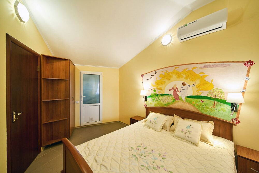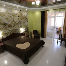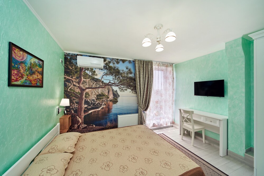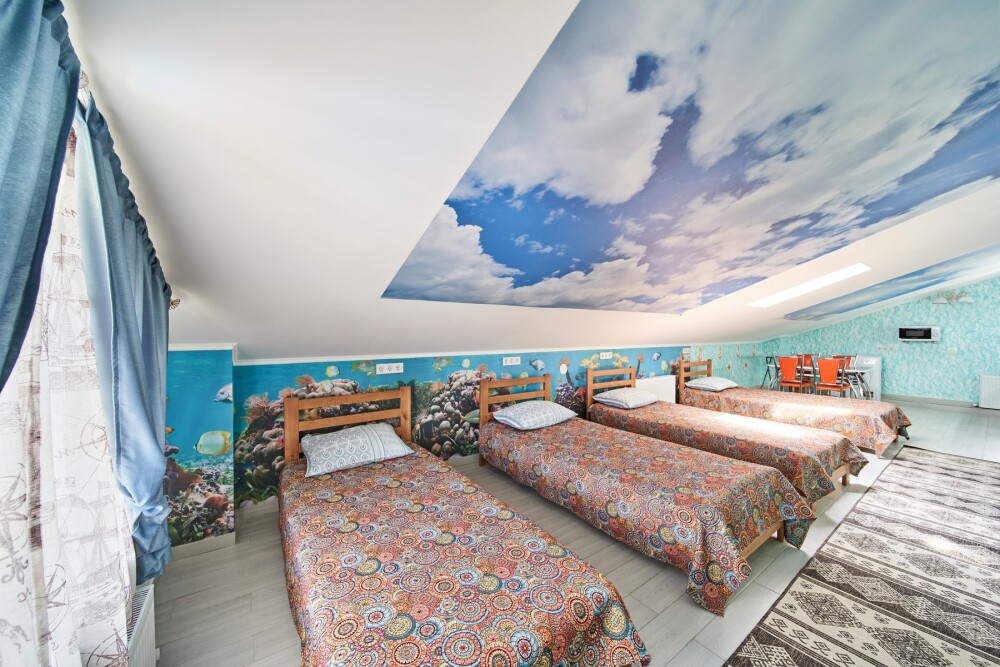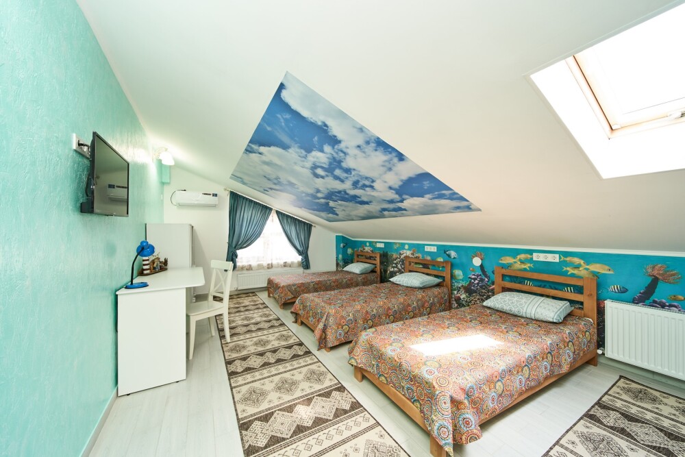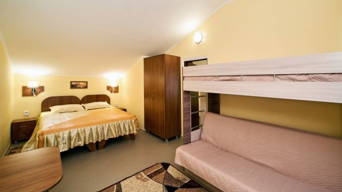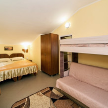 Новинка 2022 года, апартаменты находятся на 4 этаже, но начинается на 3 этаже. Имеют собственную лестницу, на 3 этаже расположен вход и прихожая. На 4 этаже коридор, душ, туалет, спальня, выход на балкон и комната-студия с 4 спальными местами и полноценной кухней. В номере располагается 6 полноценных спальных мест