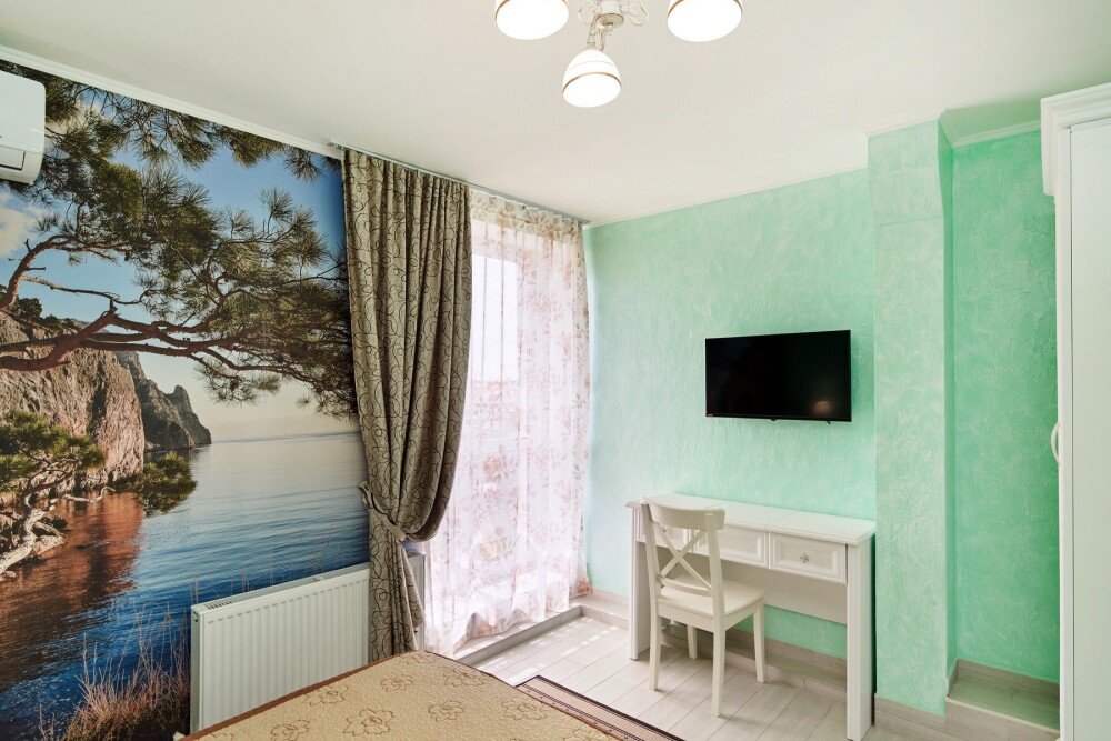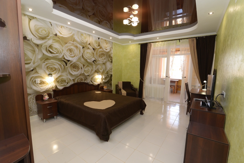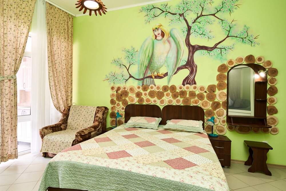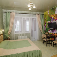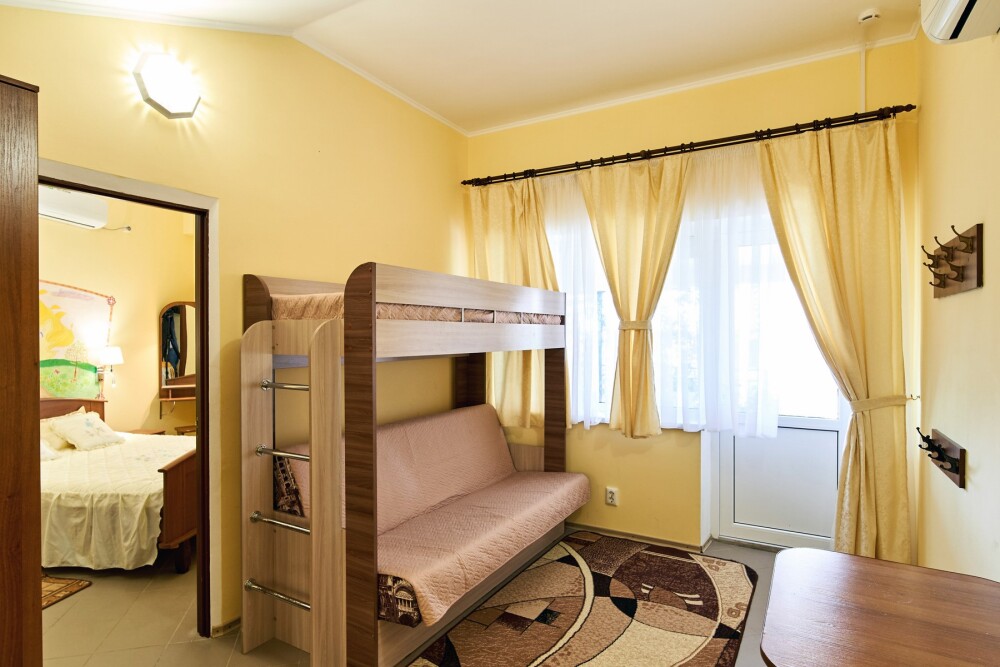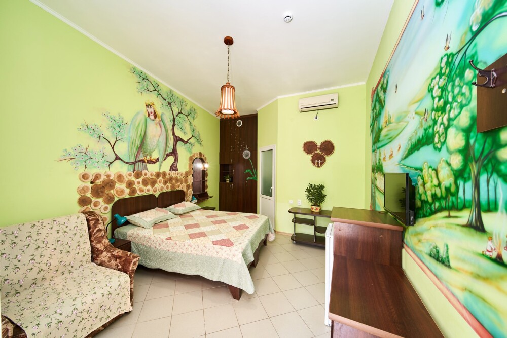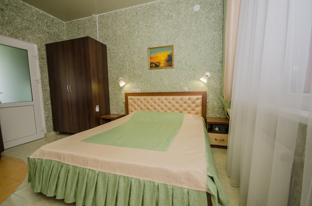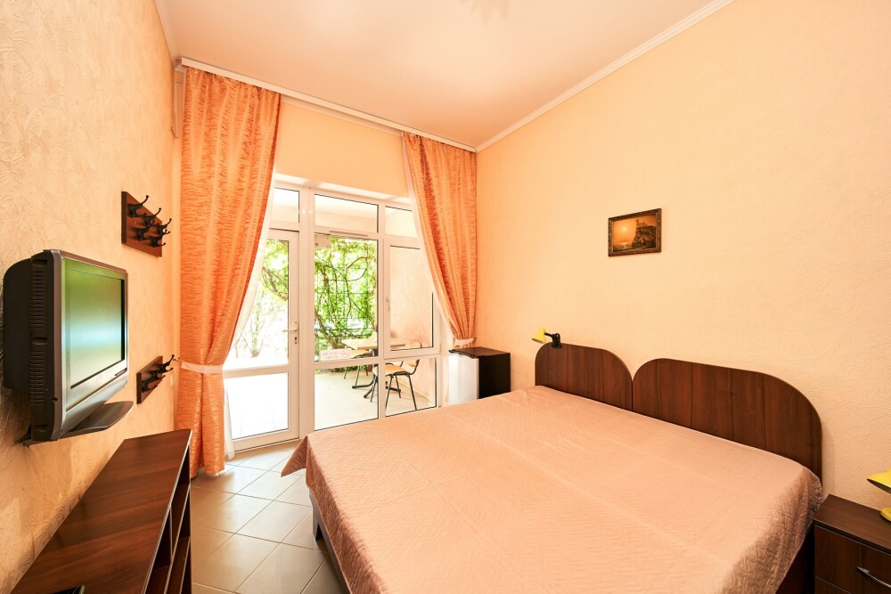 Семейный - это две комнаты со всеми удобствами. Вход идет через индивидуальную большую террасу увитую зеленью, на террасе находится кухня