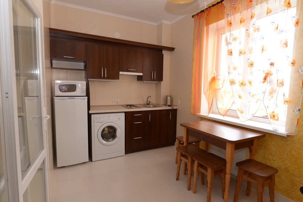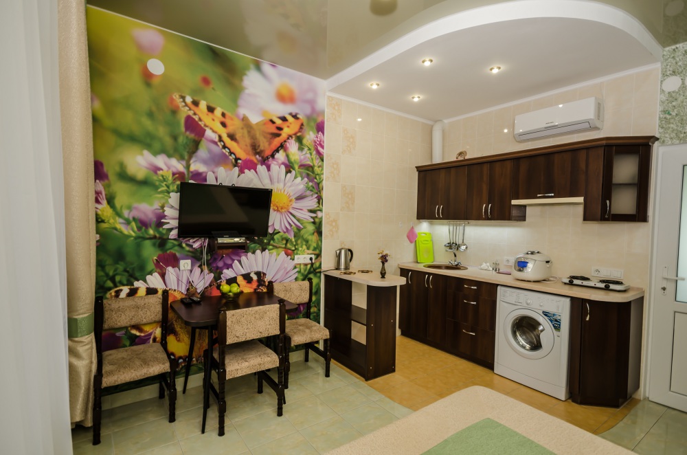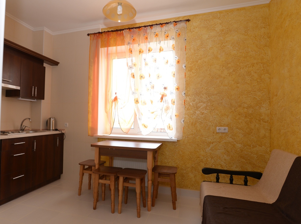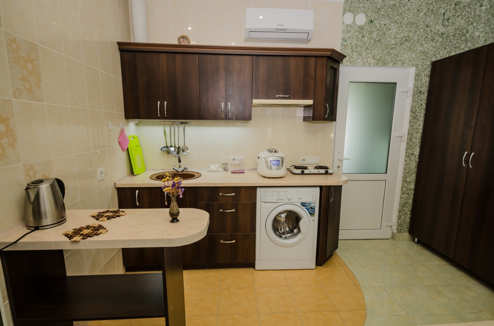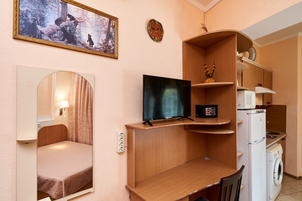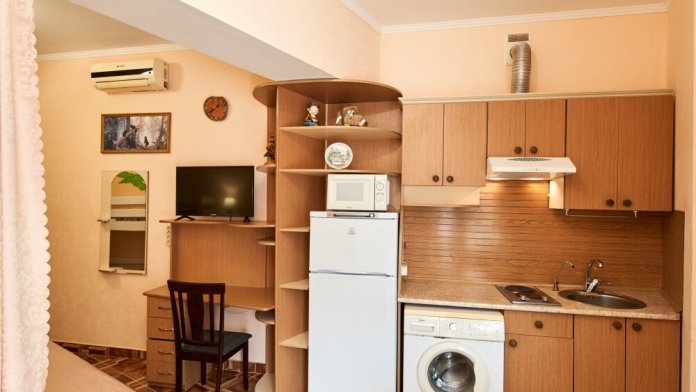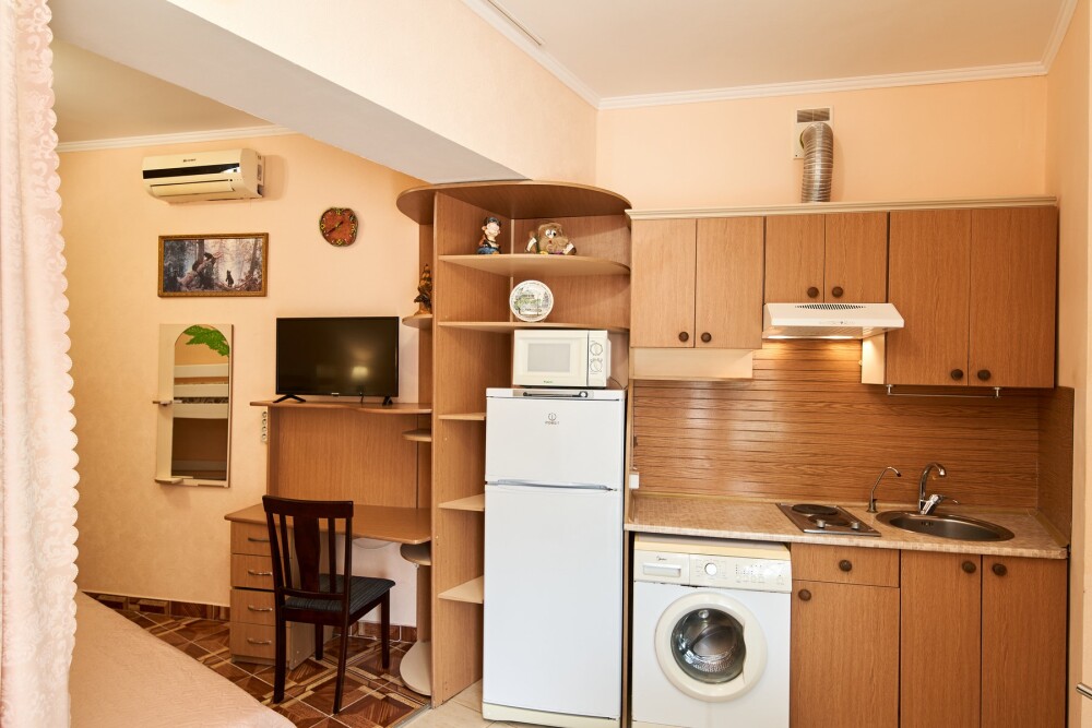 Стандарт с кухней-студией - это одна комната со всеми удобствами и кухонной зоной.