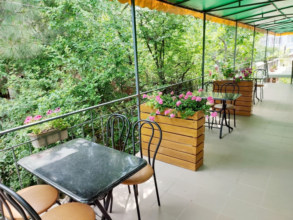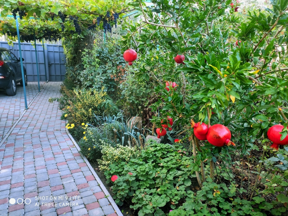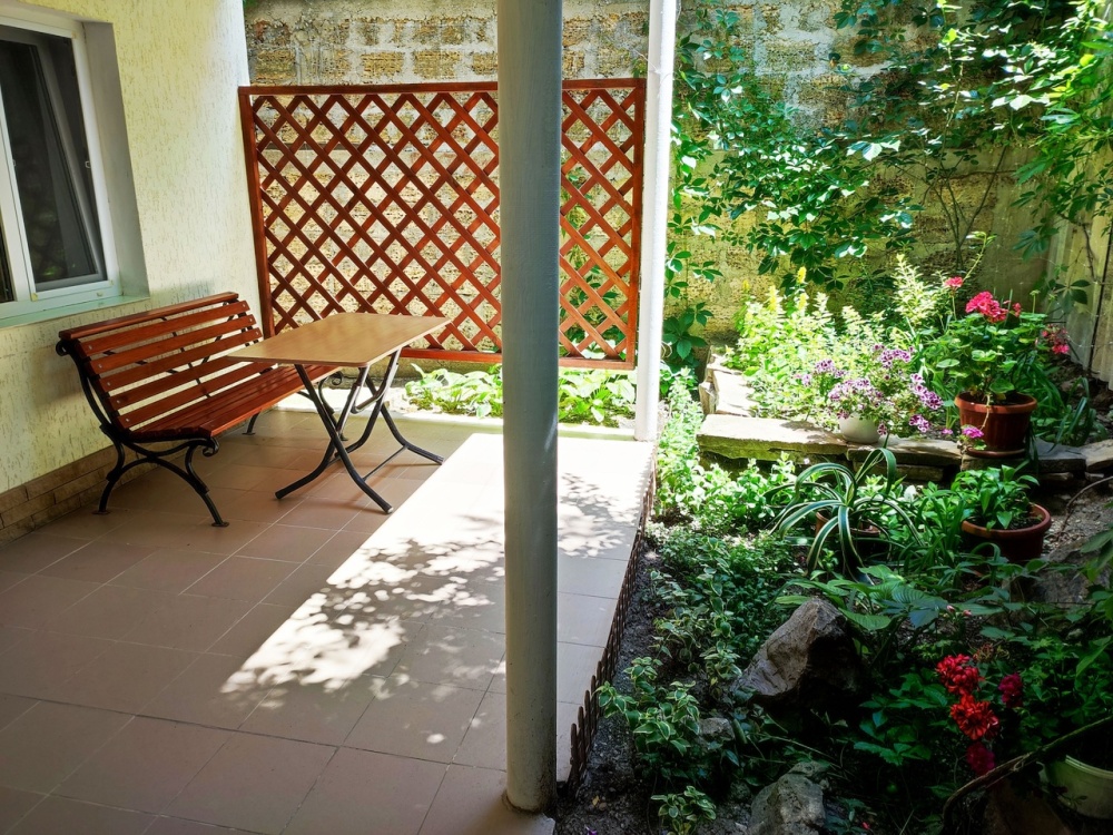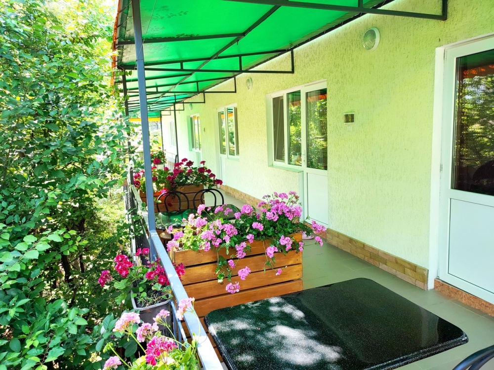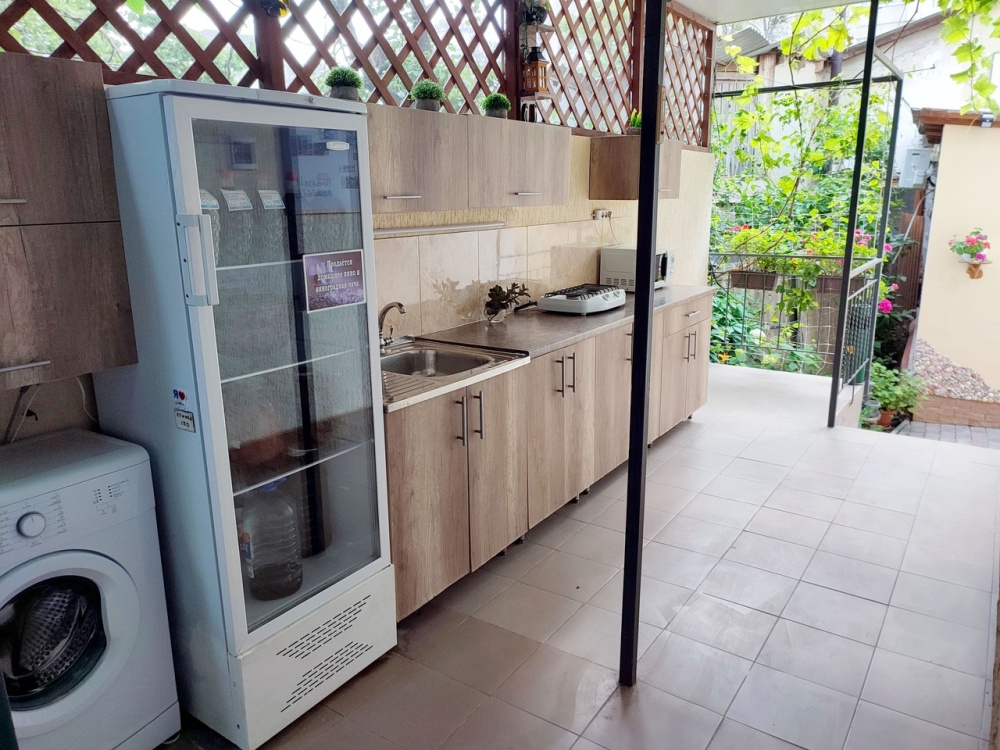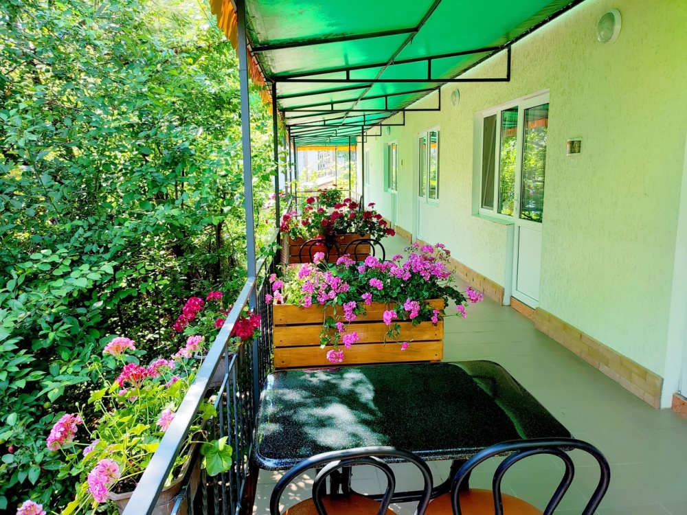 Напротив каждого номера отдельный столик для отдыха. Кухня, стиральная машина, мангал. Ухоженный двор, утопающий в зелени винограда, деревьев граната и множества цветов.
