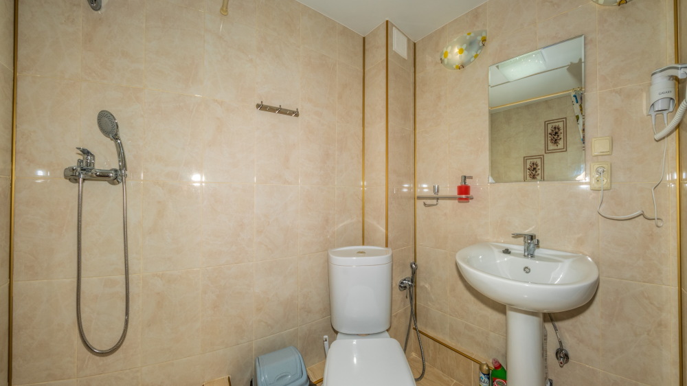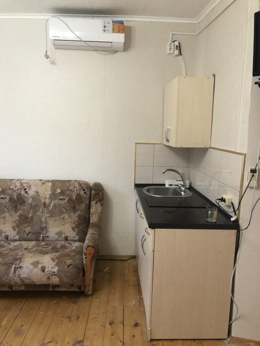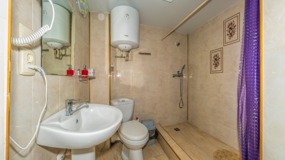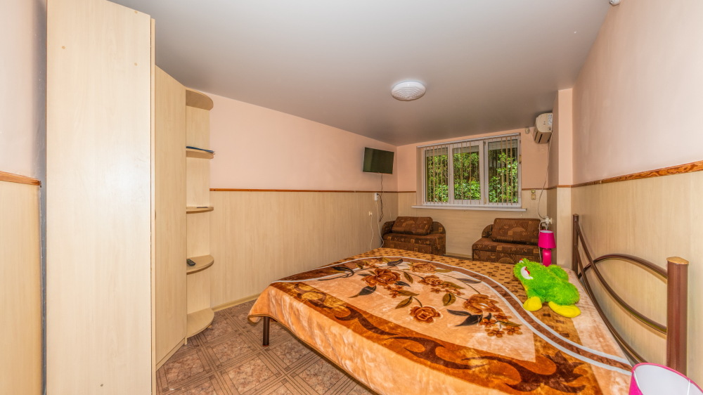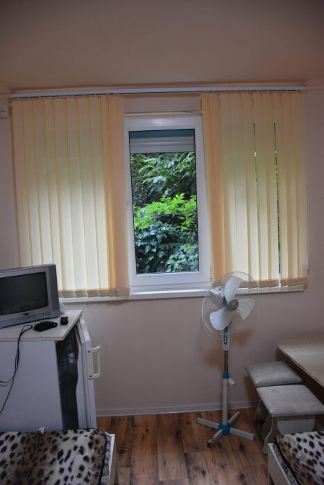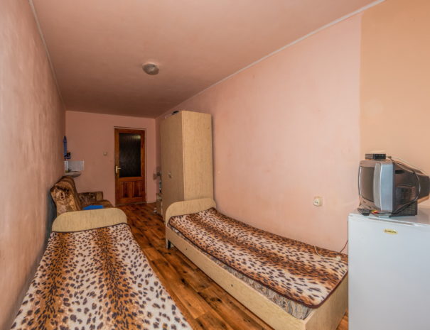 В каждом номере вентилятор, цифровое ТВ, Wi-Fi, две односпальные кровати, прикроватные тумбочки, платяной шкаф, электрический чайник, холодильник, необходимый набор посуды, обеденный стол и стулья. Санузел (душ и туалет) у данной категории номеров общий на три номера. Общая кухня не предусмотрена. К Вашим услугам общий балкон на три номера с видом на море. При заселении конфигурация номера может незначительно отличаться (в зависимости от наличия свободного номера).
