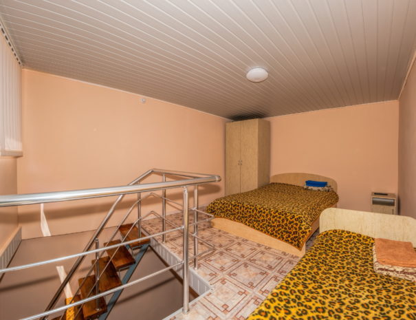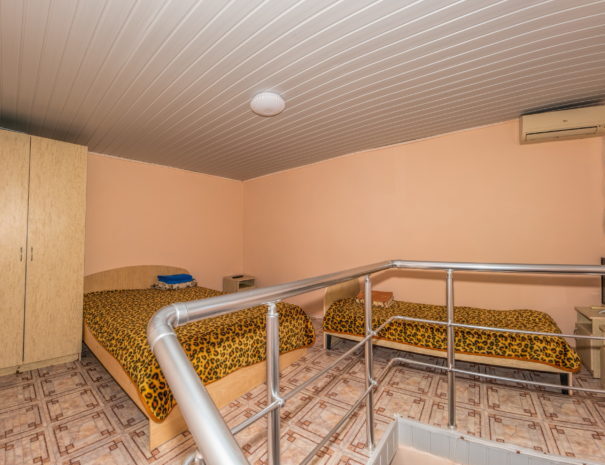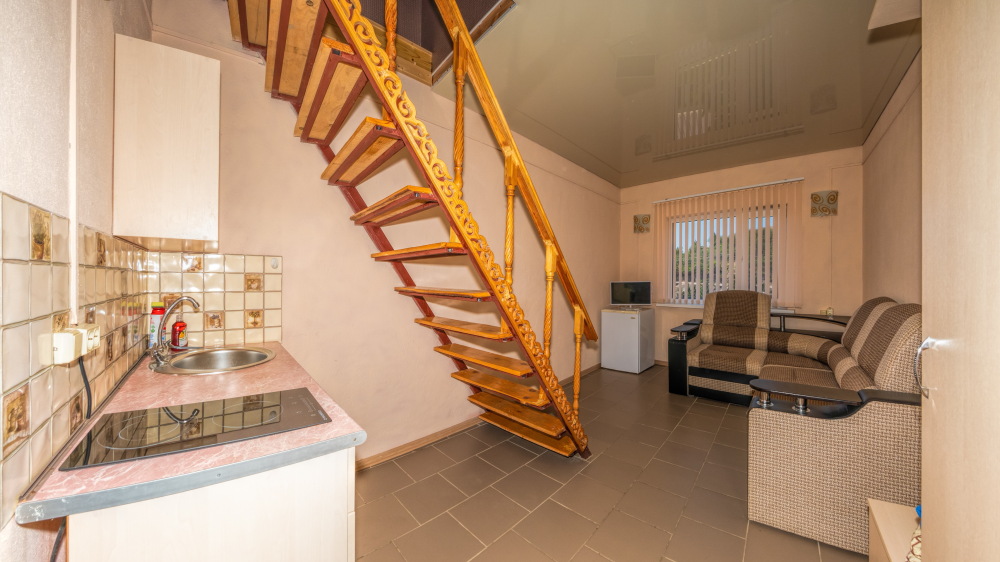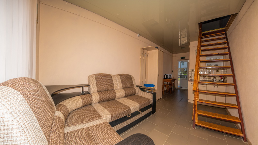 На первом этаже гостиная комната, совмещенная с обеденной зоной, и личный санузел (душ и туалет); на втором этаже спальная комната с кондиционером, Wi-Fi, двуспальной либо тремя односпальными кроватями и прикроватными тумбочками. В гостиной комнате – цифровое ТВ, двуспальный либо односпальный раскладной диван, платяной шкаф, электрический чайник, необходимый набор посуды, холодильник, обеденный стол и табуретки. Общая кухня на три номера. При заселении конфигурация номера может незначительно отличаться (в зависимости от наличия свободного номера).