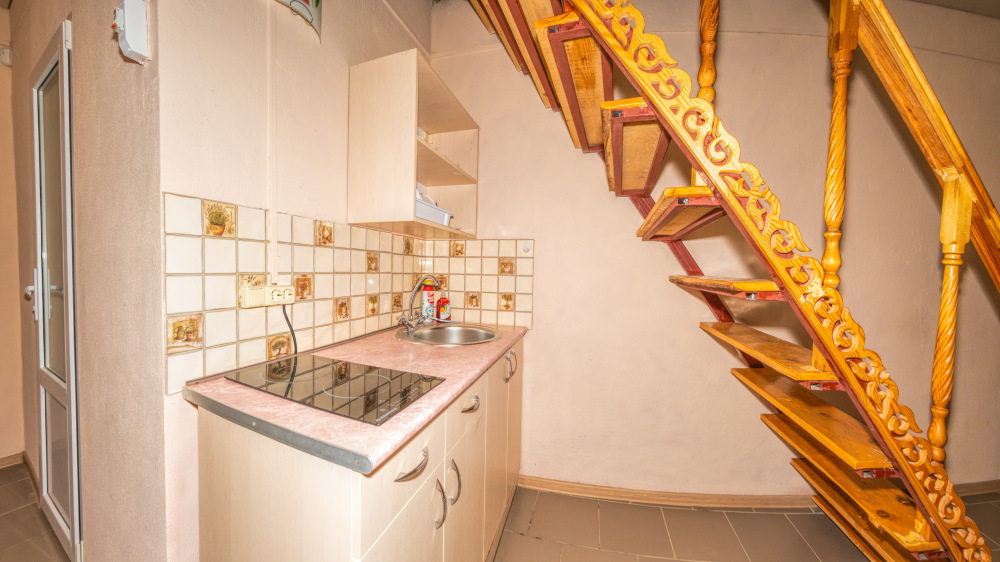 На первом этаже гостиная комната, совмещенная с кухней, и отдельный санузел (душ и туалет); на втором этаже спальная комната с цифровым ТВ, Wi-Fi, кондиционером, двуспальной либо двумя односпальными кроватями, двумя диванами-малютками, прикроватными тумбочками и комодом. В гостиной комнате – раскладной двуспальный диван, варочная панель, электрический чайник, холодильник, микроволновая печь, кухонная мебель со всеми необходимыми кухонными принадлежностями, обеденный стол и стулья. Общий балкон на два номера с видом на горы.