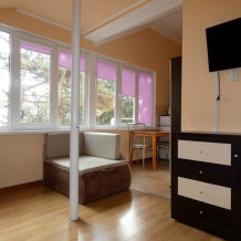 На территории для удобства наших постояльцев, мы оборудовали места для отдыха с беседкой и комплектами парковой мебели, а наш уютный весь утопающий в зелени и цветах двор, не только порадует Вас, но и спасет от летнего зноя. В комнатах и прилегающей к ним территории работает безлимитный Wi-Fi интернет. Для любителей здорового питания есть кухни со всем необходимым для самостоятельного приготовления пищи. А также всегда вкусно и недорого покушать Вы можете в кафе расположенном по соседству.