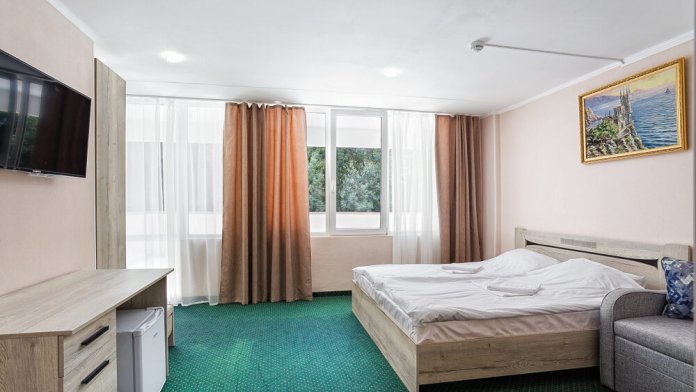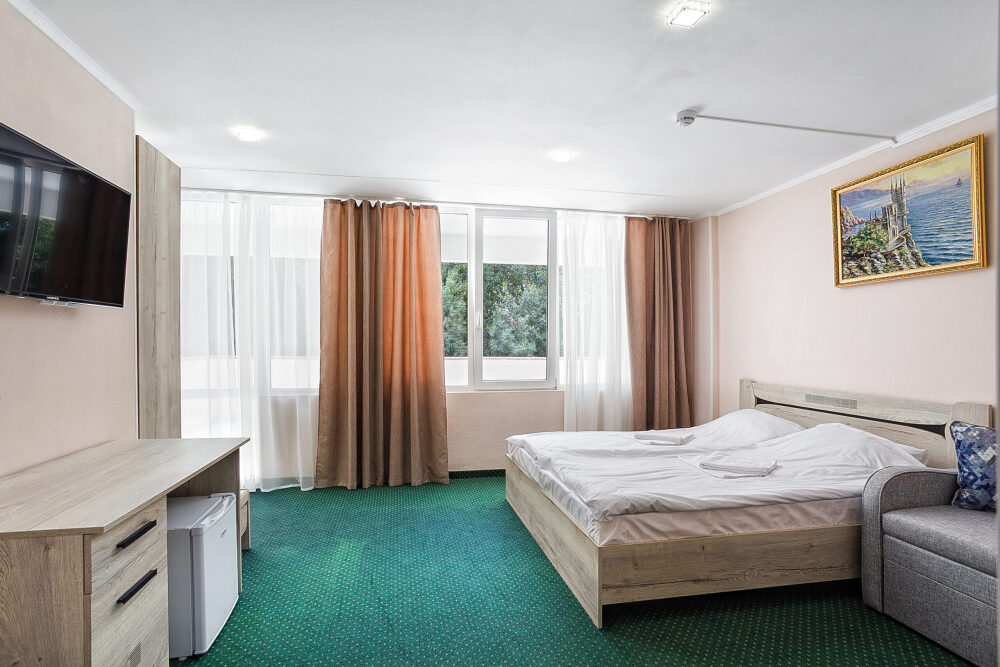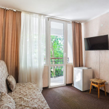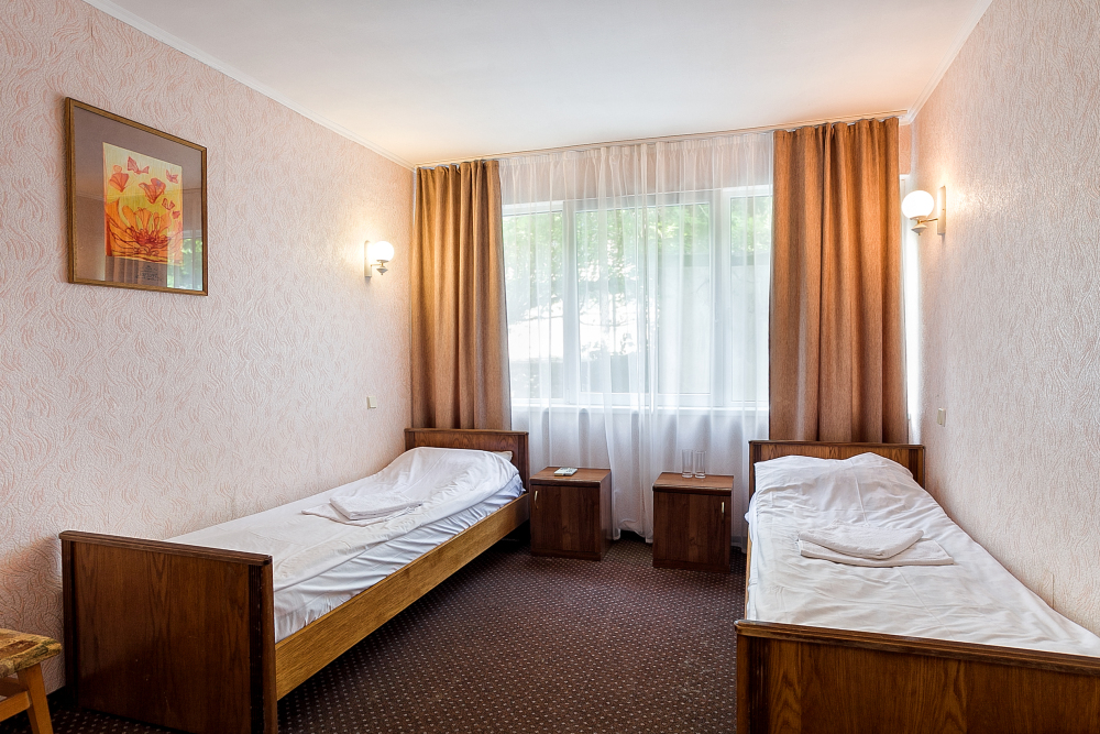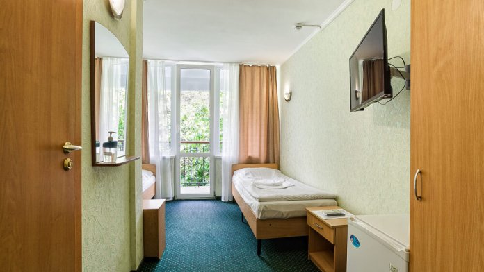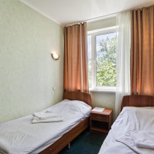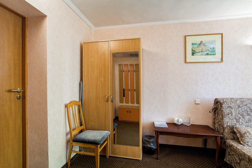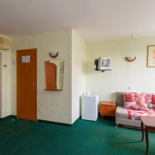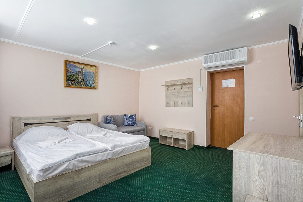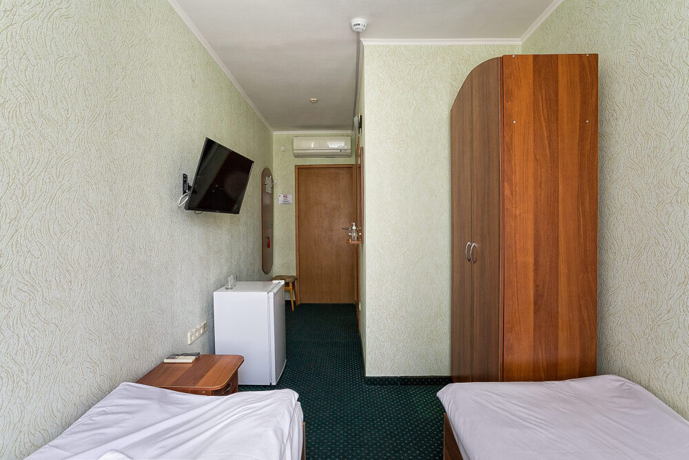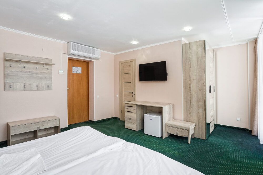 1-комнатный 2-местный номер категории «Стандарт В Плюс» с возможность дополнительного места на раскладушке (окна выходят на северную сторону) оснащен: всеми удобствами (туалет, умывальник, душ), кондиционер, телевизор, холодильник, набор современной мебели, без балкона.