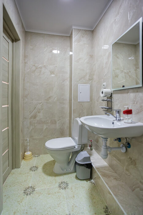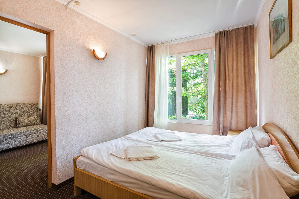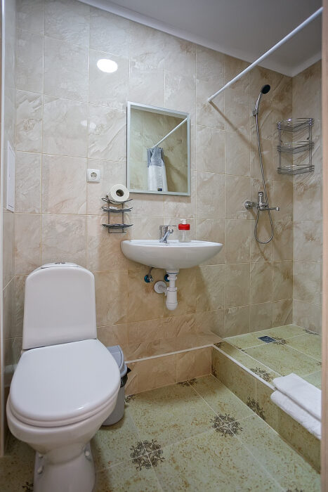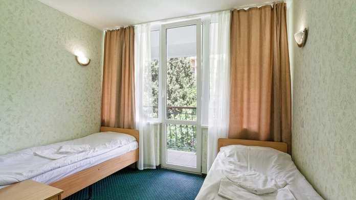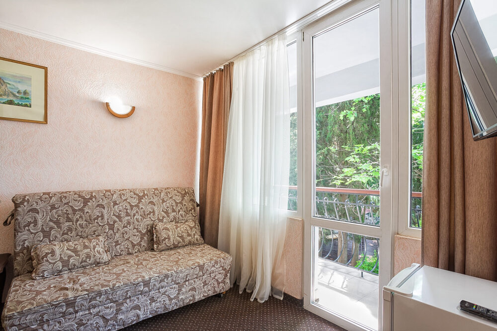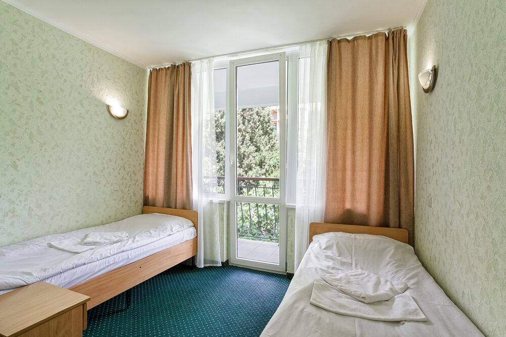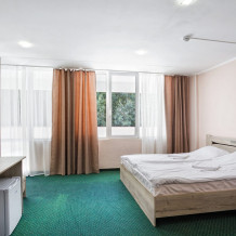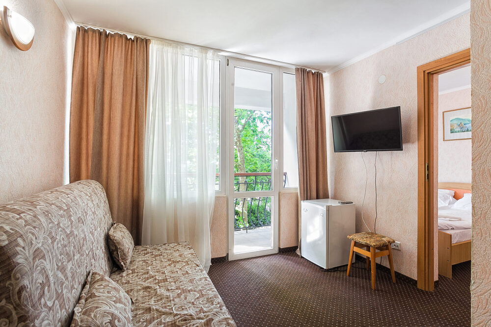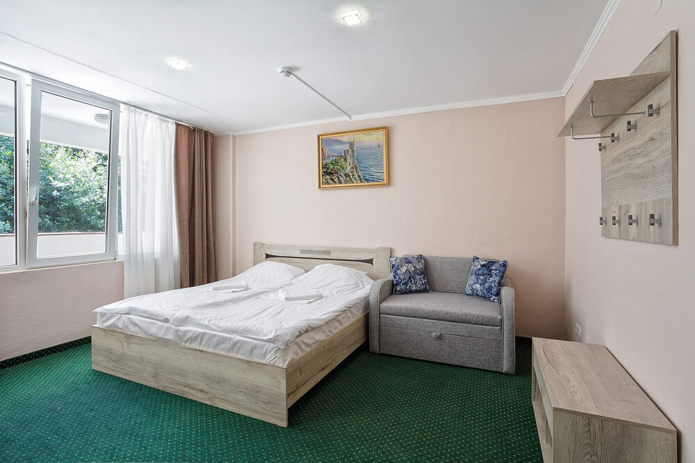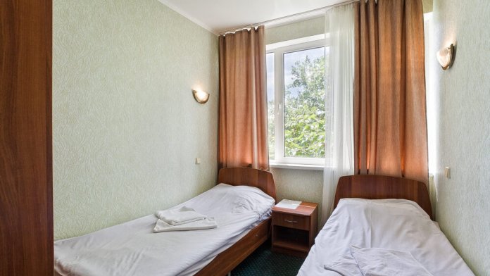 1-комнатный 2-местный номер категории «Стандарт В Плюс» с возможность дополнительного места на раскладушке (окна выходят на северную сторону) оснащен: всеми удобствами (туалет, умывальник, душ), кондиционер, телевизор, холодильник, набор современной мебели, без балкона.