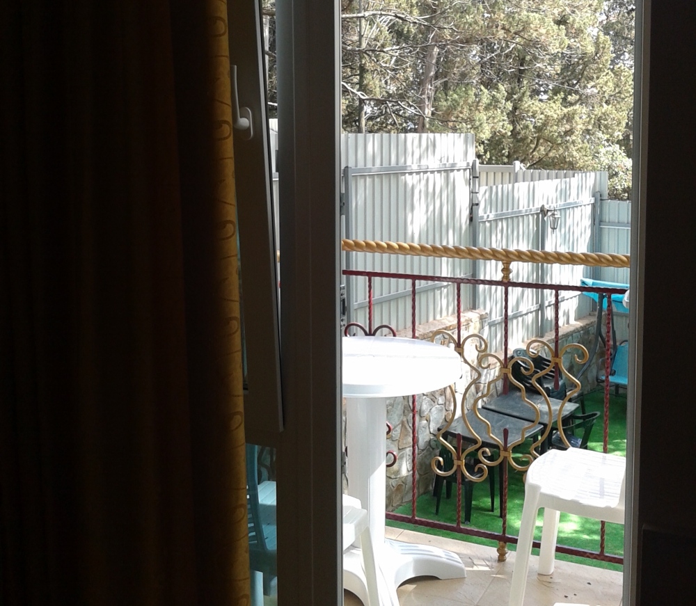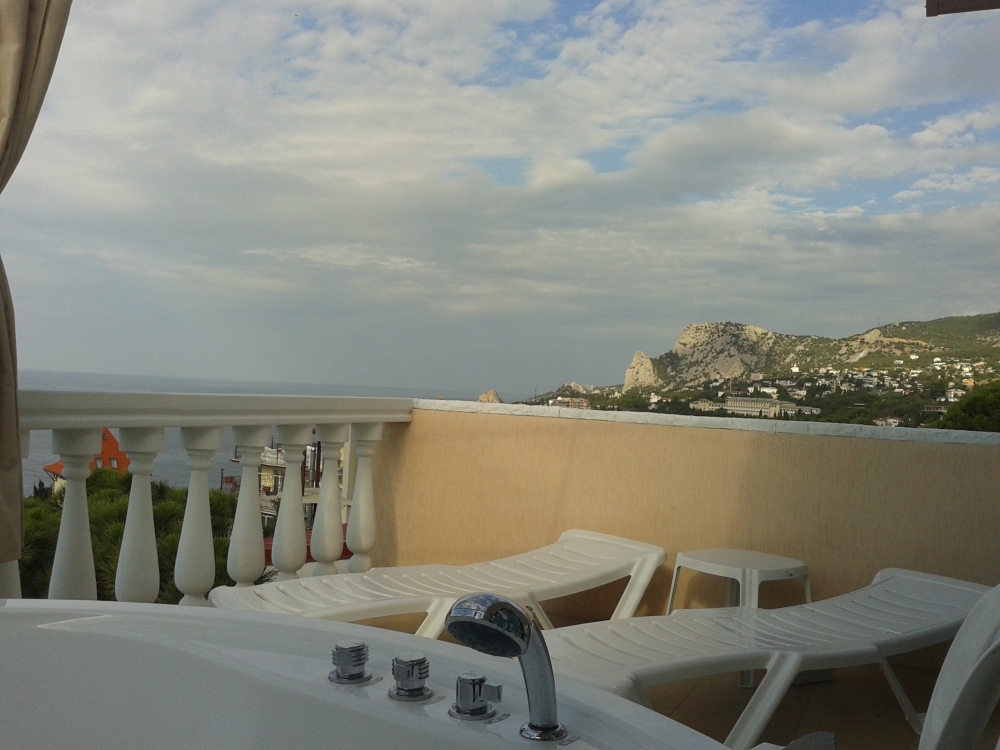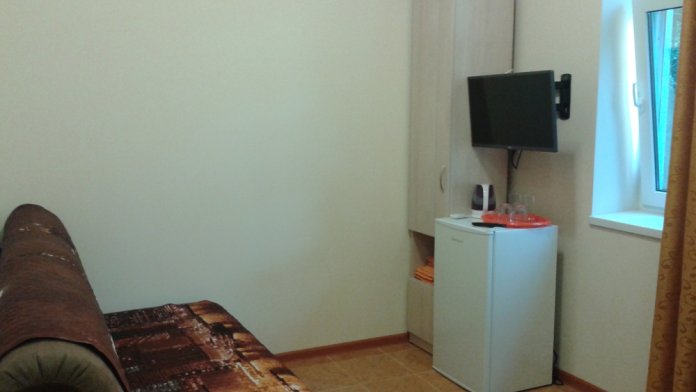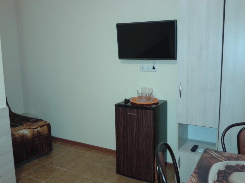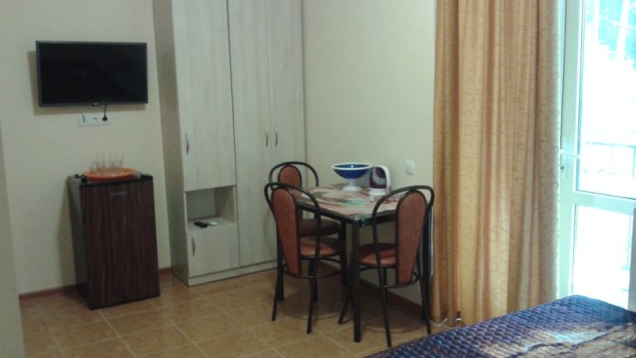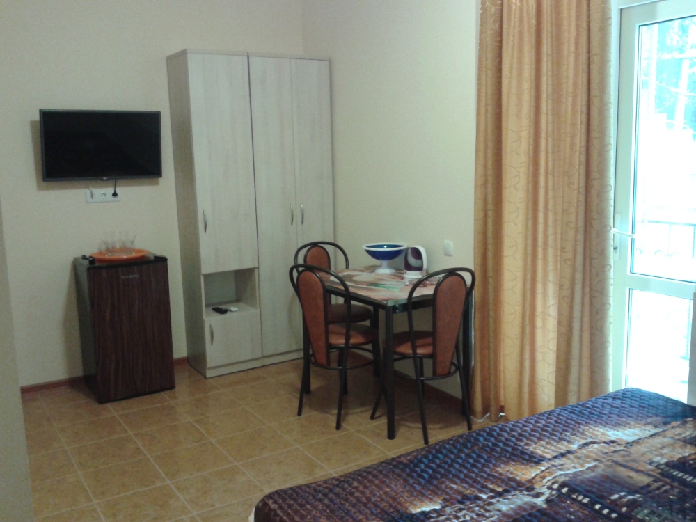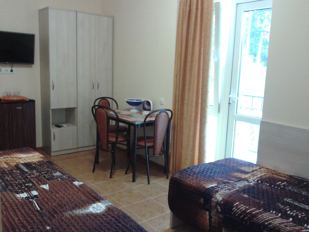 В комнате две односпальные или одна двуспальная кровати, кресло-кровать, шкафы, прикроватные тумбочки, стол, стулья, холодильник, фен, чайник, посуда, TV, интернет, кондиционер, большой балкон, частичный вид на море.