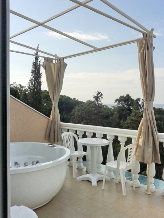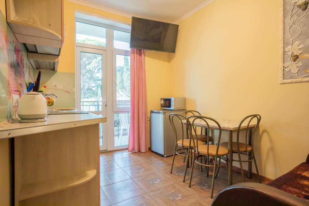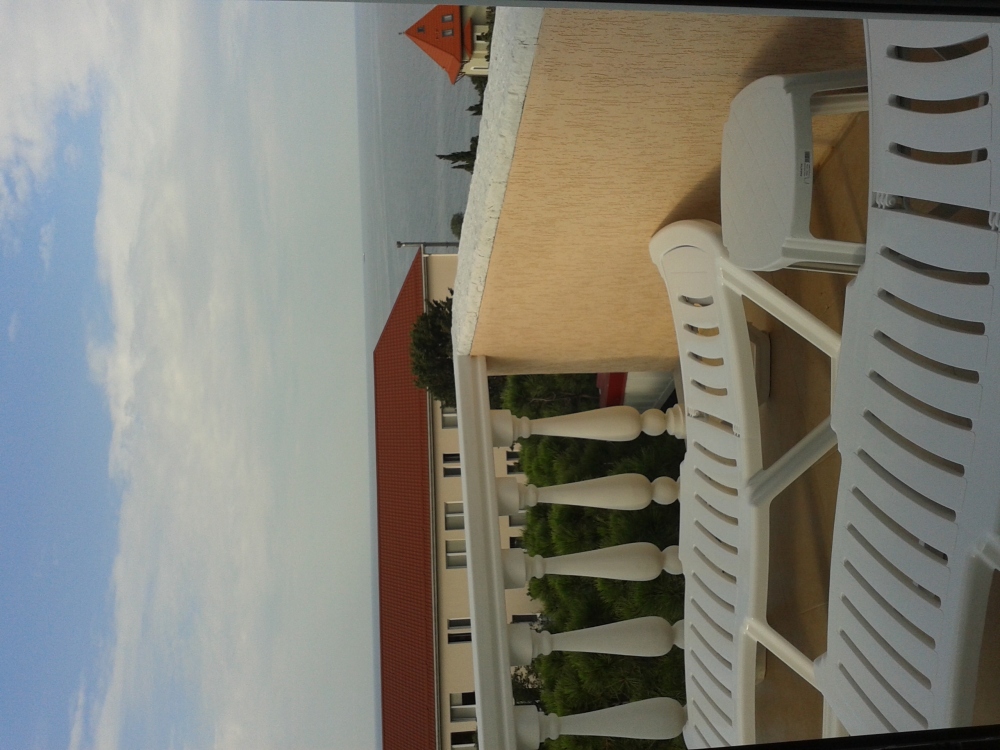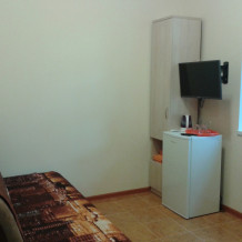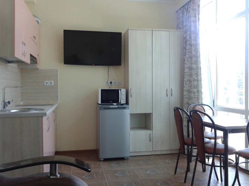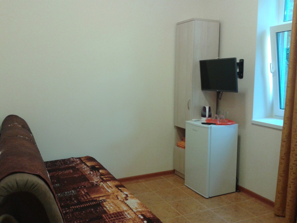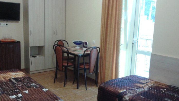В комнате две односпальные или одна двуспальная кровати, кресло-кровать, шкафы, прикроватные тумбочки, стол, стулья, холодильник, фен, чайник, посуда, TV, интернет, кондиционер, большой балкон, частичный вид на море.
