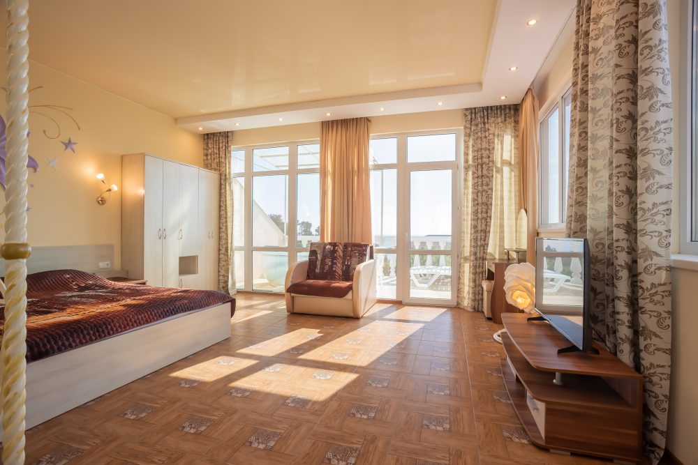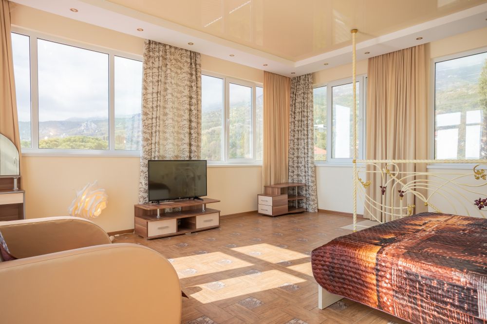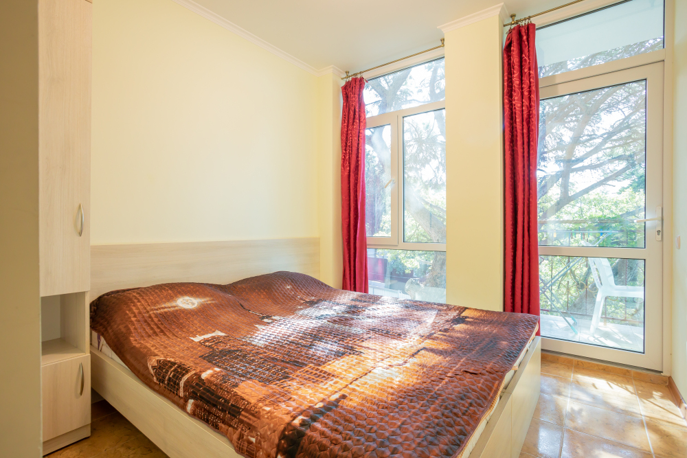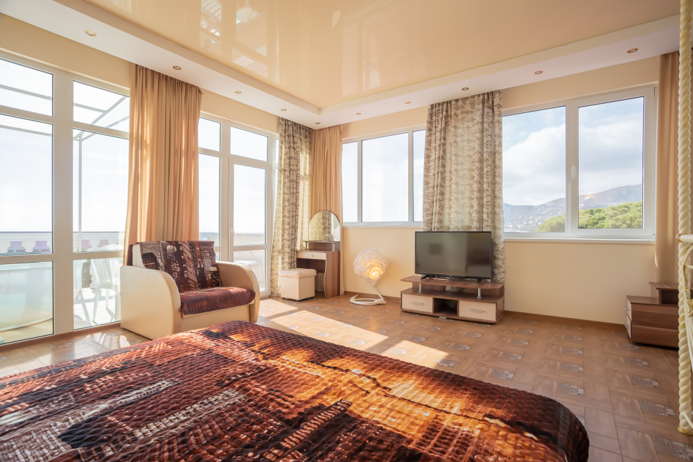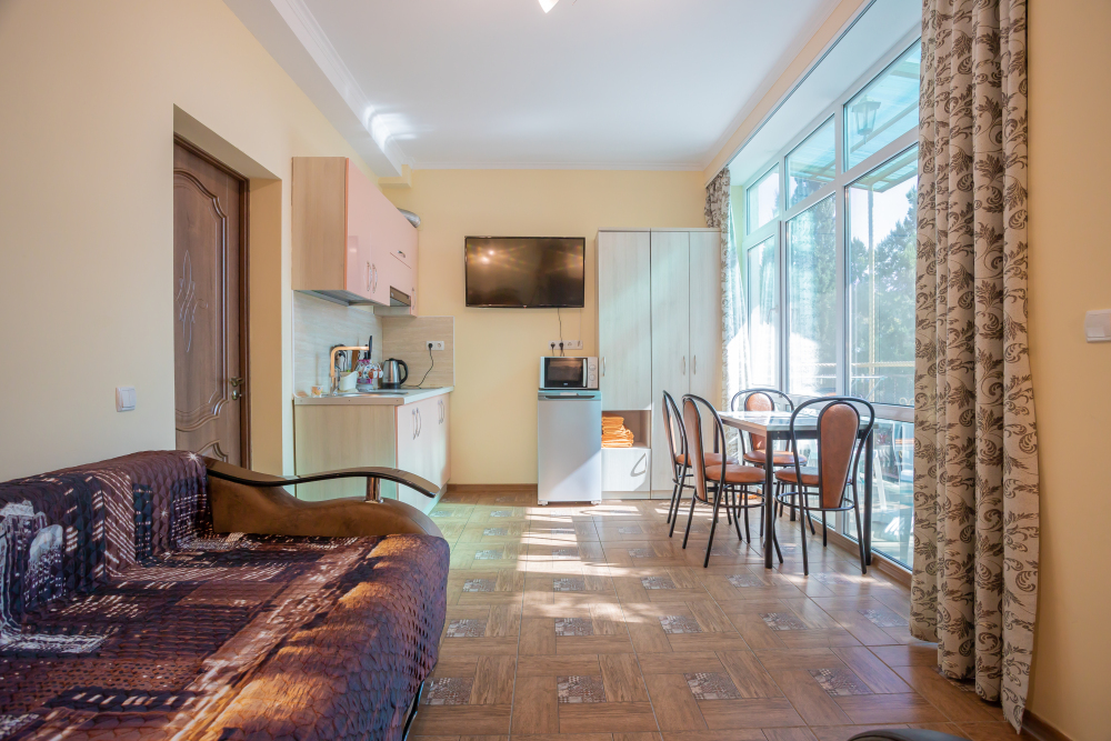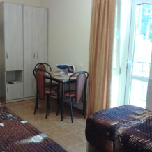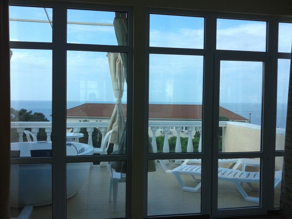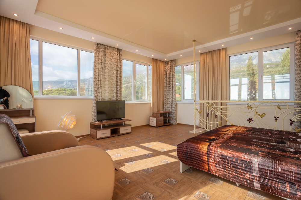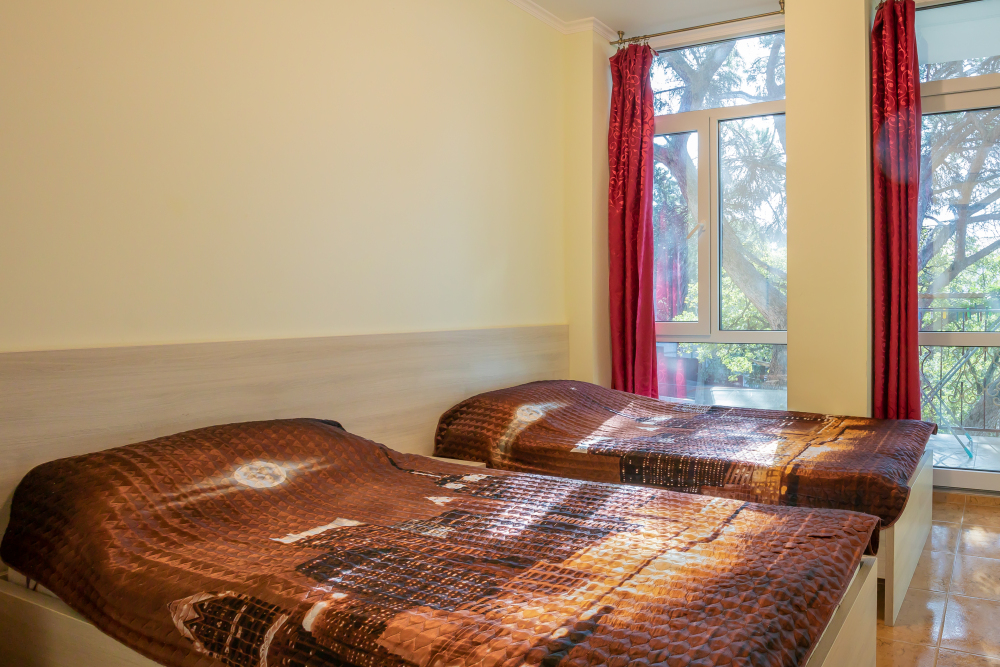 Две изолированные комнаты, в одной комнате две односпальные или одна двуспальная кровати, во второй комнате раскладной диван, шкафы, прикроватные тумбочки, стол, стулья, холодильник, чайник, посуда, фен, TV, интернет, в каждой комнате кондиционер, большой балкон, частичный вид на море или горы.