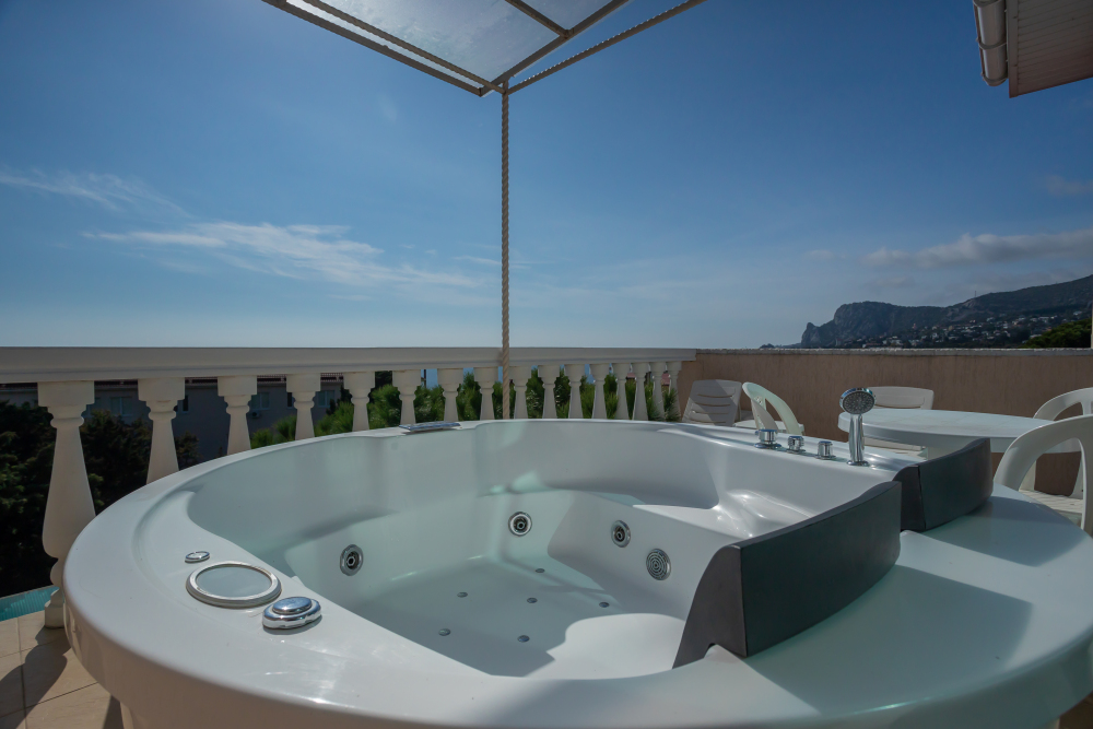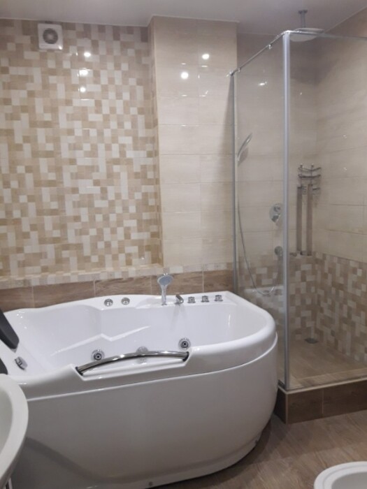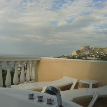 В квартире две изолированные комнаты по двум уровням, большая двуспальная кровать, диван-кровать, 2 кресла-кровати, шкафы, стулья, туалетный столик, прикроватные тумбочки, стол, стулья, кухонный гарнитур, посуда, холодильник, чайник, микроволновка, сейф, кондиционер в каждой комнате, интернет, TV, балкон + большая терраса-солярий с лежаками, джакузи на террасе.