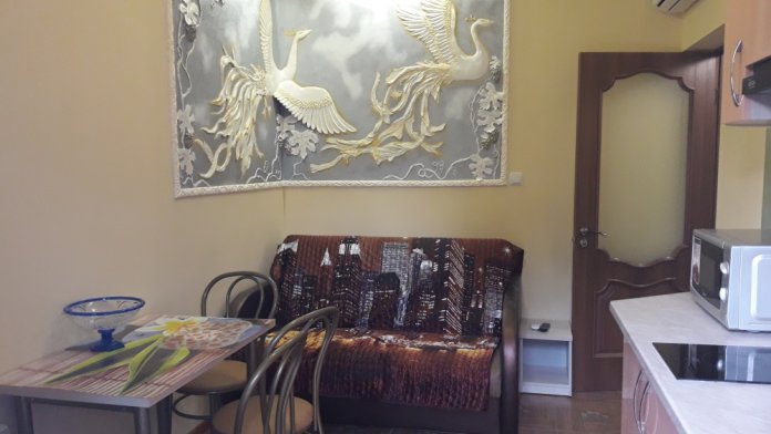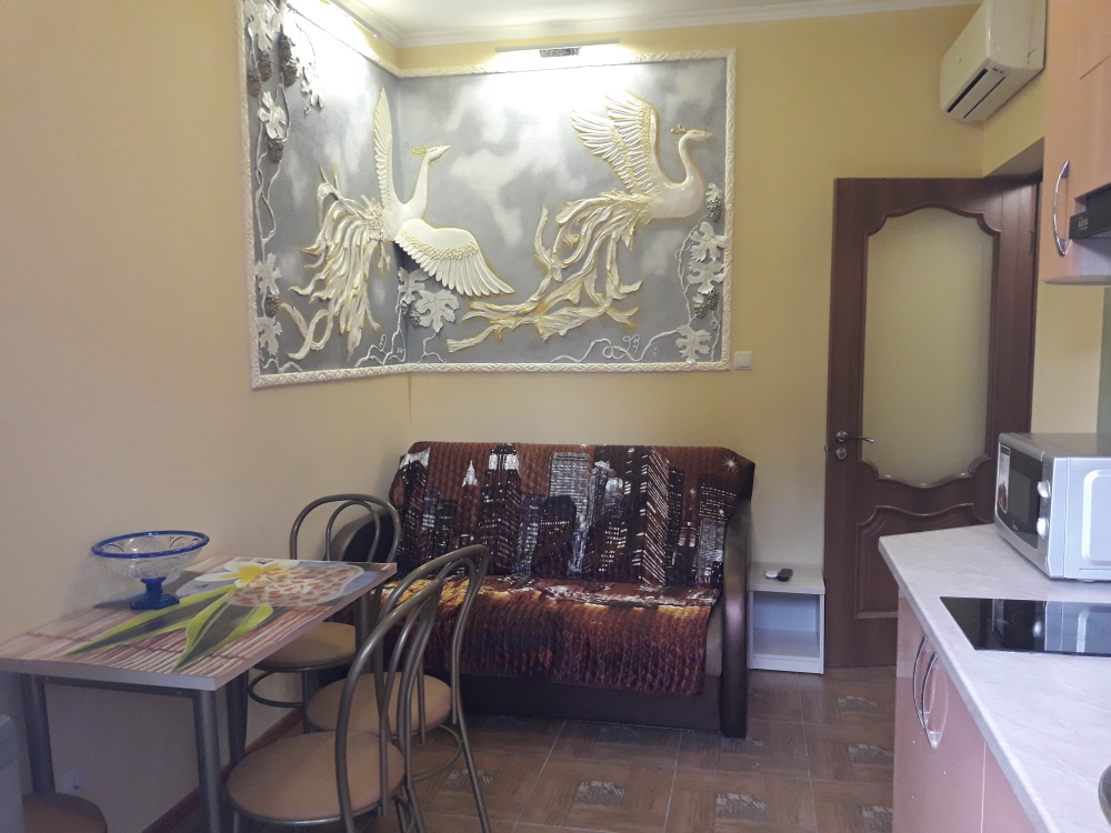 В комнате двуспальная кровать, кресло-кровать, шкафы, прикроватные тумбочки, кухонный гарнитур, посуда, стол, стулья, холодильник, фен, чайник, TV, интернет, кондиционер, большая лоджия с лежаком.