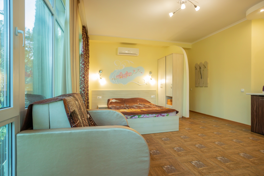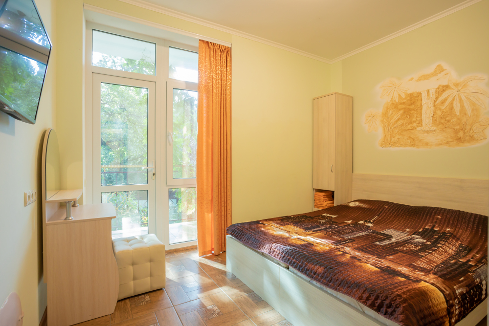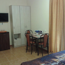 В комнате две односпальные или одна двуспальная кровати, кресло-кровать, шкафы, прикроватные тумбочки, стол, стулья, холодильник, фен, чайник, посуда, TV, интернет, кондиционер, балкон.